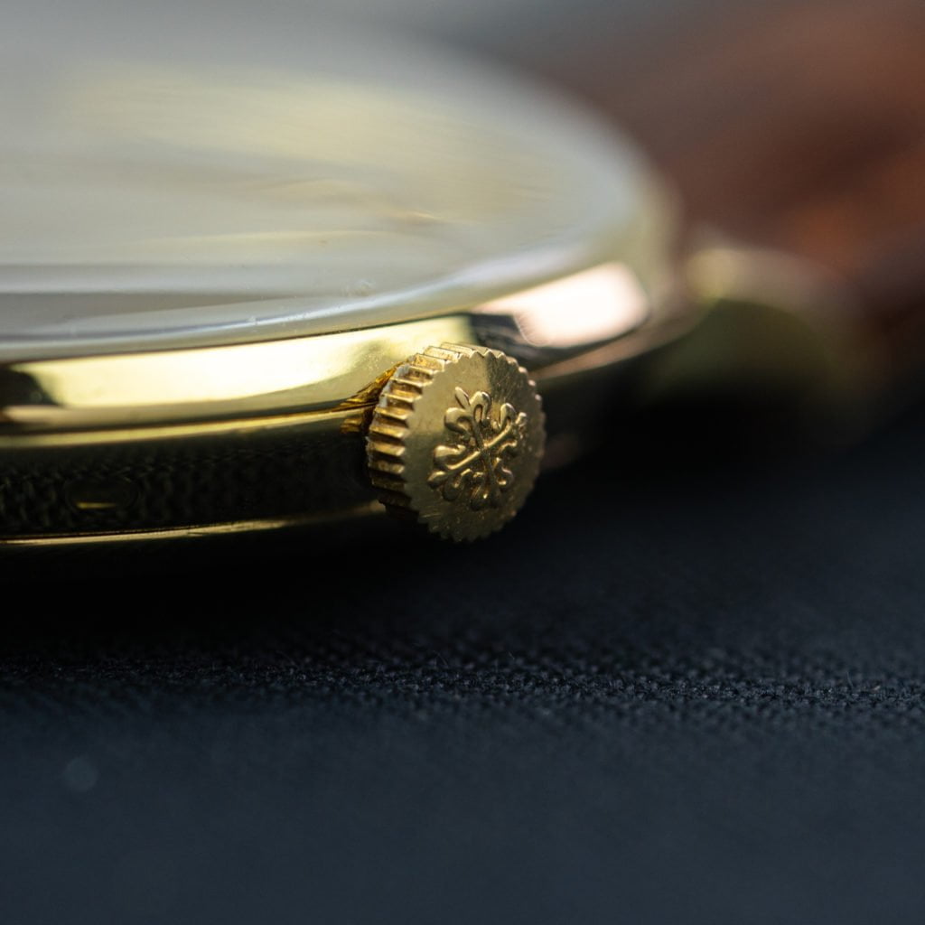 Certain occasions call for a watch that is elegant, clean, and of the highest possible quality. One watch takes the proverbial crown in that category: the Patek Philipe Calatrava.In 1932, Patek introduced the reference 96 Calatrava dress watch. Named after the Calatrava cross, the symbol of the medieval Spanish Military Order of Calatrava and Patek Philippe's corporate emblem, this watch is the blueprint for every dress watch that came after it.Putting practicality and functionality front and centre, a Calatrava is traditionally a time-only watch with an understated round case. This 3420 from the early 1960s sports a 34 mm 18k yellow-gold case with elegant short downturned lugs.The classy silvery dial features thin 18k yellow-gold indices with matching needle hands and an elegant de-central seconds indicator at the 6 o’clock position. A cool detail, two Greek sigmas (‘σ’), are hidden at the bottom of the dial. These dial markings were used by select Swiss watchmakers (namely Patek Philippe, Rolex, Vacheron Constantin, and IWC) in the 1970s and 1980s to indicate the use of 18k gold on the dial.The reference 3420 is powered by Patek Philippe's ultra-thin antimagnetic caliber 27-AM 400 manual winding movement, giving the watch an elegantly slim profile. We’ve paired the watch with a lovely brown alligator-leather Patek Philippe strap.