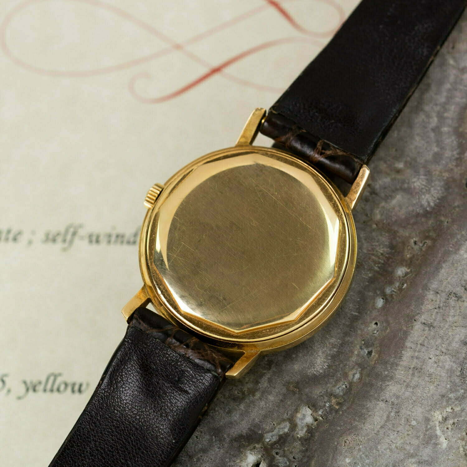 This ref. 3445 dates back to 1970 and is powered by Patek’s beautifully finished ultra-thin caliber 27-460 automatic movement with an 18k yellow gold winding rotor. The watch comes on a brown alligator leather strap with an unsigned 18k yellow gold buckle, and is accompanied by an extract from the Patek Philippe archives.