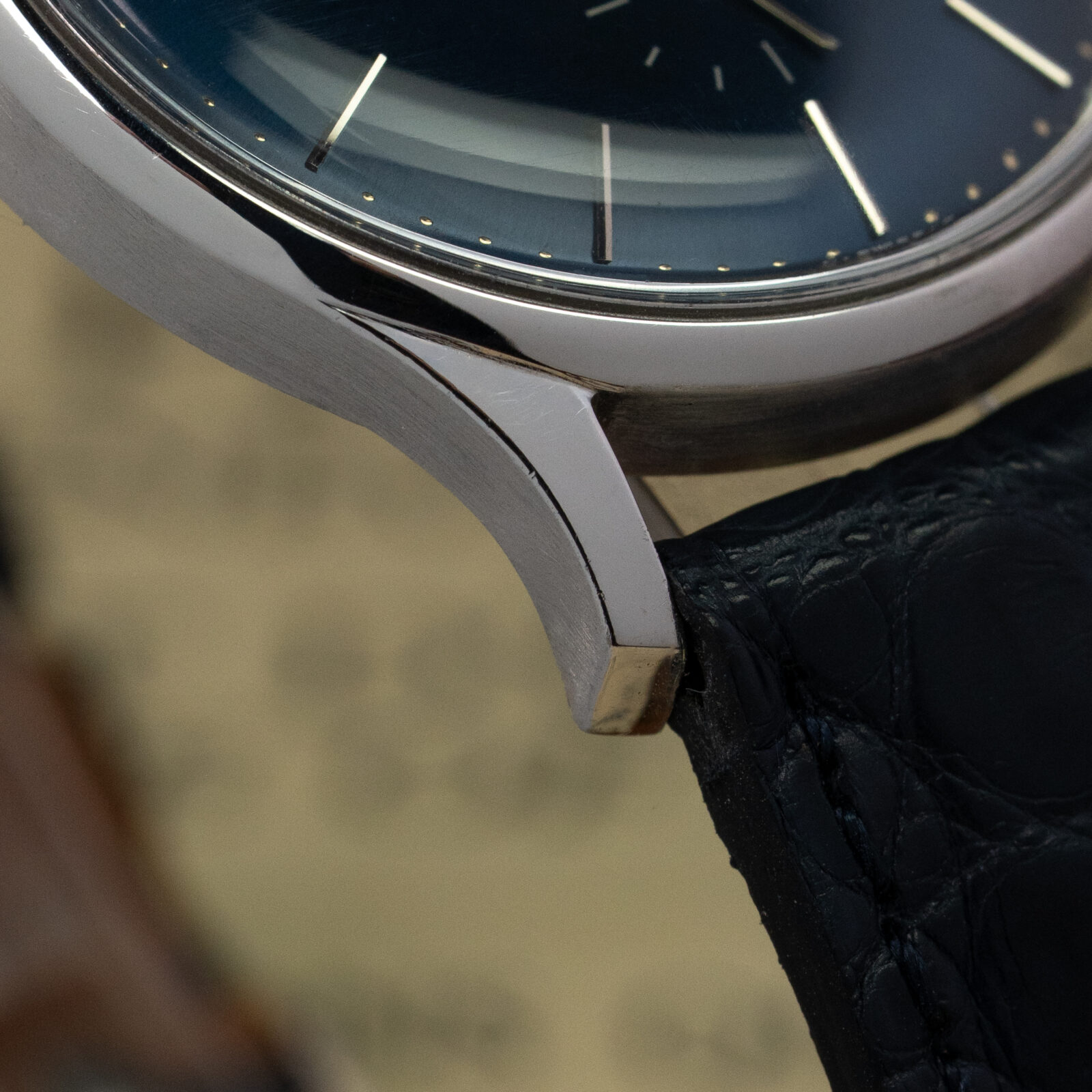 Fitted with a complementary blue strap and accompanied by its original white gold buckle, this example has been exceptionally well preserved. It comes complete with its original box and papers. Dating back to the 1980s, it is remarkable to consider that this piece is approaching 50 years of age; testament not only to its timeless design but also to its outstanding condition.