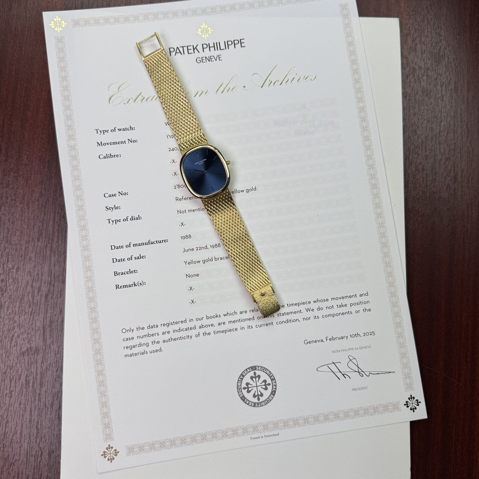 The deep blue sunburst dial, unique to the Ellipse line, radiates a quiet sophistication, changing subtly with the light. Framed in a warm yellow gold oval case and paired with an integrated gold bracelet, the watch wears like jewelry – elegant, refined, and unmistakably Patek.