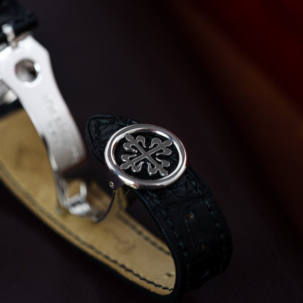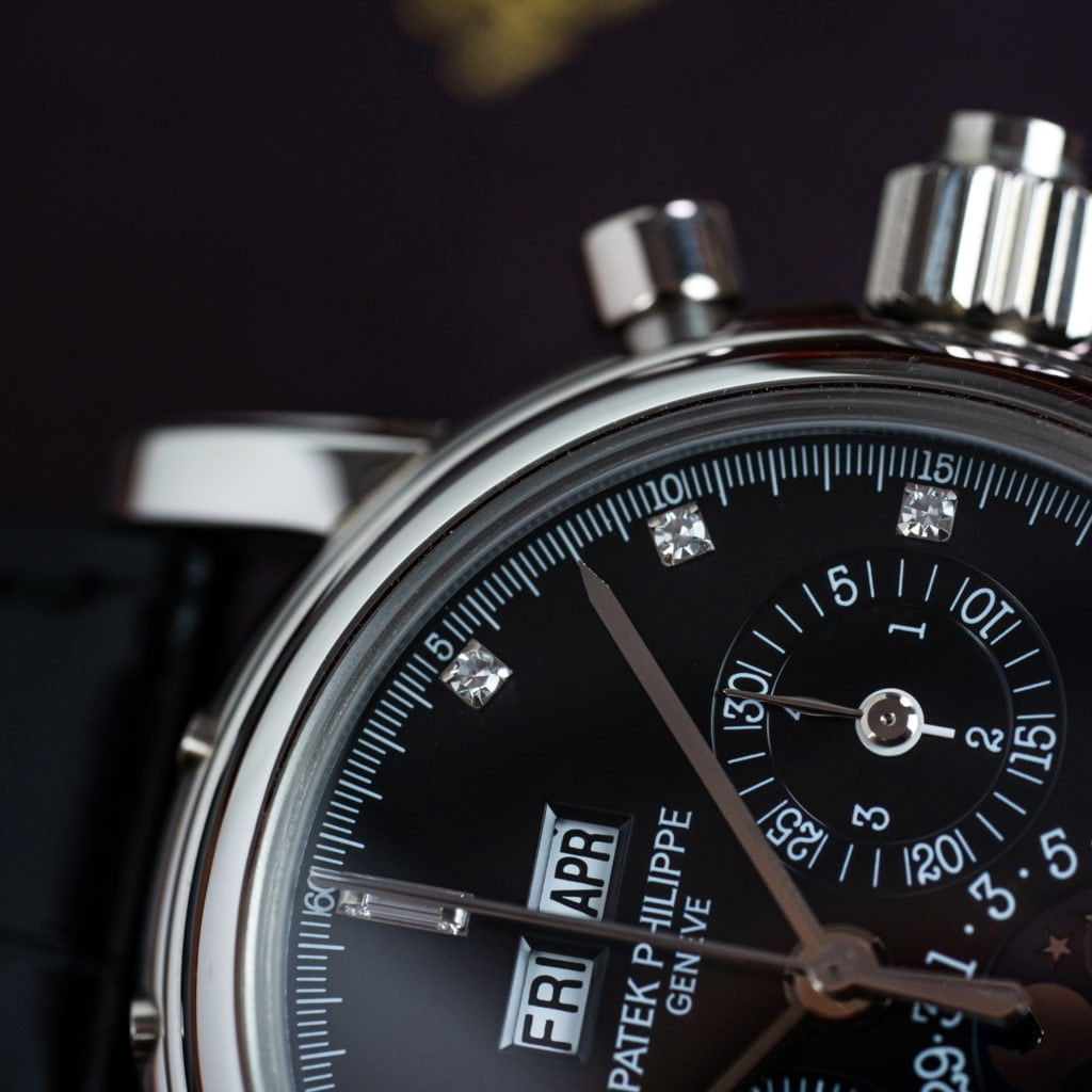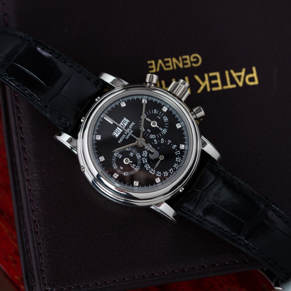 The complications are displayed through a set of windows and sub-dials. Two apertures at the 12 o’clock position reveal the day and month mechanism. The recessed sub-dial at the 9 o’clock position displays a running seconds as well as a 24-hour hand while the recessed sub-dial at the 3-hour position incorporates a 30-minute chronograph counter and a leap year indicator. Finally on the lower sub-dial we find a charming moon phase indicator, which is surrounded by a date indication. While most 5004's have dials with Arabic numerals on the hour positions (and sometimes baton markers), this rare black dial variant features factory-set diamond indices instead.