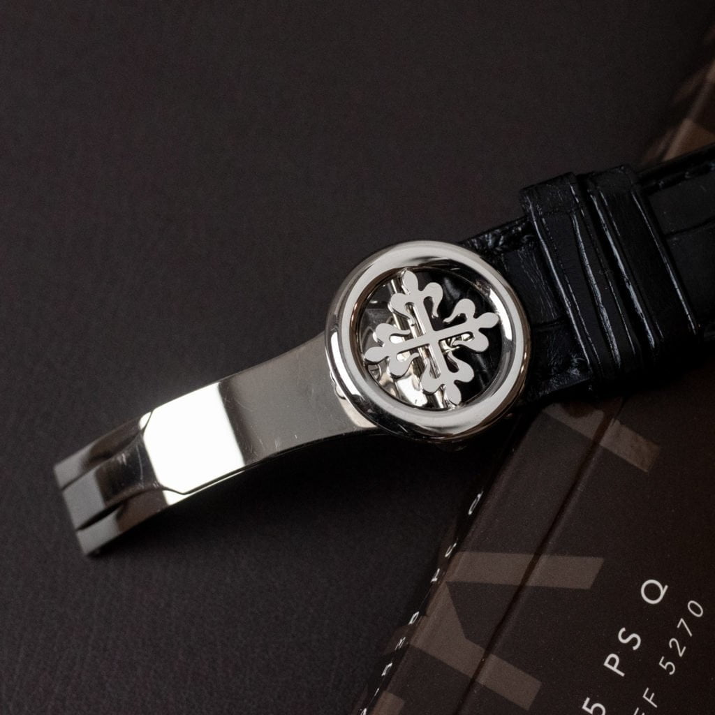 Every once in a while we run out of superlatives to describe a watch. On the other hand, do we need to say more than that this is the first-ever Patek Philippe Grand Complications with a completely in-house movement?Patek perpetual calendar chronographs are among the most coveted and collectible watches one can get. These ultra-complicated watches have been an integral part of the Patek catalogue ever since the legendary ref. 1518 was introduced in 1941. The introduction of the newest iteration, the ref. 5270, in 2011 was an important moment since it was the first Patek perpetual calendar chronograph to use a movement that was designed and manufactured from start to finish by Patek Philippe.This 5270G from 2011 features a large 41mm 18k white gold case that gives plenty of space for the dial to shine. This 5270G-001 is a first-series execution that was only made in 2011 and 2012. These first-series dials have no tachymeter scale, instead showing a track with 1/5th of a second hash marks so that the chronograph hand can be read as accurately as possible and a second inner closed railroad minute track. These first-series dials also feature unique black oxidized-gold feuille (leaf) hands and matching black oxidized-gold baton markers, which were changed to regular white gold hands and markers on the second-series dials. These details give these early executions a sleek look and superb dial legibility, compared to the more classic and cluttered aesthetics of later variations.The dial lay-out is a testament to timeless design. Two rectangular apertures below the 12 o’clock position reveal the day and month, while the 30-minute totalizers and running seconds are displayed on the sub-dials at the 3 and 9 o’clock positions, respectively. Meanwhile, the third sub-dial at the bottom half of the dial reveals a lovely moonphase indicator surrounded by the date function. FInally, two small apertures at the 4:30 and 7:30 positions reveal the leap-year indicator and day/night indicator, respectively.As the watch is turned upside down, the display case back gives way to the superlatively hand-finished in-house manual winding split-seconds caliber. Just one glance at all the intricate layers of this movement explains why it took Patek so many decades to release its first in-house chronograph movement.Even though the yellow gold, pink gold, and platinum versions of the 5270 are still part of the Patek catalogue, the white gold 5270G was discontinued completely in 2017. That makes this first-series execution in white gold from the first year of production all the more special.The watch comes on a black alligator leather Patek strap with an 18k white gold Patek deployant buckle, as well as the original box and papers.