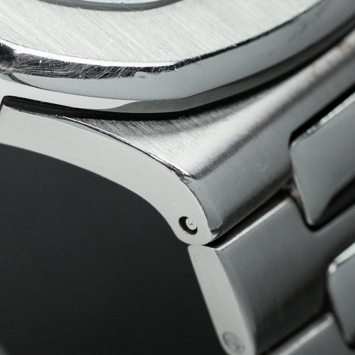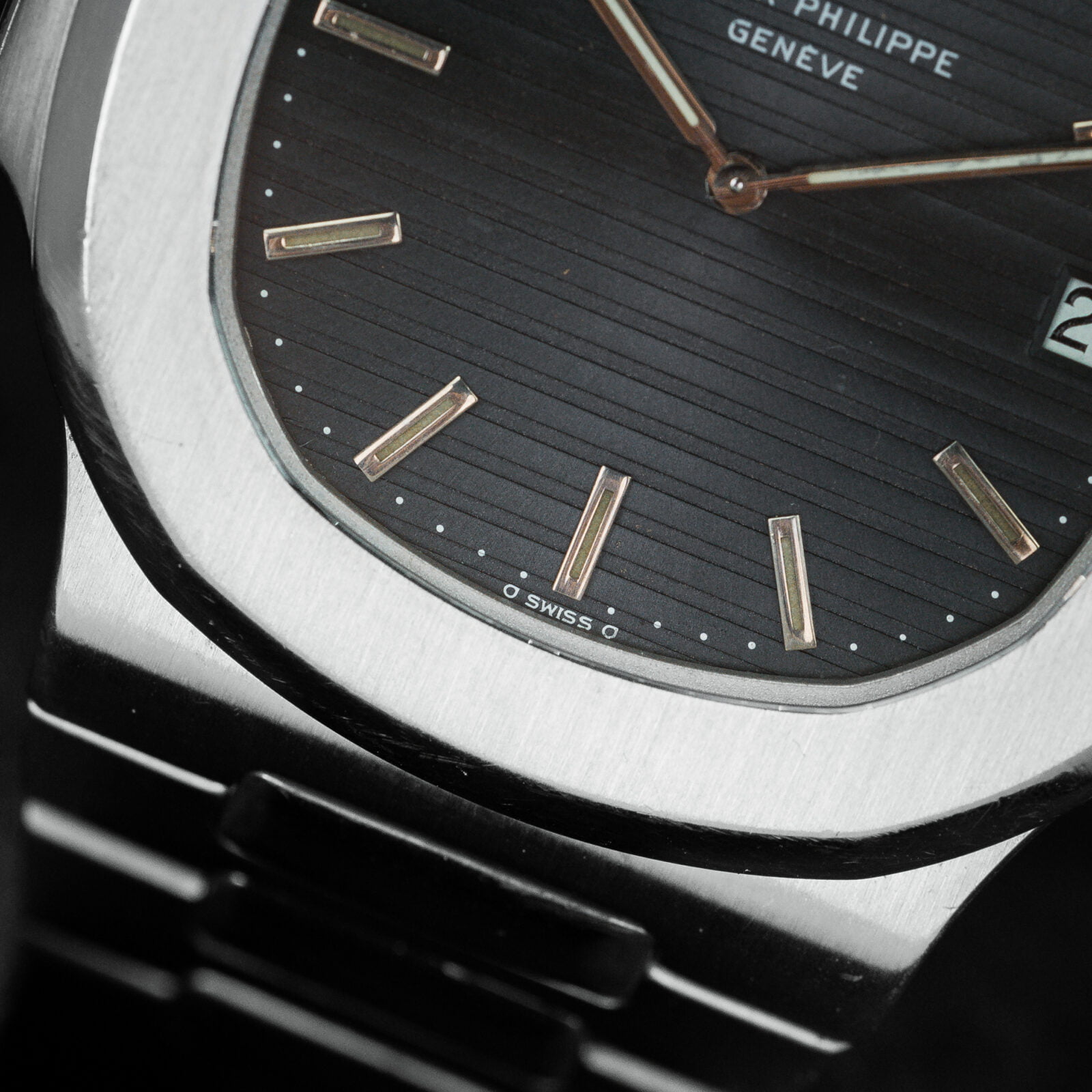 The dial is most certainly iconic. Showcasing once again, they are taking it a step further (in terms of finishing) than sport watch counterparts from other brands. The embossed bars on the dark surface -or "ribbed" as the maison describes it- adds grandeur to an otherwise straightforward dial lay-out.. The applied indices are baton shaped, and just like the hands, are filled with tritium as luminescent compound. The absence of an hour markers at the 3 o'clock position allows the date function to be present. Even though the color is always described as "Matte black" on the extract, in reality it is so much more rich; ranging from dark blue to anthracite. This is the earliest dial configuration featuring the dot markers for the minute track, also referred to as "type 1 Dot dial;" by Nautilus scholar Mstanga.