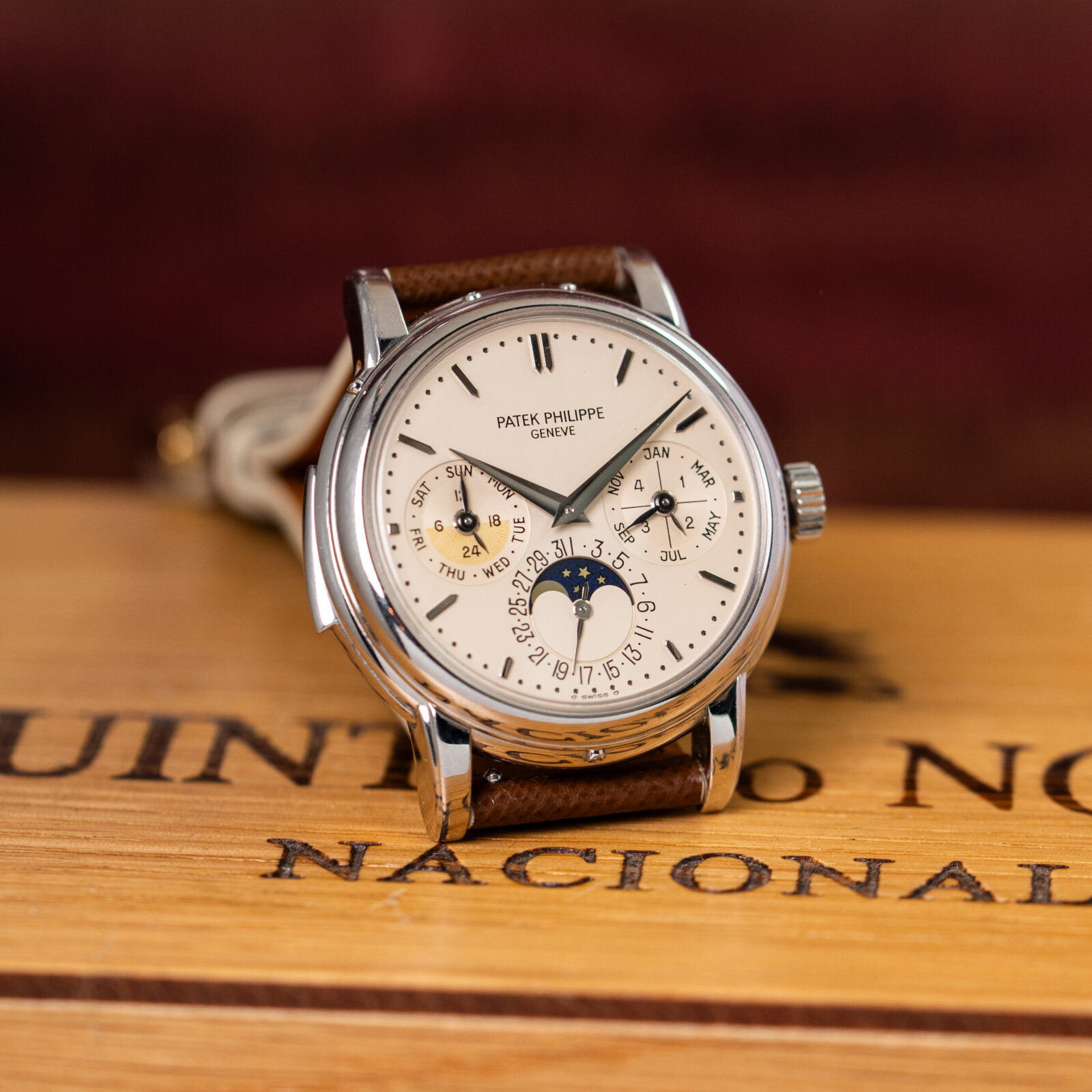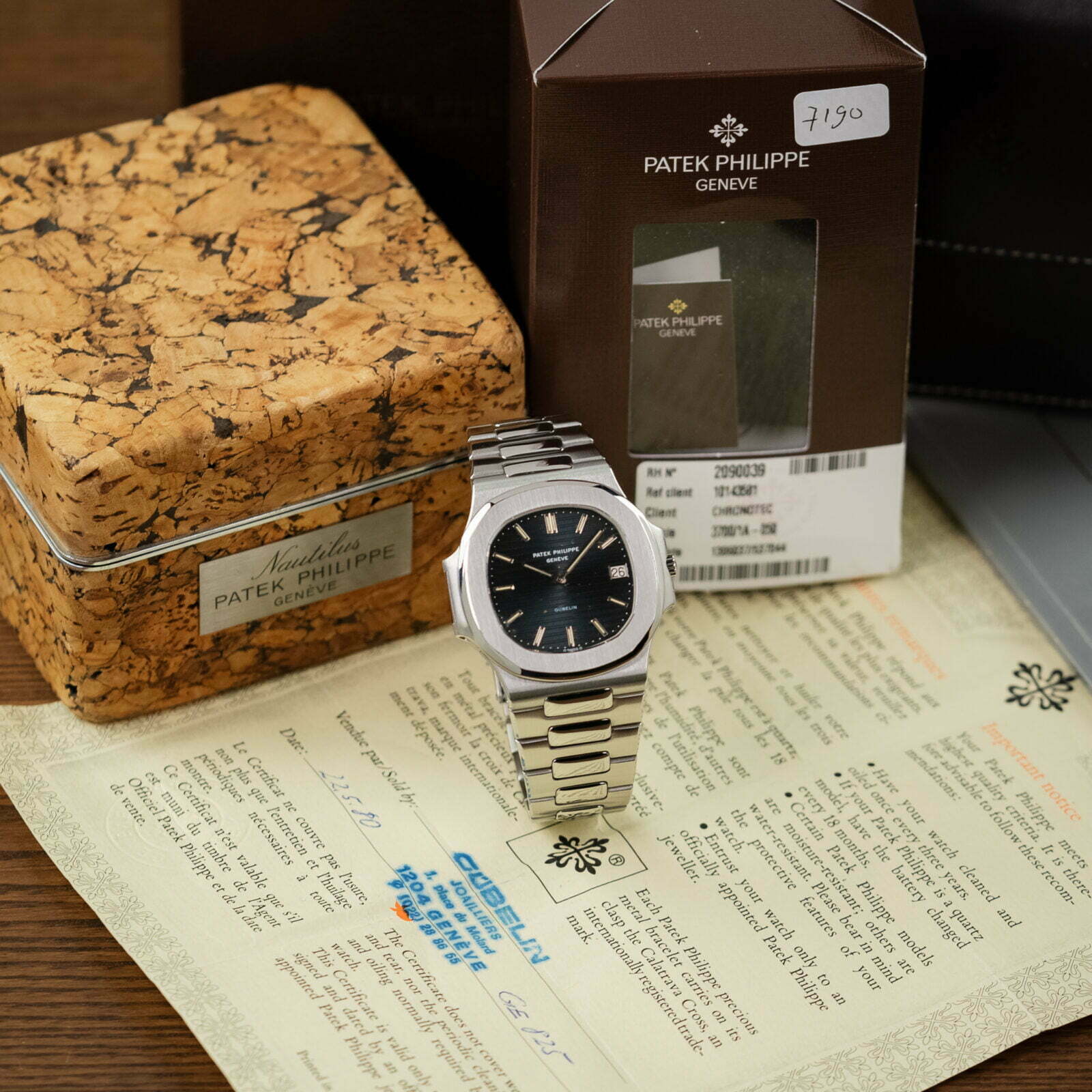 We are proudly presenting this 3700 with the original and sought-after "cork box", a cult item that easily adds 15000 euro to the value. The cherry on the cake is obviously the retailer stamp of the Swiss powerhouse. The watch furthermore comes with the papers (confirming the sale on 22-5-80) and booklet from Gübelin. It has just received a full spa treatment at Patek Philippe so it comes with an internationally covered warrantee on the functioning. To emphasise once more the Nautilus isn't just a utility watch, Patek Philippe relied on one of the thinnest and finest automatic movements. Cal. 28-255C is based on the renowned 920 from Jaeger-LeCoultre.