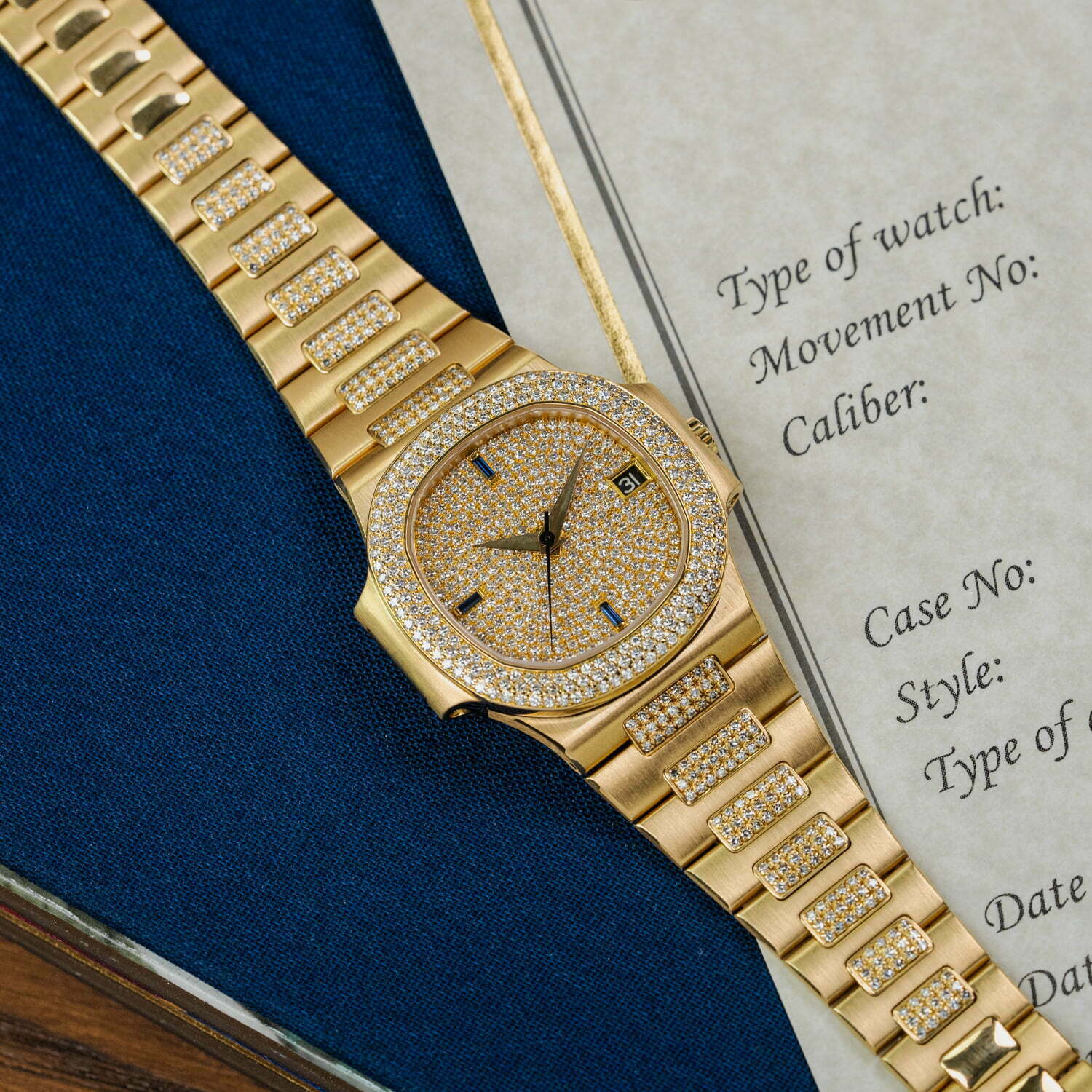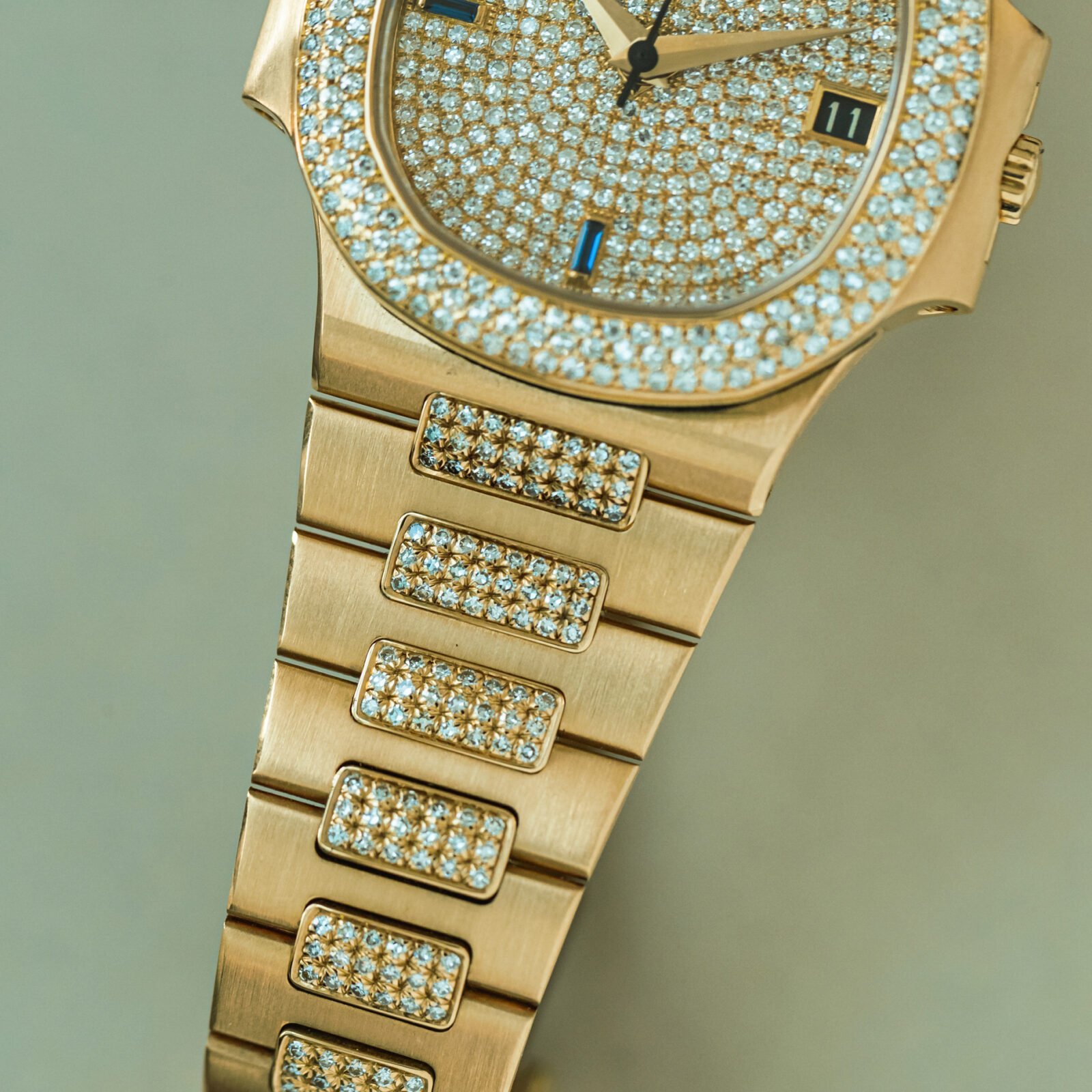 The ref. 3800/10x subseries of the mid-size Nautilus features exquisite gem-set models. Reference /105 is characterised by a 3-row diamond bezel and diamonds in the centrelink of the bracelet. features. Out of only a handful -of this execution- publicly known, only 3 have a fully pave-set dial. The quarters are set with baguette sapphires, bringing perfect balance to the dial, alongside the blue date at 3 o'clock. Meanwhile, the broad faceted dauphine hands inject the watch with a hint of 1950s elegance.