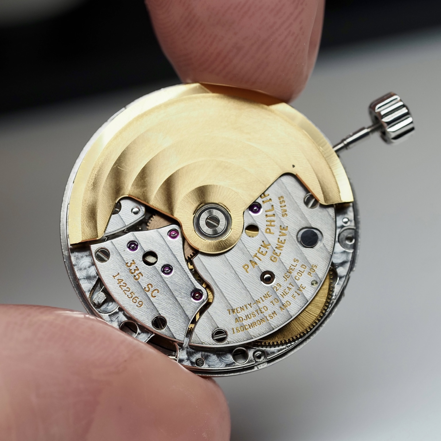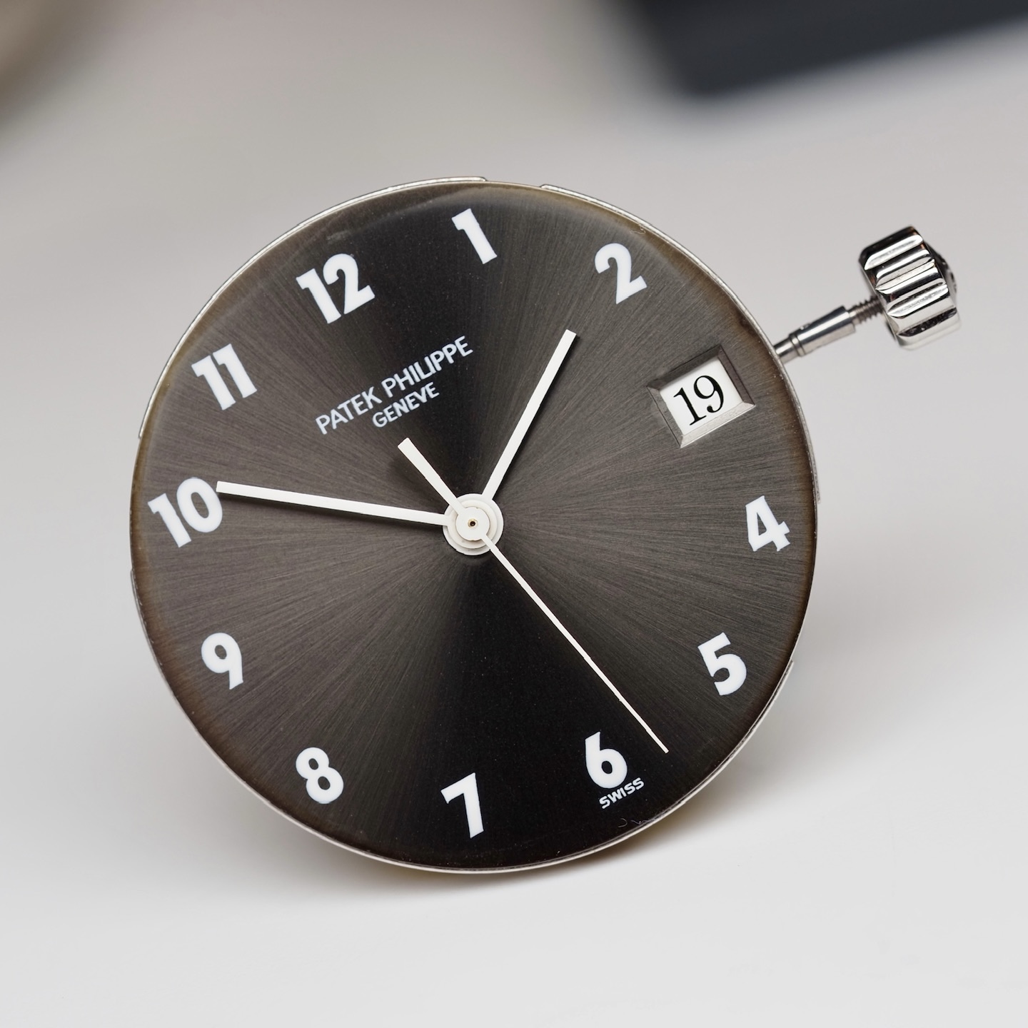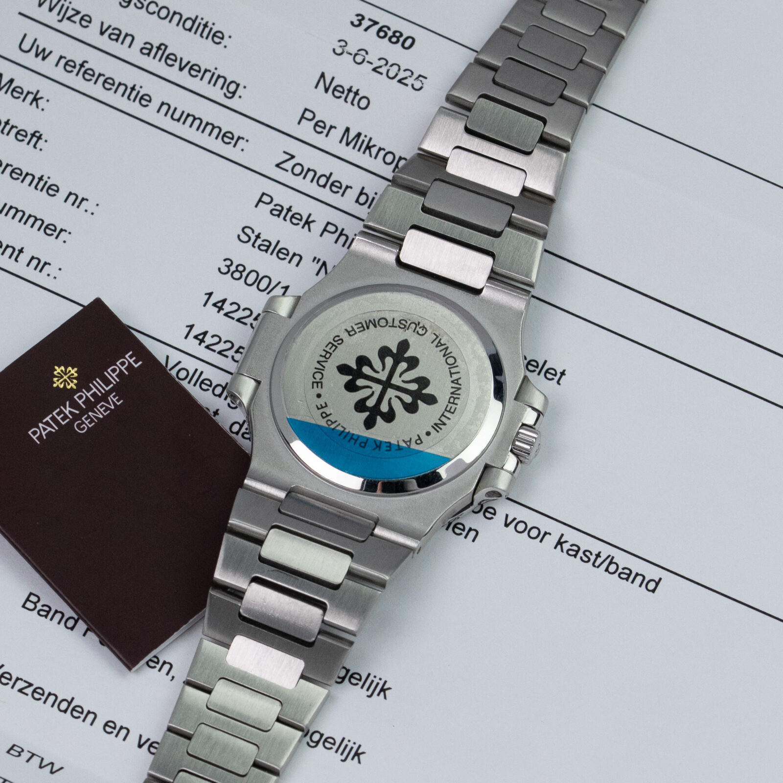 During its earlier service in 2013, by mister Banbery himself, the bracelet was replaced for this newer one. But more importantly, it features a very uncommon dial. Only a handful examples have been sold with this so-called "telephone" execution. Due to the stark contrast between the vivid white hands with dito Arabic numerals and grey sunburst background, we suppose this lay-out was used for people who requested a legible dial. Historically it is not uncommon for Patek to come up with solutions for clientele with bad eyesight.