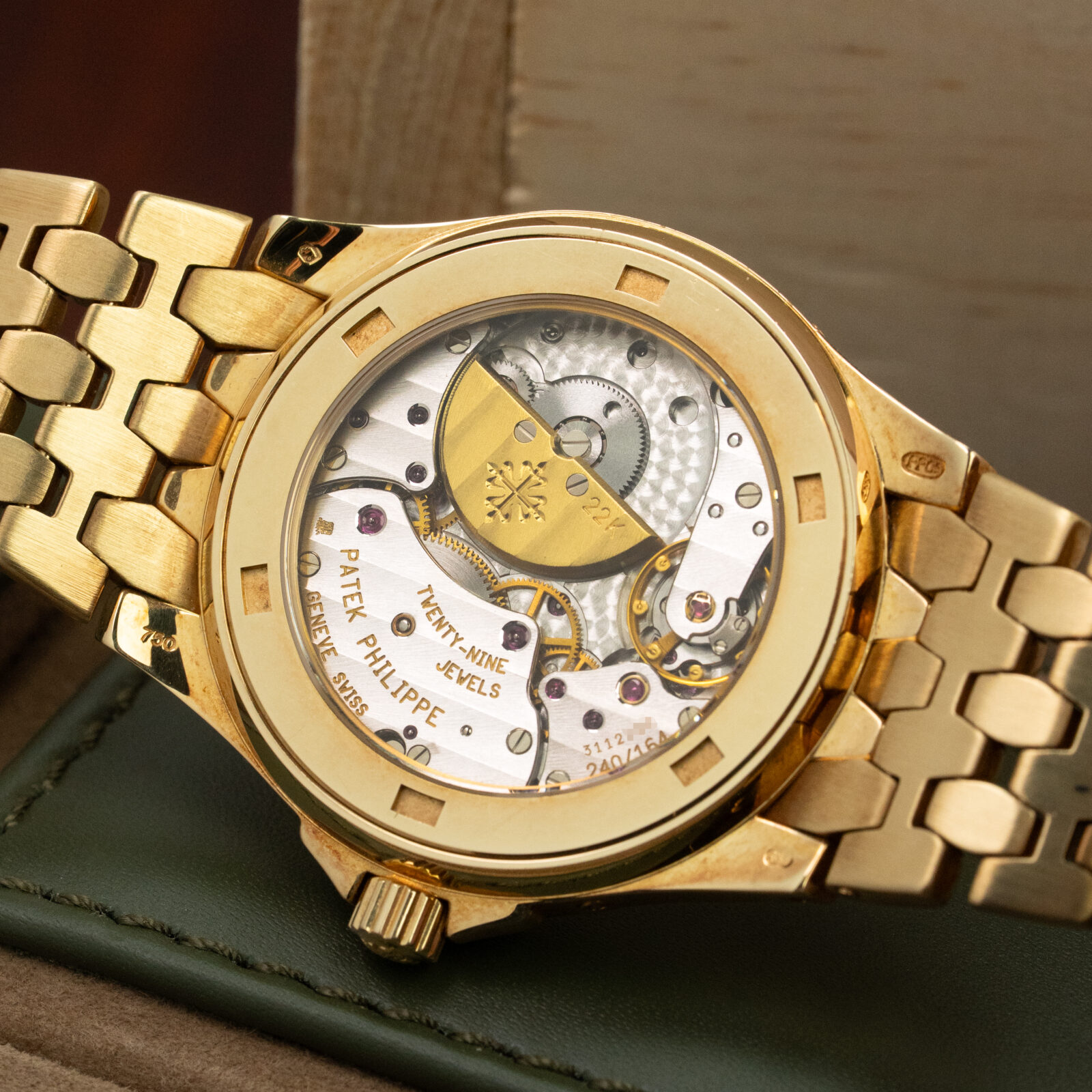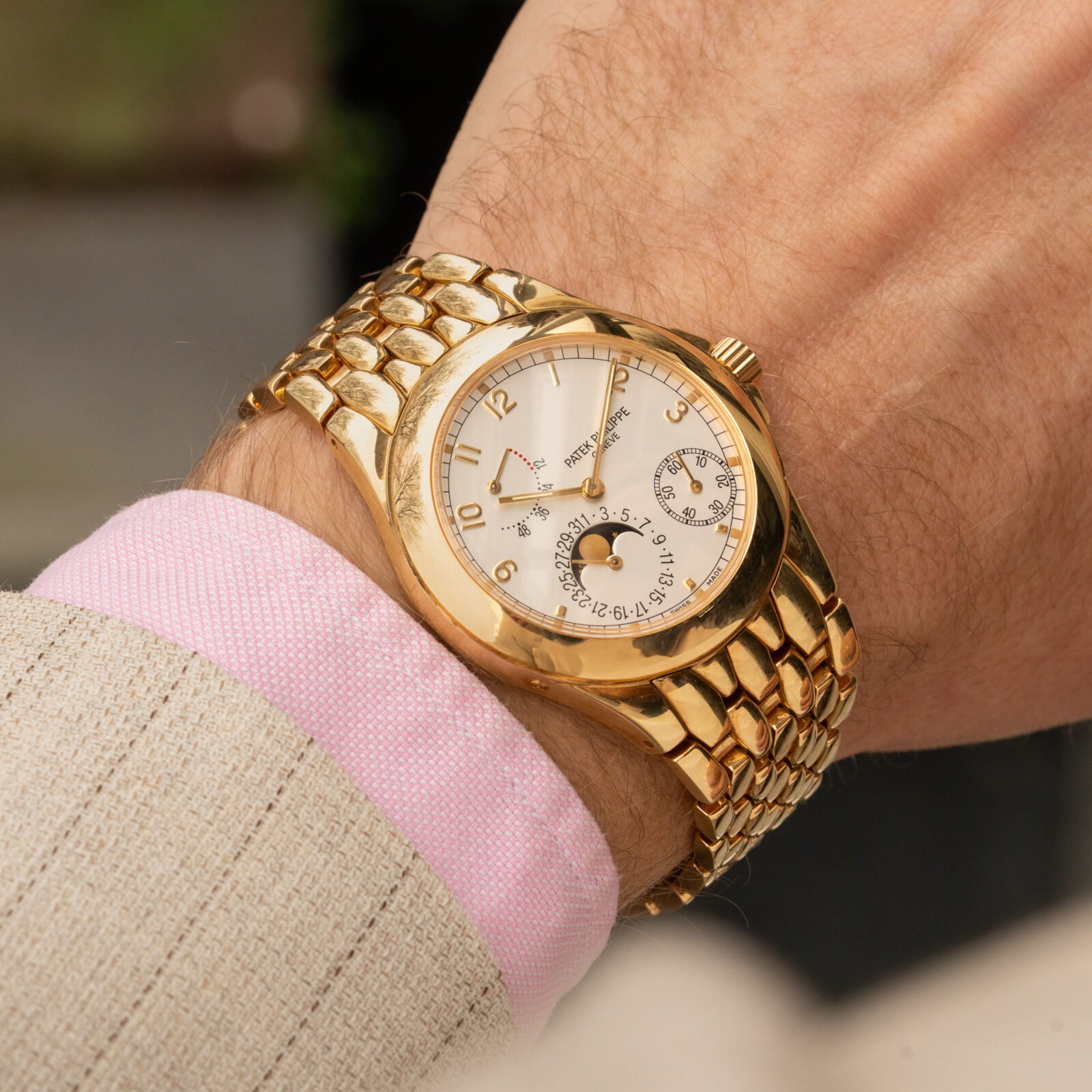 The promotional tagline that was used: “Ideal for sportswear, the supremely elegant Neptune is, at the same time, the perfect dress watch.” The Neptune’s appropriately sized 37 mm case, sophisticated dial design and elegant stick hands highlighted its dressy aspect. Additionally, the 5085 features some interesting complications like the moonphase, date and power reserve. It might remind you of the 3712 dial lay-out, yet it precedes that Nautilus by 7 years! (The 5085 was introduced in 1998) On the other hand, its 30 meter depth rating, crown protectors, and integrated bracelet infused it with a sporty character.