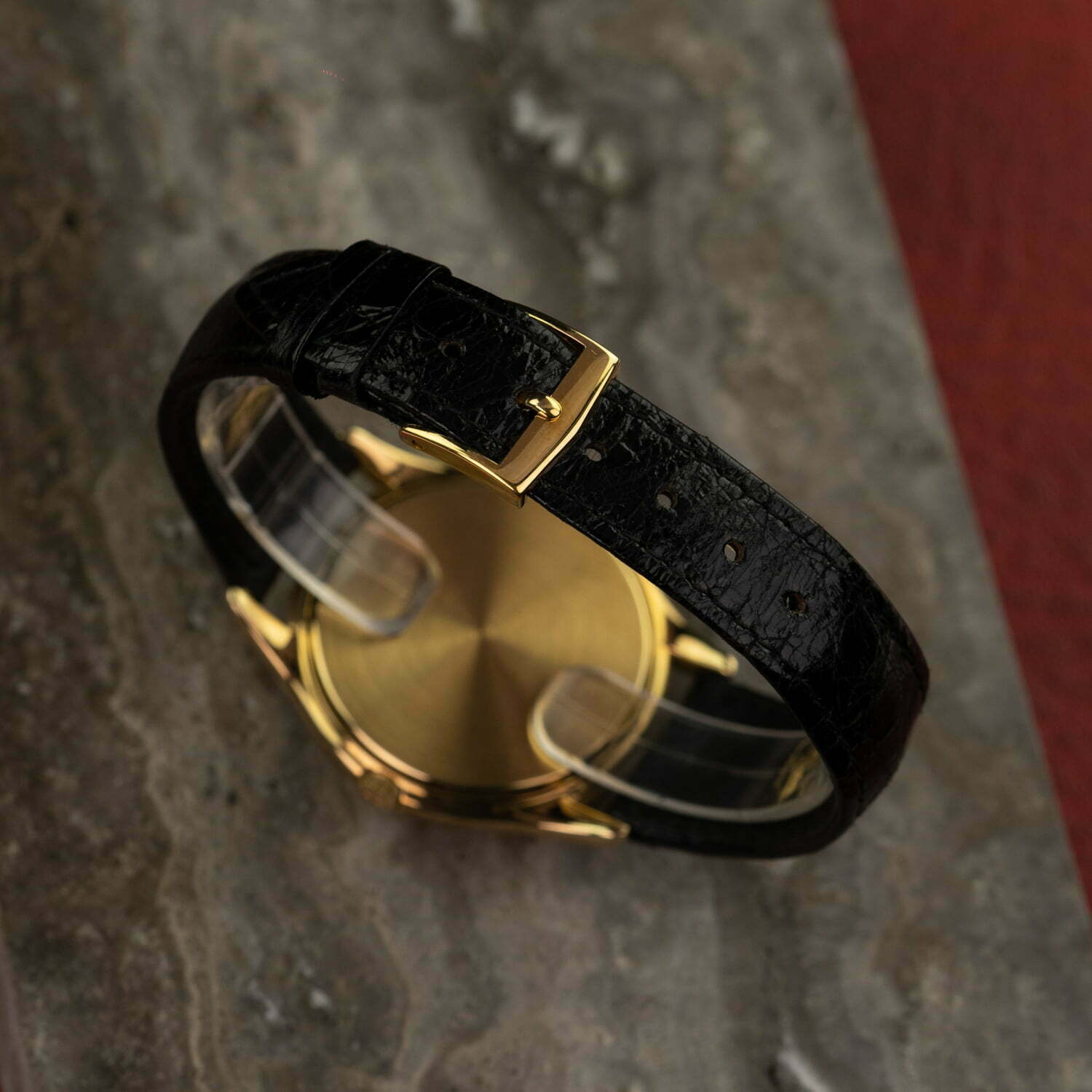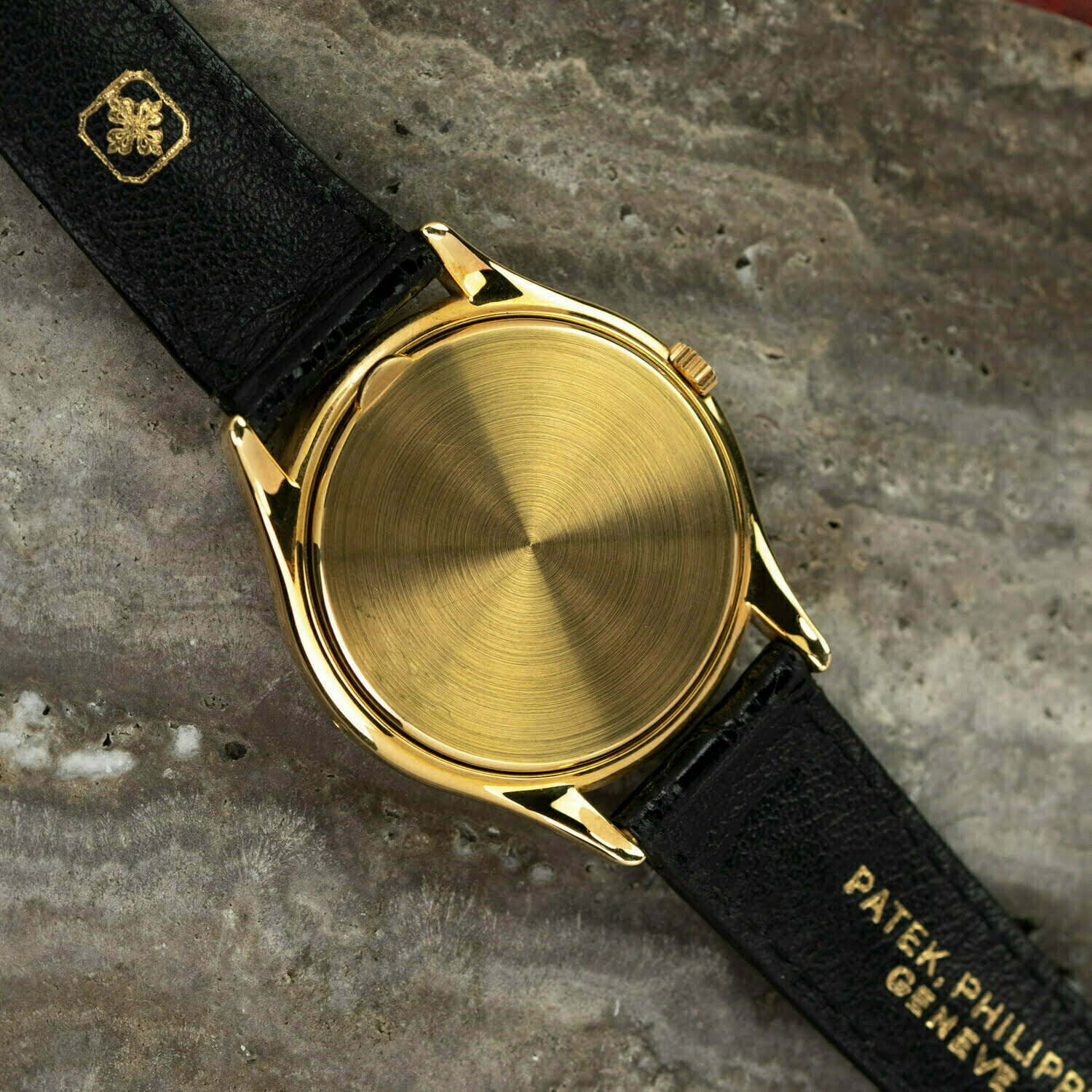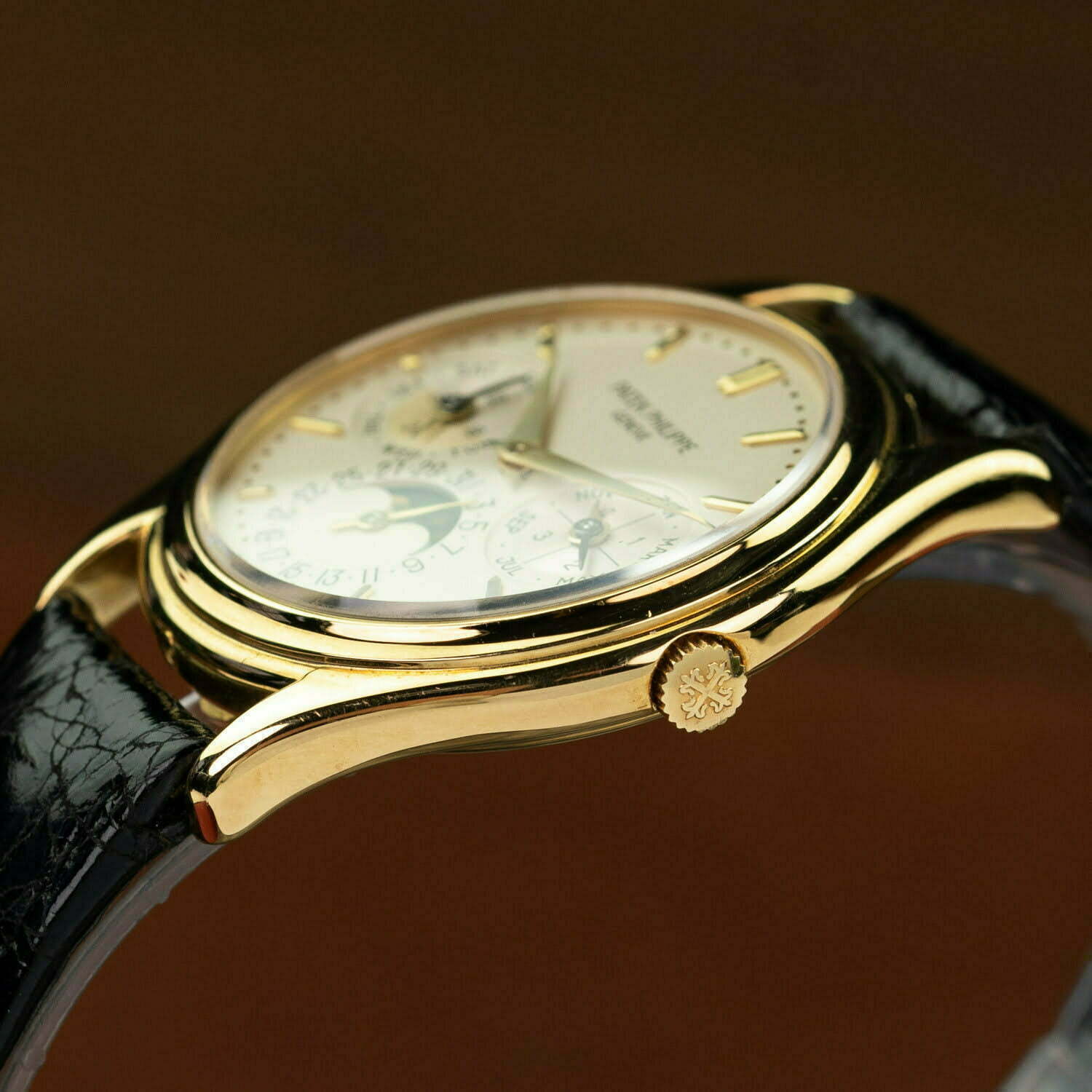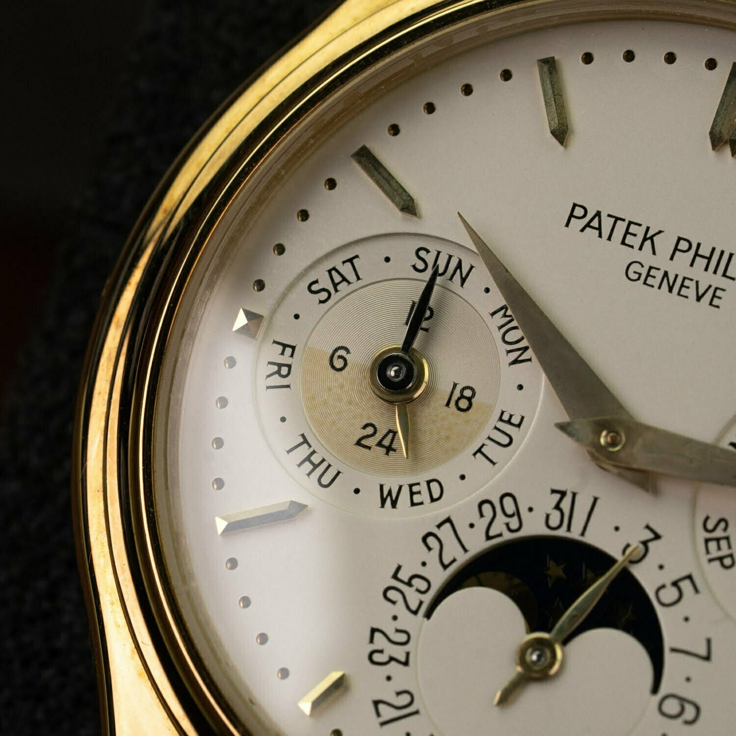 At the height of the quartz crisis that decimated the Swiss watch industry, Patek released a duo of watches with perpetual calendar complications in 36 mm cases. The ref. 3940 housed this unique complication in a beautiful dressy case. The watch was notably worn by Thierry Stern, patriarch of the Stern family that owns Patek Philippe. This 3940J is housed in a yellow gold case with a matching yellow gold screw down case back. The champagne dial sports 18k yellow-gold pointed baton indexes and elegant 18k yellow-gold dauphine hands. Two apertures at the 12 o’clock position reveal the day and month mechanism. The complications are displayed on three recessed sub-dials. The sub-dial at the 9 o’clock position indicates the day of the week as well as a 24-hour hand, while the sub-dial at 3 incorporates the month and a leap year indicator. Finally on the lower sub-dial we find a charming moon phase indicator, which is surrounded by a date complication. Officially, the 3940 was only produced between 1985 and 2007 and this example dates back to 1990.