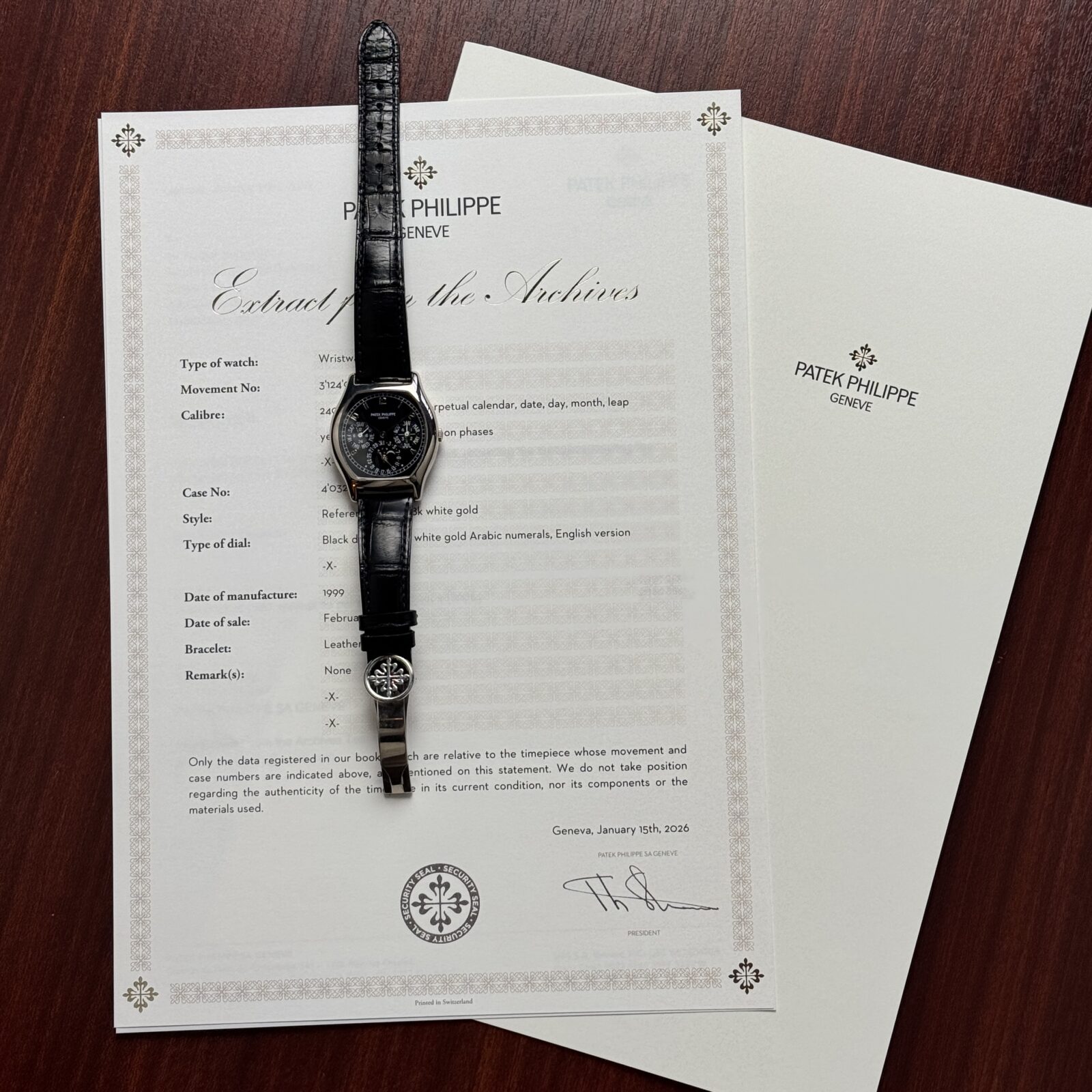 This superb perpetual calendar wristwatch was serviced by Patek Philippe in 2022, right before we sold it to a client. We are happy to have bought it back 3 years later. unfortunately the client lost the extract of the archives, dating the watch to 1999, but luckily this document can be requested again on request of the next caretaker. The watch comes on a black alligator leather Patek Philippe strap with an 18k white gold deployant clasp.