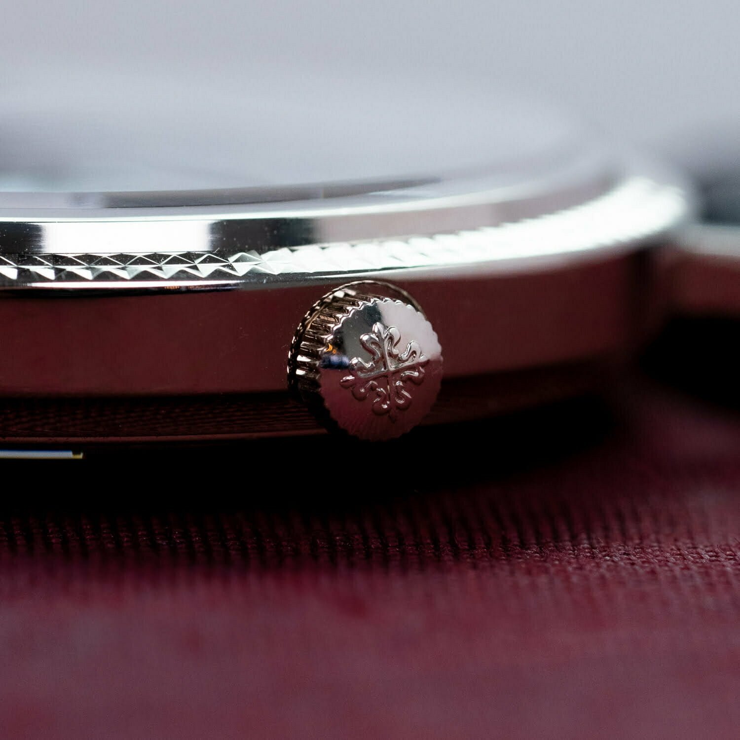 This ref. 5139G dates back to 2012 and is executed in an 18k white gold case with thin straight lugs and Patek Philippe’s iconic Clous de Paris (hobnail) bezel. The case sports a sapphire see-through case back, yielding an uncensored view of the expertly finished ultra-thin automatic movement with a 21k gold micro rotor.