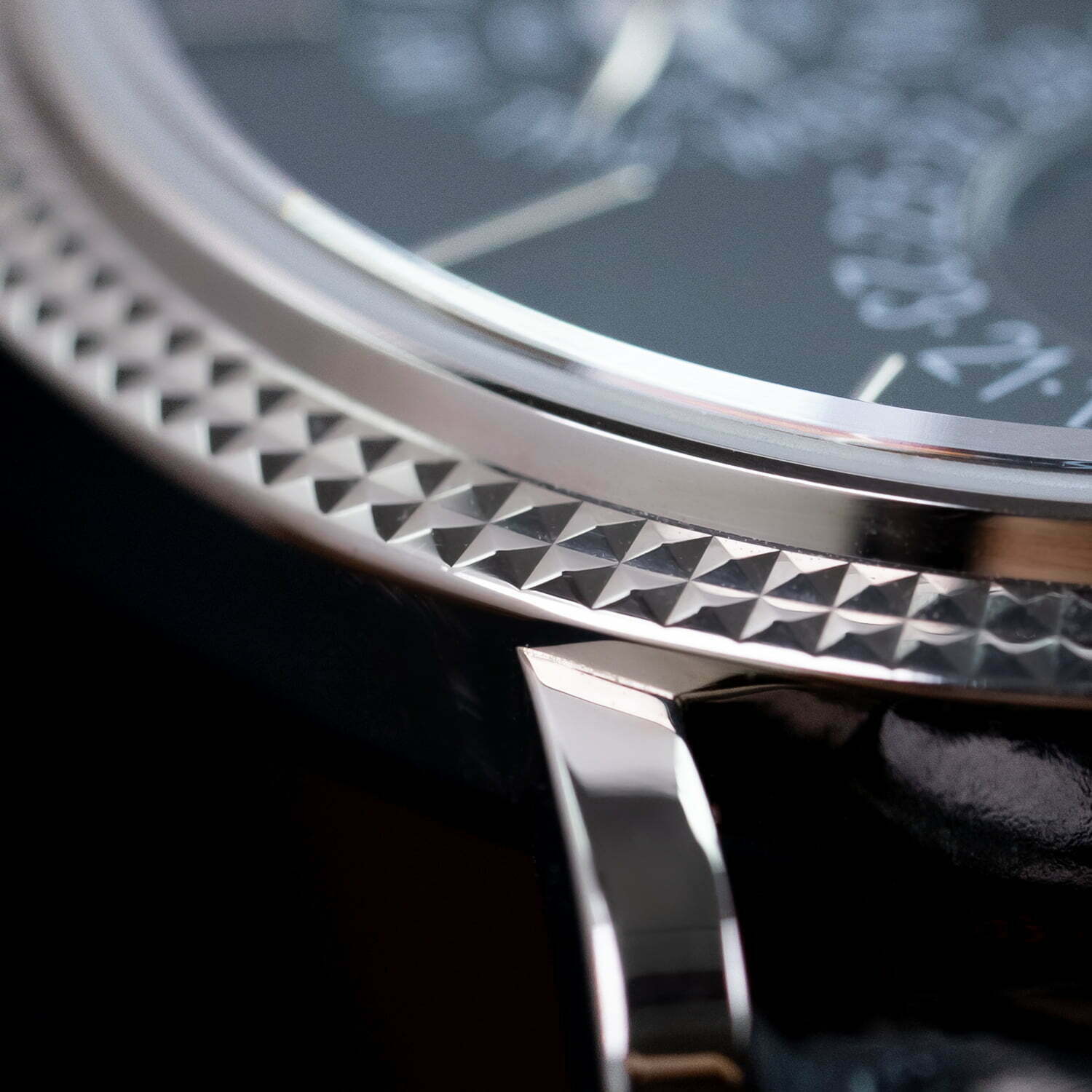 The black lacquered dial features 18k white gold applied baton markers and elegant 18k white gold feuille (leaf) hands. The lovely recessed sub-register at the 9 o’clock position displays the days of the week and a handy 24-hour counter, while the month and the position in the leap-year cycle can be read off of the sub-register at 3. Finally, the lower sub-register incorporates a romantic moonphase indicator that is surrounded by the date functionality.