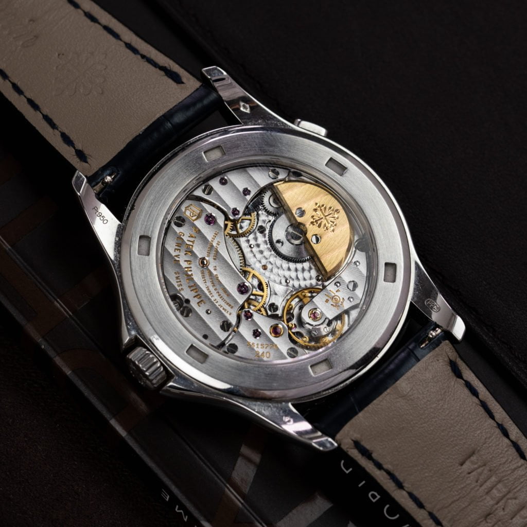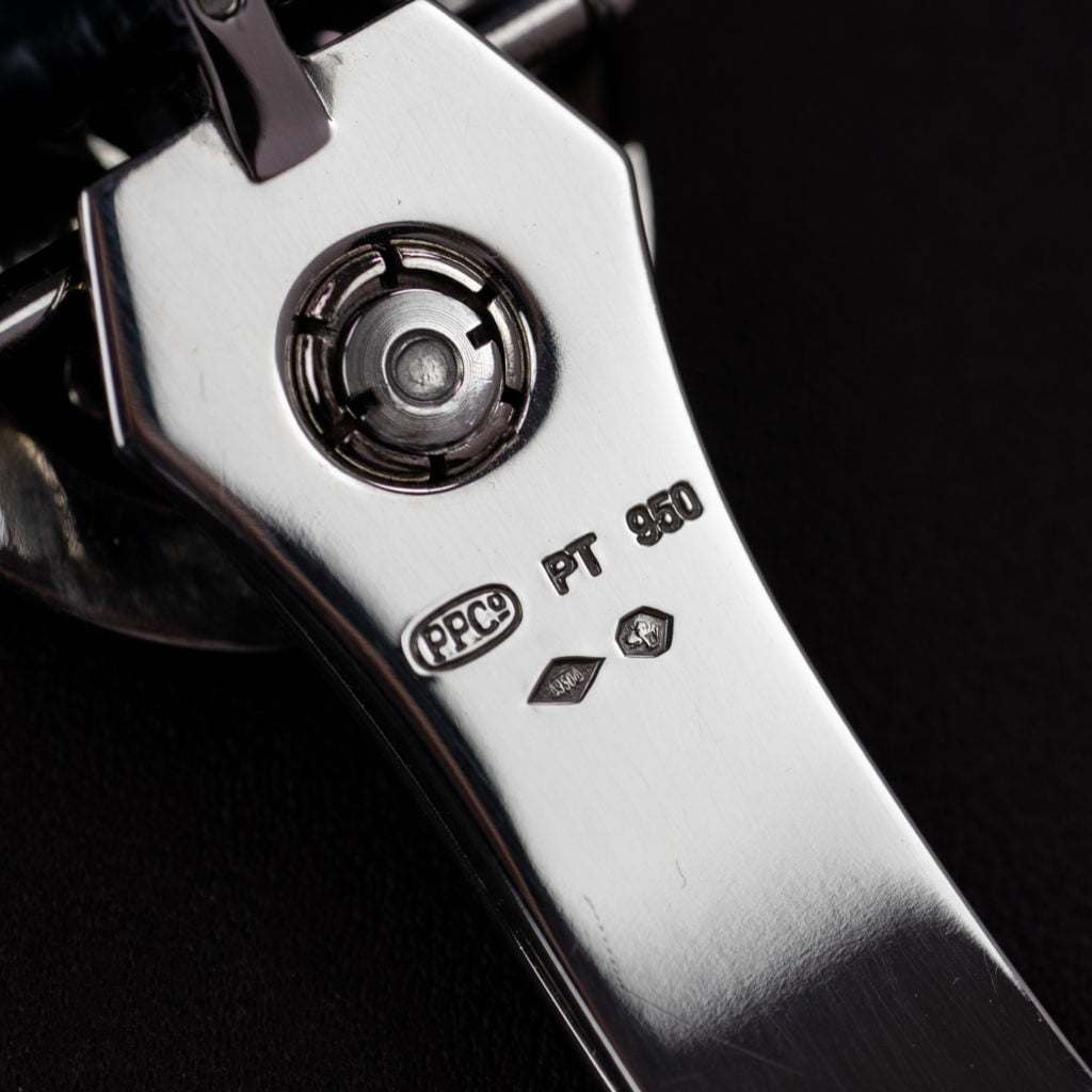 The 5130 'Mecca' edition was aimed toward the Middle East and only made in a limited quantity of only 150 pieces.The 5130P-015 has, instead of the well-known enamel inner dial, a sunray guilloché à main pattern. This pattern consists of twelve thick lines and eight thinner lines that emanate from the centre mimicking sunbeams. The 'Mecca' edition has an emerald-green inner dial that matches with the green-printed 'Mecca' on the city ring. Green is considered the traditional colour of the Islam and is often used in mosques and for the Quran. It's also the colour of Saudi Arabia's flag. The watch is made of platinum because Muslim men are not allowed to wear gold.The genius of the Louis Cottier-style world time complication is that it simultaneously displays both the local time as well as the time across all of the world’s time zones on one dial. It works as follows. The dial consists of two concentric rotating rings. The outer ring—displaying the names of the cities corresponding to each timezone—runs clockwise, while the inner 24-hour ring runs counter-clockwise. The local time zone (for instance, Mecca) is placed at the 12 o’clock position by engaging the pusher located at the upper left hand side of the case. The hands can then be adjusted to the correct time using the crown. When doing so, the 24-hour ring automatically adjusts itself to this time as well. As a result, the correct local time can be read with the hands, while the correct time in each time zone is displayed simultaneously alongside the 24-hour ring.The reference 5130P-0015 is executed in a dressy platinum case, measuring a healthy 39.5 mm. Despite its rather large size for a dressy watch, the incorporation of an ultra thin automatic movement with an 21k yellow-gold micro rotor (which can be viewed in all its glory through the sapphire crystal case back), the watch maintains a sleek profile and can still comfortably slip under a shirt cuff.This Patek Philippe World Time comes on a navy-blue alligator-leather Patek Philippe strap with a platinum Patek Philippe deployant clasp. The watch comes as a full set with the original inner and outer boxes, leather folder, booklets, and stamped certificate of origin.