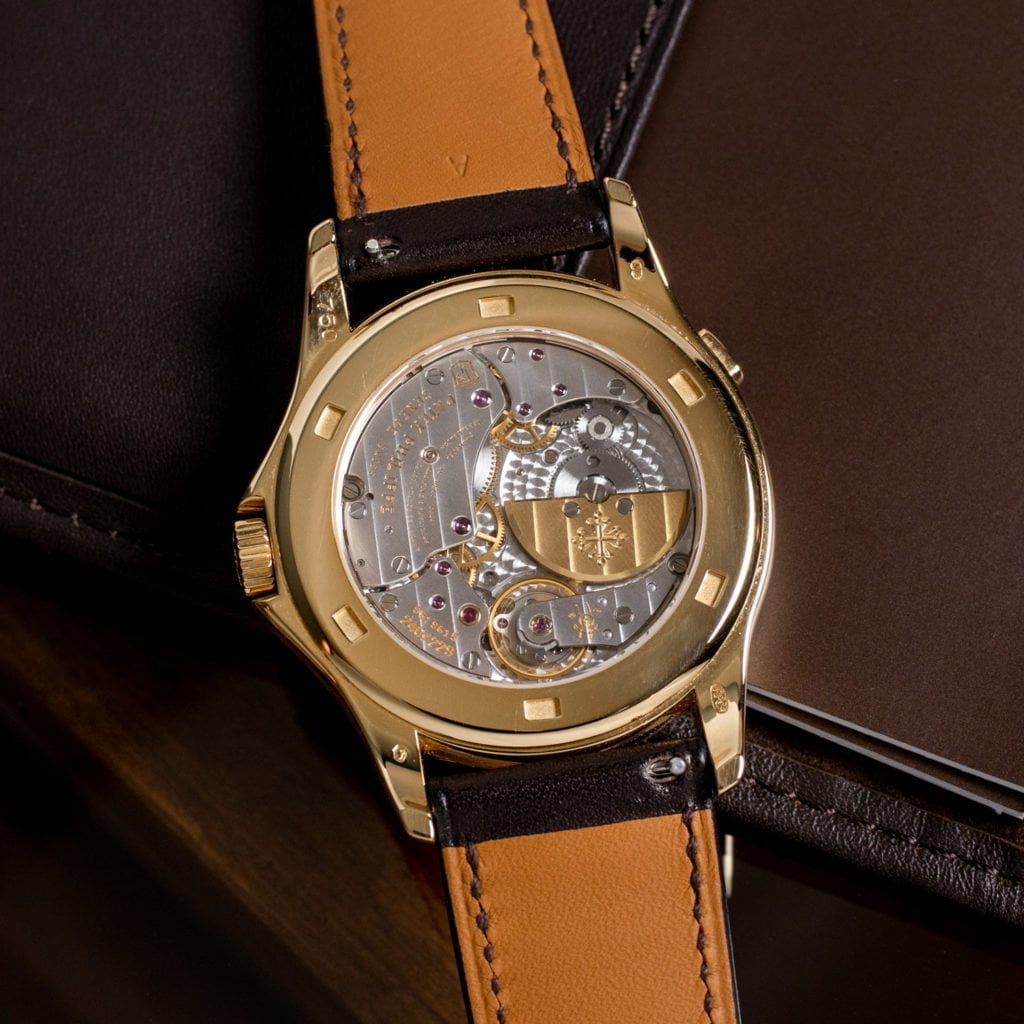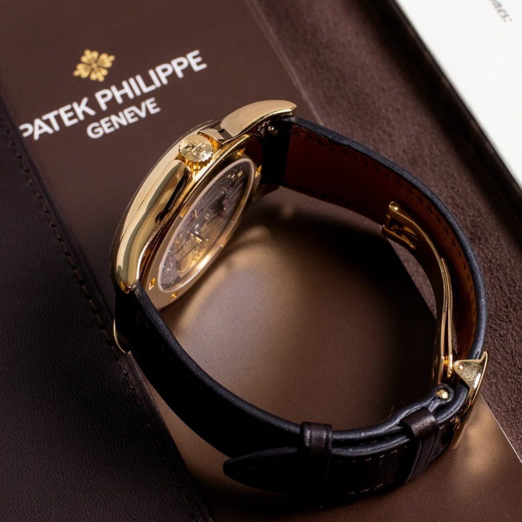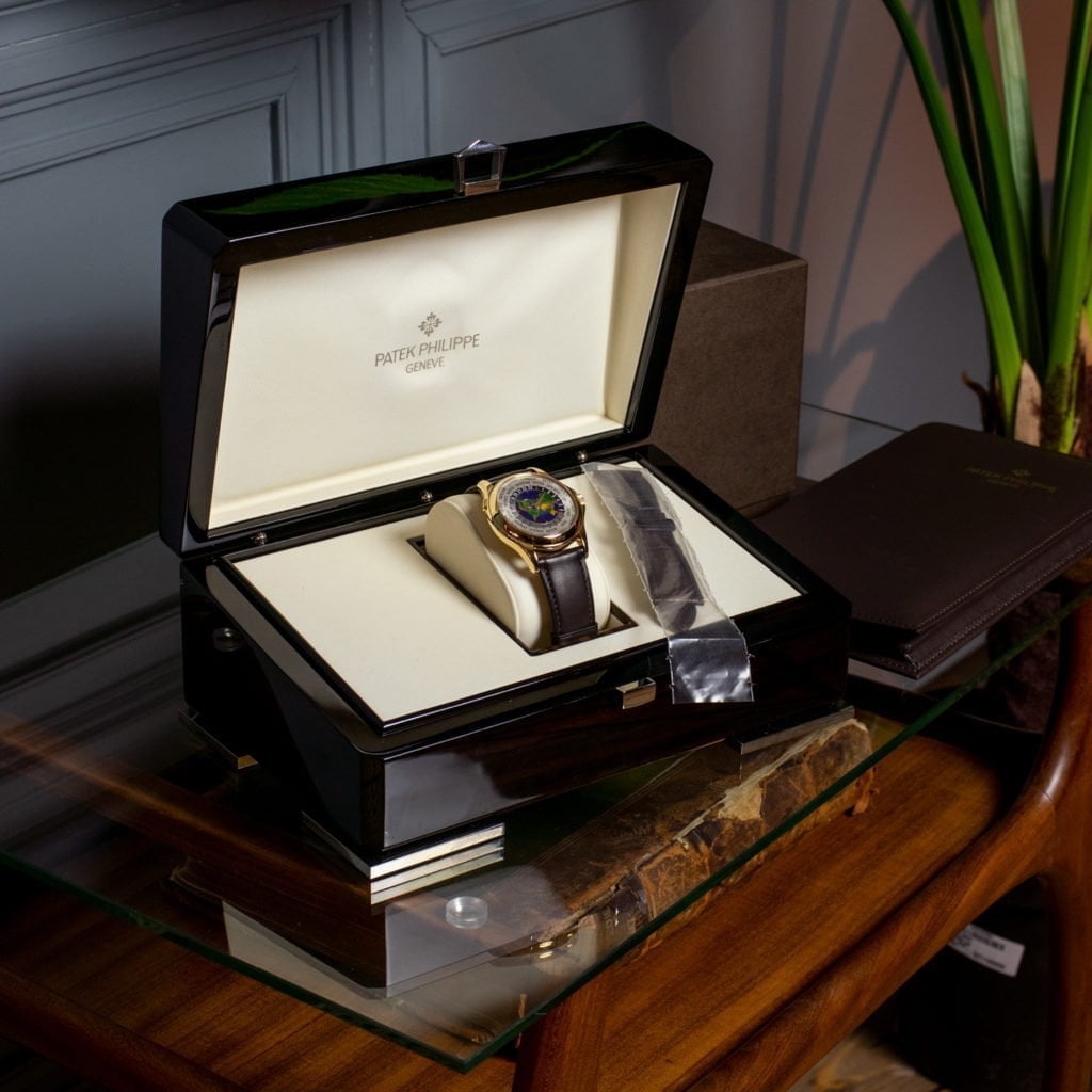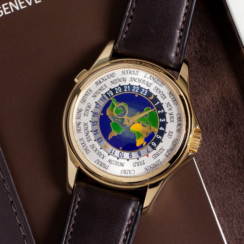The Patek Philippe ref. 5131 is a modern iteration of the ingenious worldtime watch that was conceived by Louis Cottier in 1931.The genius of the Louis Cottier-style worldtime complication is that it simultaneously displays the local time as well as the time across all of the world’s time zones on one dial. It works as follows. The dial consists of two concentric rotating rings. The outer ring—displaying the names of the cities corresponding to each timezone—runs clockwise, while the inner 24-hour ring runs counter-clockwise. The local time zone (for instance, Moscow) is placed at the 12 o’clock position by engaging the pusher located at the upper left hand side of the case. The hands can then be adjusted to the correct time using the crown. When doing so, the 24-hour ring automatically adjusts itself to this time as well. As a result, the correct local time can be read with the hands, while the correct time in each time zone is displayed simultaneously alongside the 24-hour ring.The ingenuity of the worldtime complication is matched by the magnificence of the dial. Not only does the dial display time in an inventive way, but it also leaves room for a true piece of art: a cloisonné enamel center disc depicting Africa, Europe, and the Americas. Cloisonné enamel is an ancient technique where thin gold wires are painstakingly applied by hand. The resulting compartments are filled with enamel paste and the entire setup is then fired in a kiln, resulting in a beautiful and intricate image with lively colors. This process is highly labor intensive and requires highly skilled craftspeople. The ref. 5131J is executed in a dressy 18k yellow-gold case, measuring a healthy 39.5 mm. Despite its rather large size for a dressy watch, the incorporation of an ultra thin automatic movement with a 21k yellow gold microrotor (which can be viewed in all its glory through the sapphire crystal caseback), the watch maintains a sleek profile and can still comfortably slip under a shirt cuff.The ref. 5131J was introduced in 2008 and discontinued after only a few years. Due to the labor intensive dial production process, only a few dozen were made every year. As a result, this watch is one of the most collectible modern Patek’s in existence.The 39.5 mm case is executed in 18k yellow gold and features an elegant bezel that is engraved “Patek Philippe” and “Genève”. We’ve combined the watch with an exquisite handmade chocolate brown leather Hermès strap and an 18k yellow gold Patek Philippe deployant clasp. The original, unused, alligator leather Patek strap is also included.The watch comes as a full set with the original inner and outer boxes, leather folder, booklets, and stamped certificate of origin.