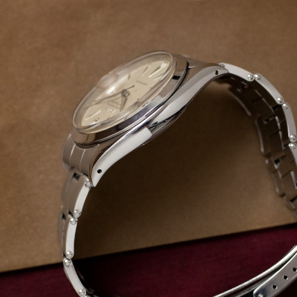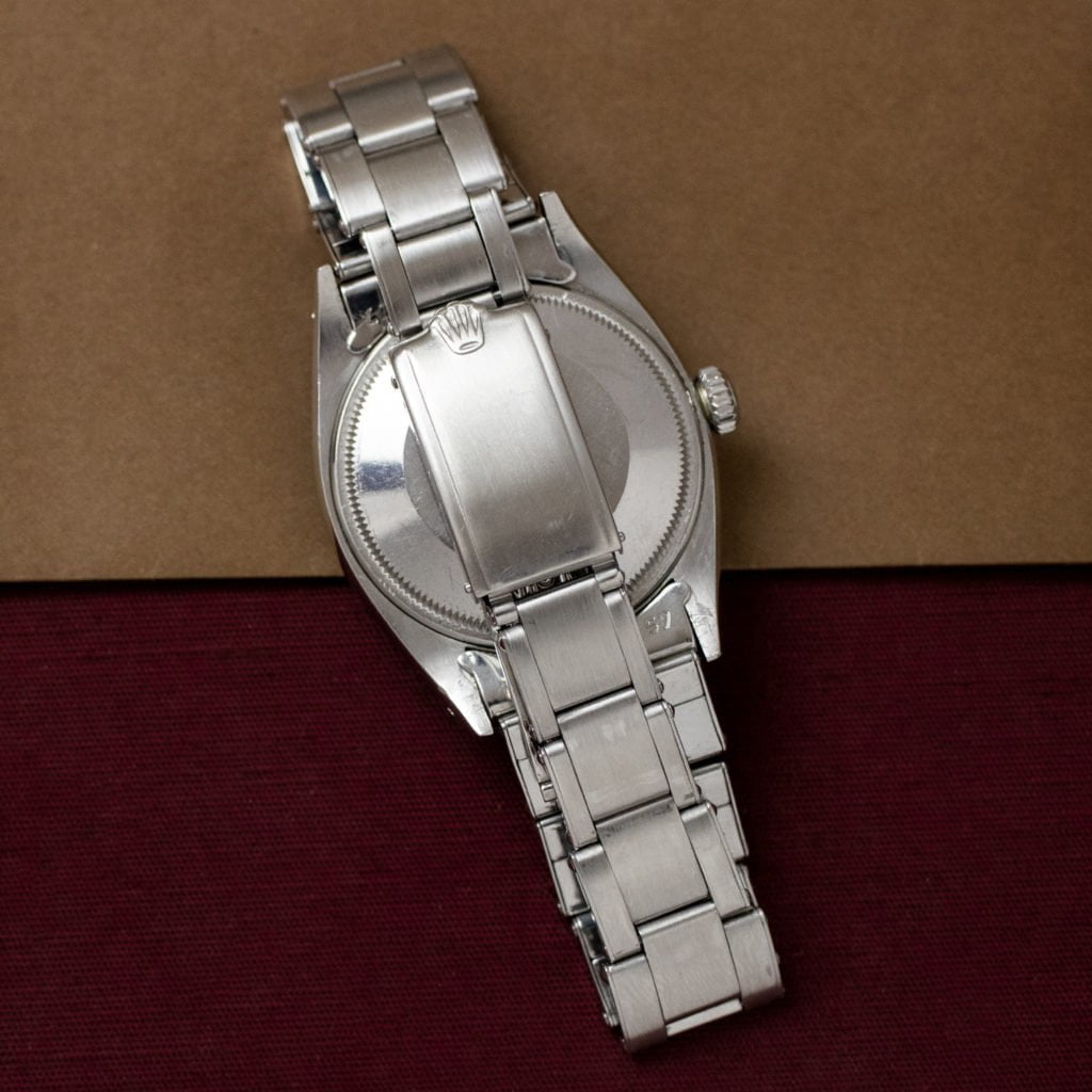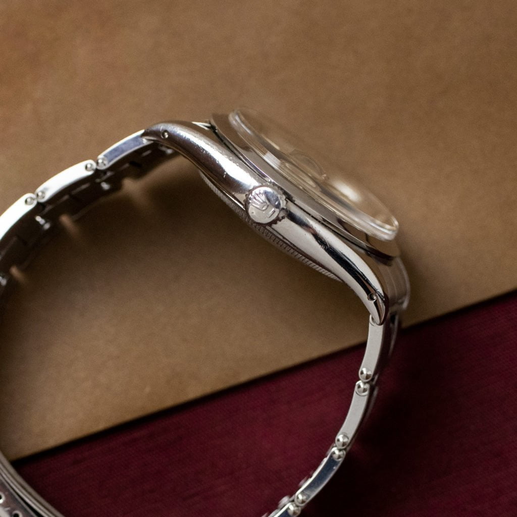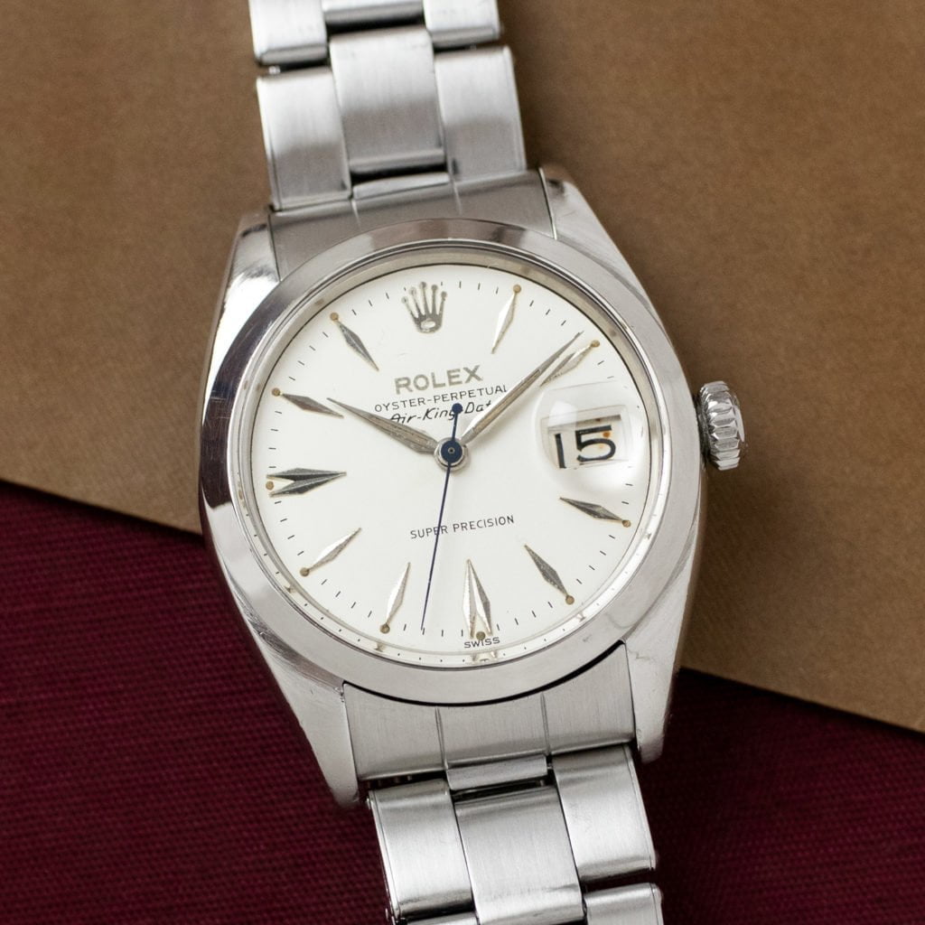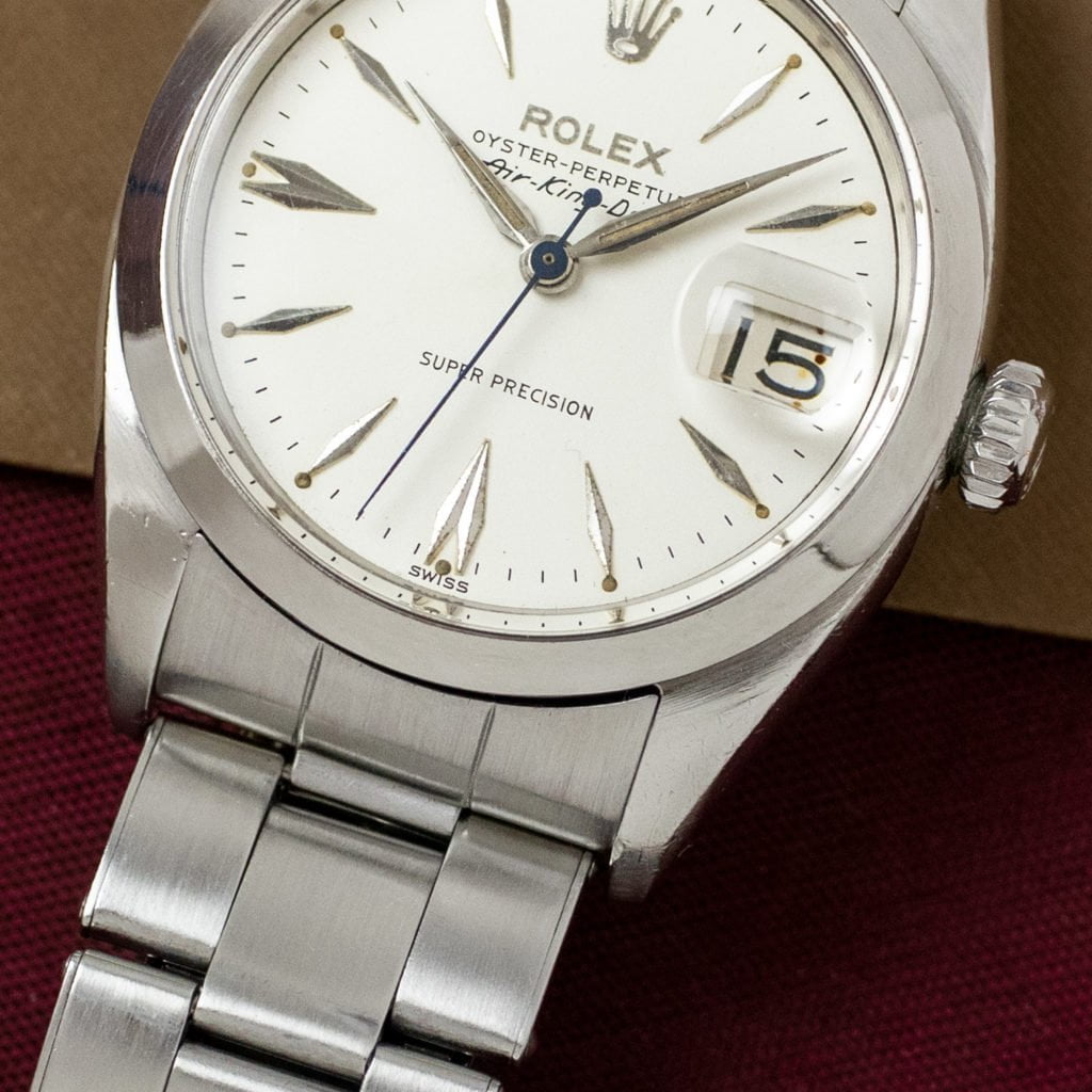 One of the many things we love about Rolex is that even in the more affordable price ranges there are plenty of rare gems to be discovered.The Air-King has become a cult classic since it was introduced after World War II to honor the United Kingdom’s wartime fighter pilots. The 34 mm Air-King is best known as a time-only watch. However, in 1958 Rolex introduced an Air-King with a date function: the ref. 5700. The 5700 was produced in much smaller numbers than its no-date sibling, making for a collectible yet affordable watch.This 5700 is one of the earliest ever made, dating back to 1960. As a result it features loads of lovely mid-century details. The matte silver dial has taken on a warm creamy sheen that meshes well with the custard color lume plots. On the top half of the dial, we find the “Air-King-Date” signature in the characteristic cursive Air-King font. The dial features charming lozenge-shaped applied hour markers, with alternating applied arrowhead markers at the 6 and 9 o’clock positions. The elegant design cues of the markers are continued on the wonderful alpha-shaped hands.The 34 mm stainless steel case and steel domed bezel are in good shape and come on a period-correct stainless steel riveted Oyster bracelet.