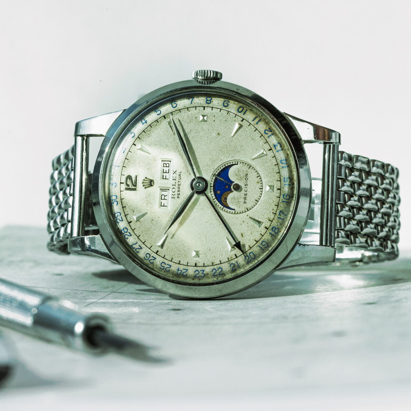 Aside from its oversized appearance, the Padellone stood out for its complications as well. In fact, with its triple calendar and moonphase functionality, the Padellone (together with its smaller Oyster cased sibling, the ref. 6062) are the most complicated watches ever fully produced in-house (Aegler) by Rolex. In comparison, the more complicated Rolex Datocompax ‘Jean Claude Killy’ from the same era—a watch with a chronograph function in addition to the full calendar and moonphase—was powered by the Valjoux caliber 72C movement.