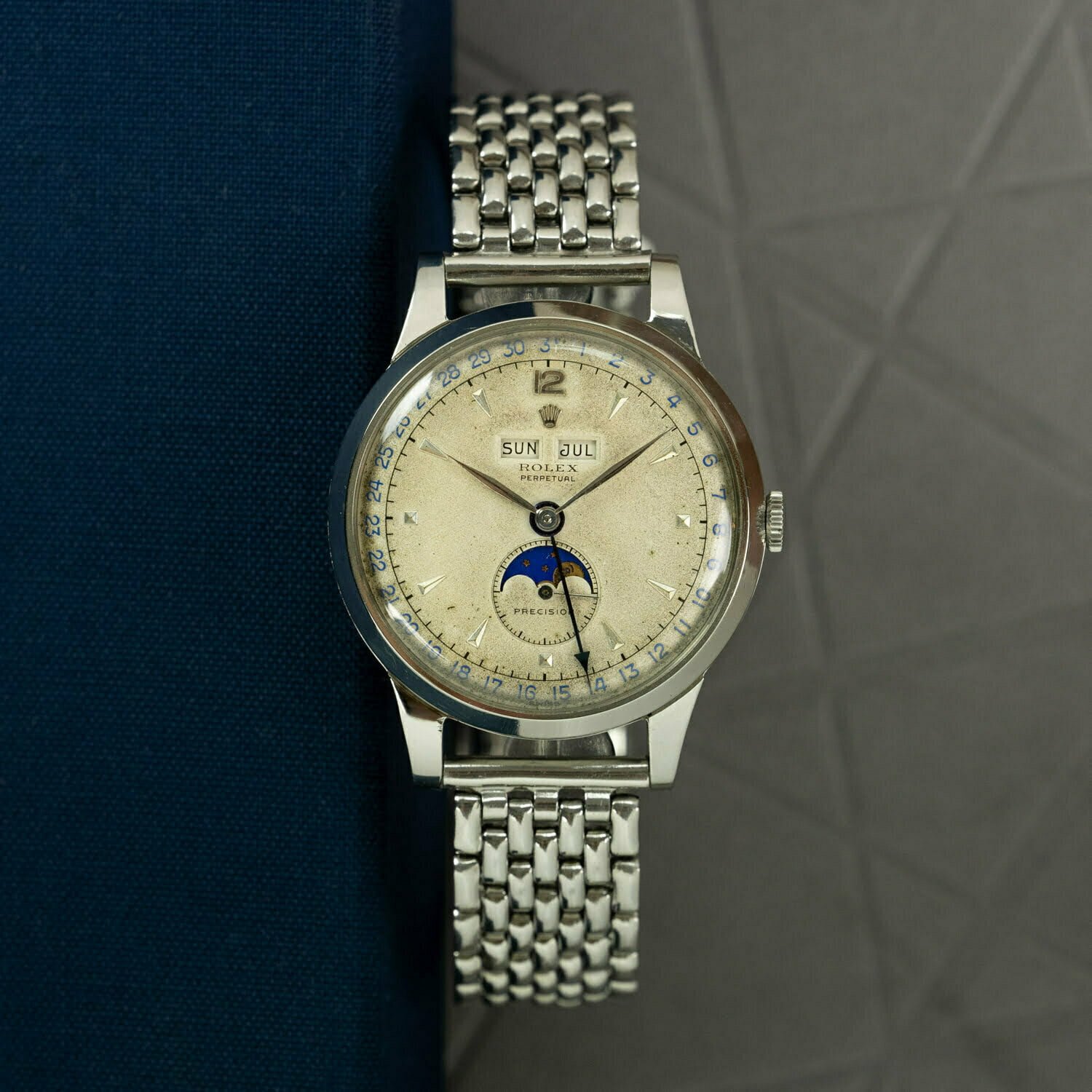 It features an exceptionally pleasing design, consisting of a rather large round case with strong lugs and sharp polished bezel, here executed in stainless steel. Meanwhile, the dial is beautifully proportioned, aided in part by the rather large size. The bright blue pointer date scale on the rim of the dial is given ample space, while the day and month apertures are harmoniously placed opposite to the moon phase, with the Rolex signature cleverly placed between the two. Finally, the arrowhead and pyramid-shaped hour markers together with the leaf-shaped handset infuse the watch with a quintessential mid-century quality.