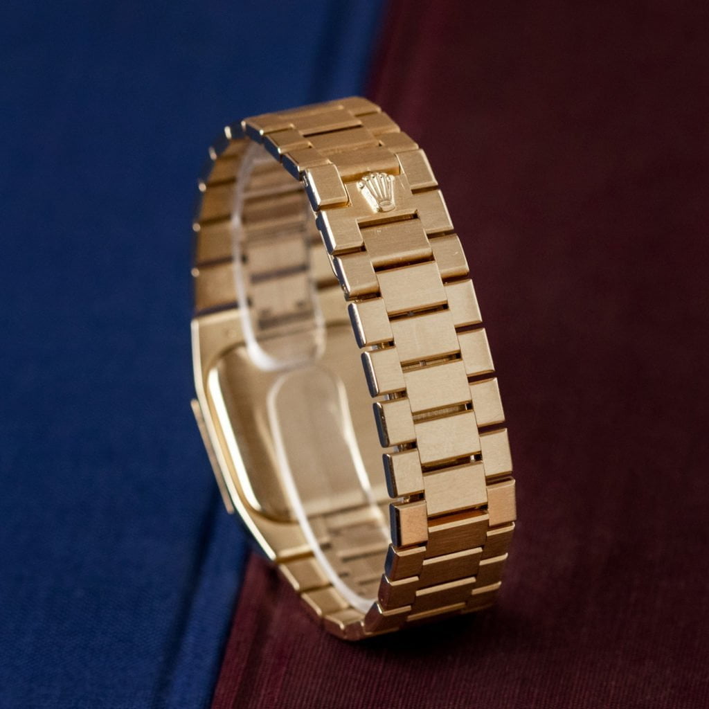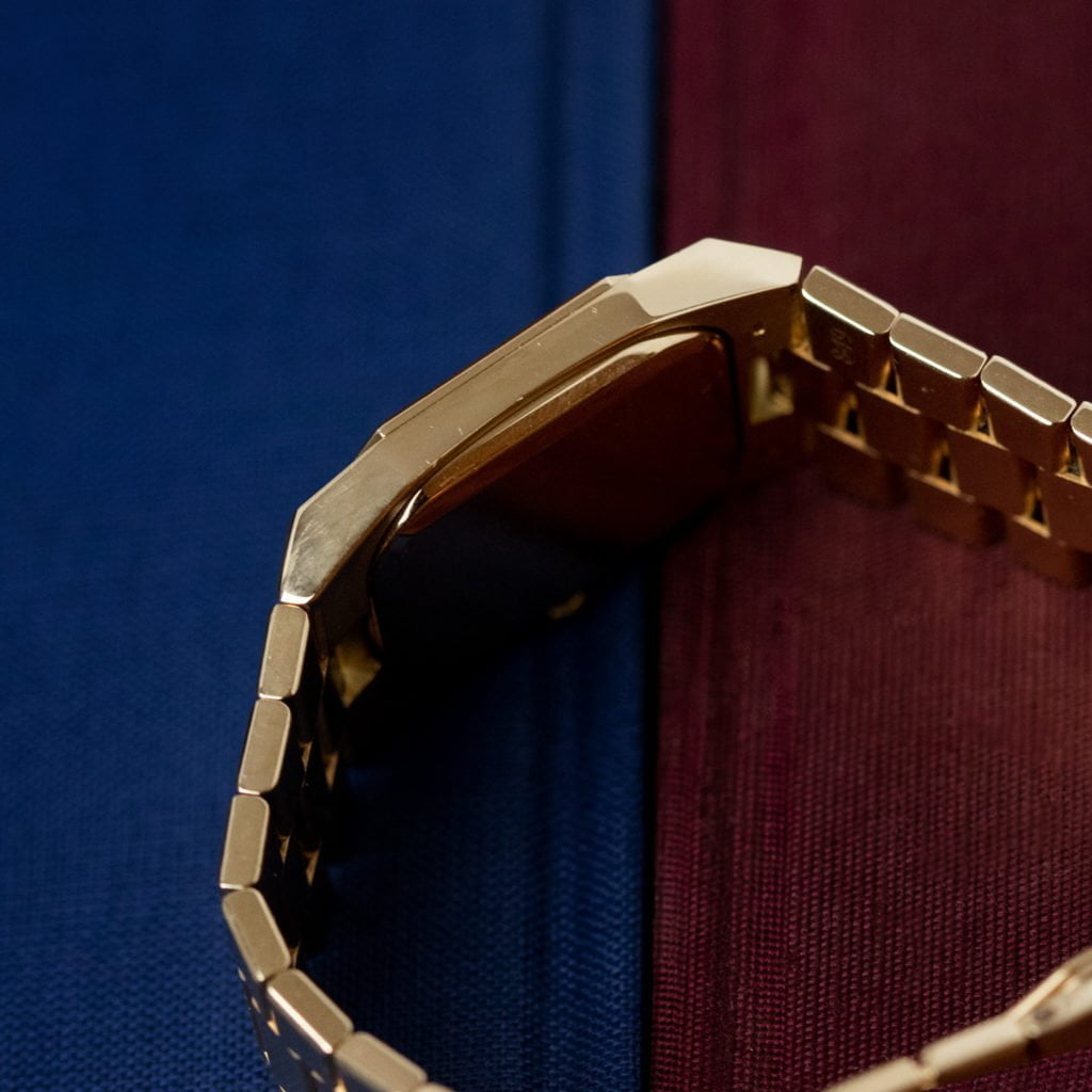 Before turning into the line of elegant and ultra-classic watches, the Cellini collection was Rolex’ experimenting ground with a range of ground-breaking bold angular designs.These early Cellini watches often sported angular case shapes and integrated bracelets that looked a lot like the Royal Oak and Nautilus designed by the legendary Gerald Genta. This is far from surprising since Genta was responsible for the pioneering Rolex King Midas that was released as a limited edition in 1964.Though not designed by Genta, his influence is palpable in this lovely reference 4350 from 1981. The rectangular 18k yellow-gold case features an octagonal bezel, much like the Nautilus and Royal Oak. The engraved bezel—with Roman numerals on the quarters and engraved hash marks on the remaining 5 minute positions—invites some comparison to the Bulgari BVLGARI, another Genta-designed favorite. The watch comes on its original ‘President-style’ 18k yellow-gold integrated bracelet with flat links and a hidden folding clasp. The gold dial is free from clutter and features a simple applied logo and Rolex signature at the 12 o’clock position and cursive “Cellini” text at the 6 o’clock position. The minimalist look of the dial is complemented by elegant thin sword-shaped 18k yellow-gold hands.The watch is in excellent condition with sharp faceted edges, indicating that the watch was sparsely polished over its lifetime. The integrated bracelet is in great condition as well, with minimal stretch between the links. A recent service at our watchmakers ensures that the trusty manual Rolex movement runs smoothly for years to come.