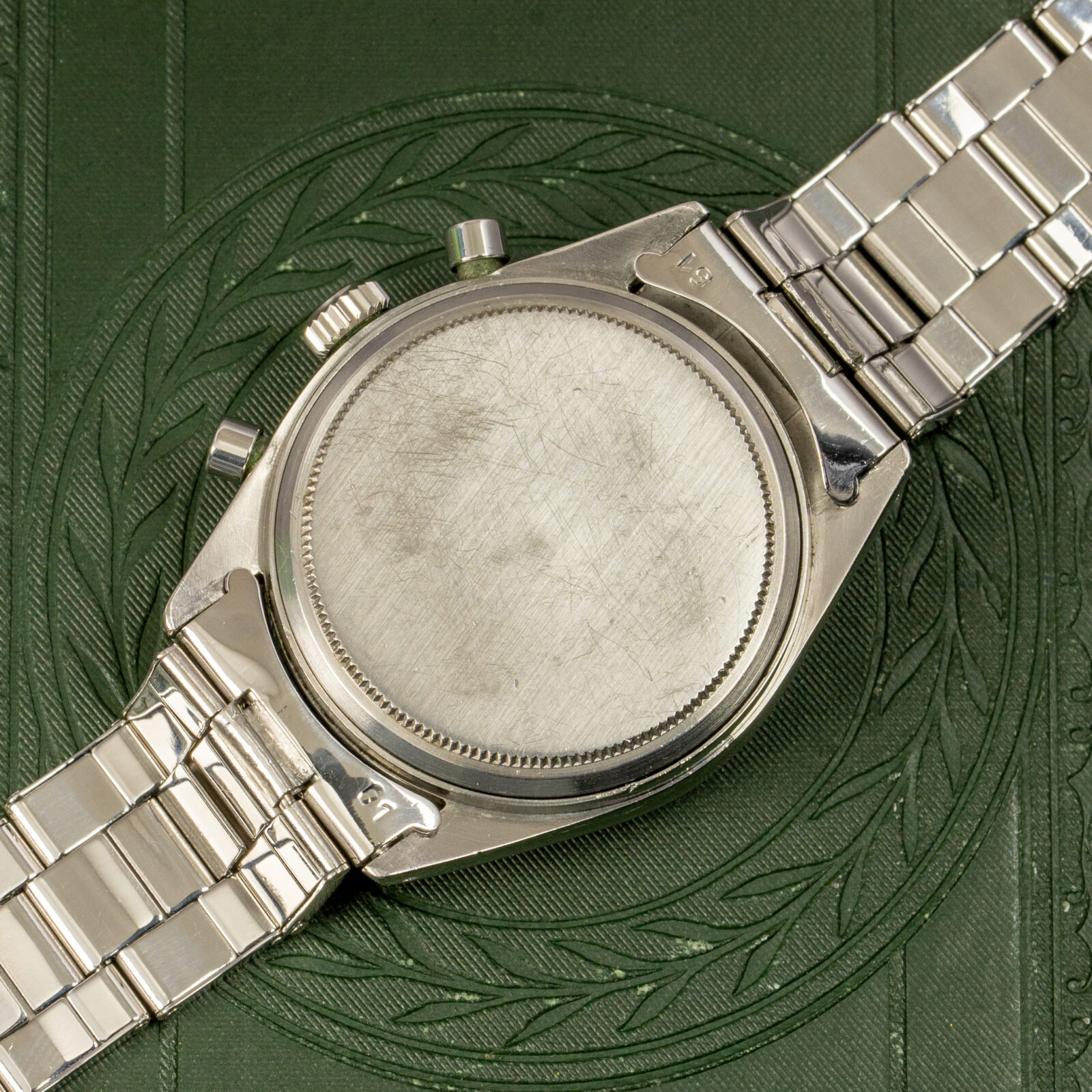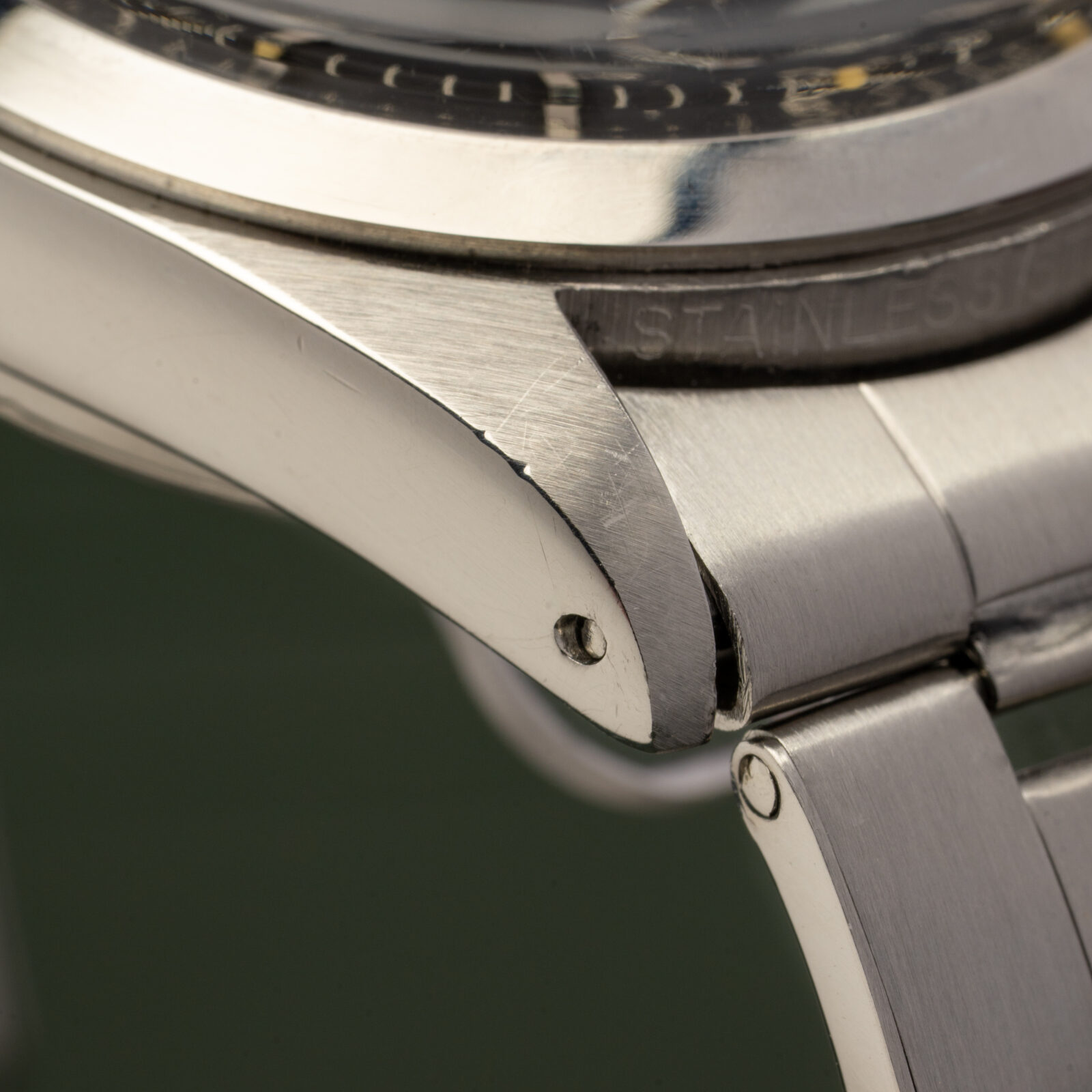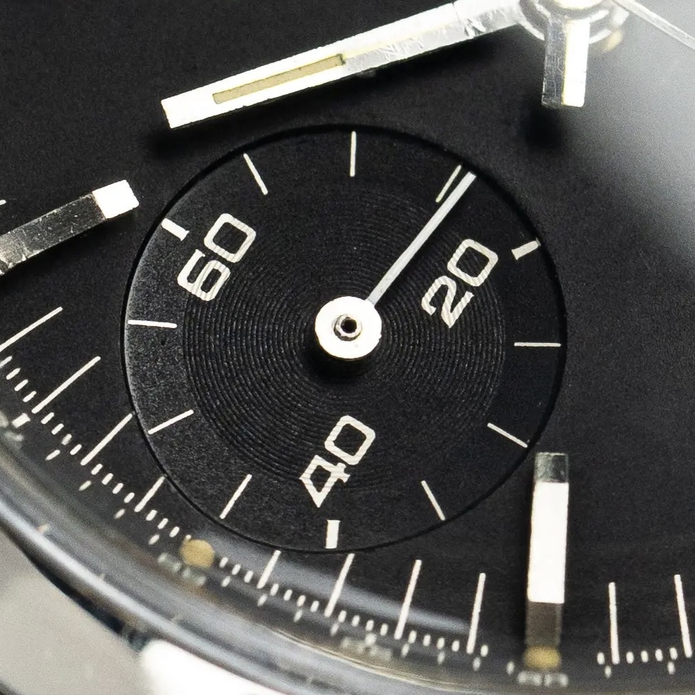 We are thrilled to showcase this incredible example that provides a perfect balance between austerity and elegance. The "-T SWISS T-" dial has silver printing, complementing the material of the case and bracelet. The dark surface shows some small blemishes, barely visible with the naked eye, and not taking away any of the charm. The correct small minute hand is mounted and the original thin register hands are too. The white lacquer on these, including the arrow of the second counter, is still perfect.