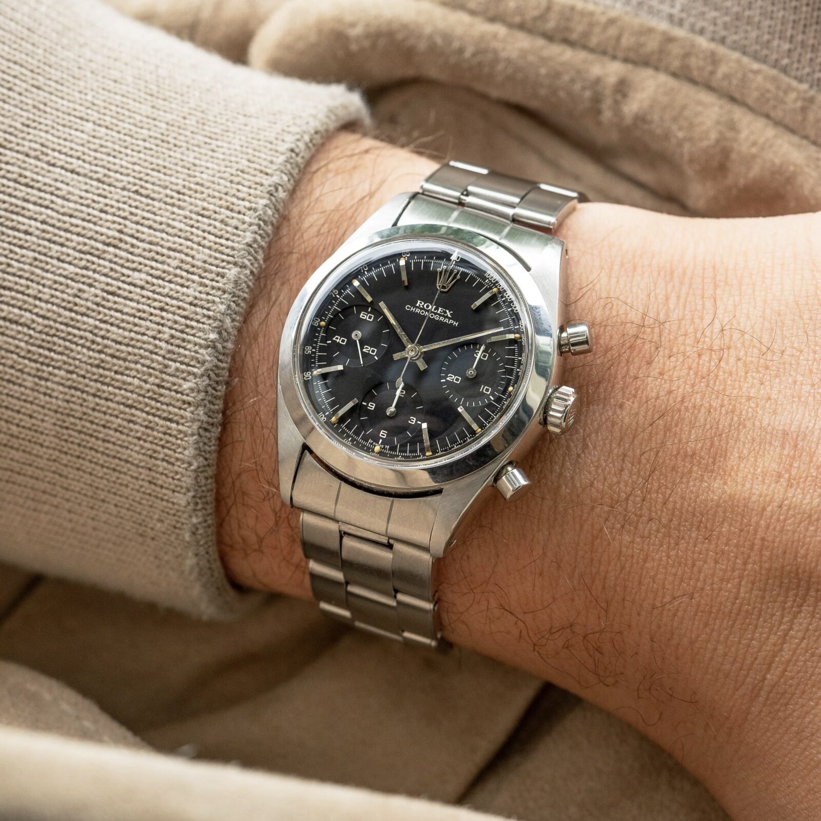 This 36mm measuring timepiece has a lot to offer; both aesthetically and mechanically. It is powered by a celebrated Valjoux caliber, housed in a sleek Oyster case with round pump-pushers. The slightly domed, smooth bezel gives it a pleasant sophistication, unknown to most toolwatches. The monochrome dial is unostentatious and pragmatism seems paramount, unlike the less comprehensible and more crowded dial design of most earlier Rolex chronographs.