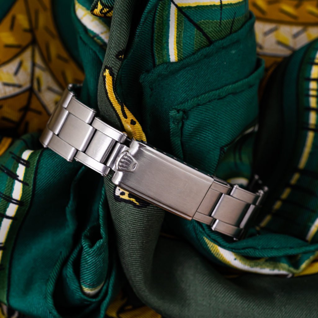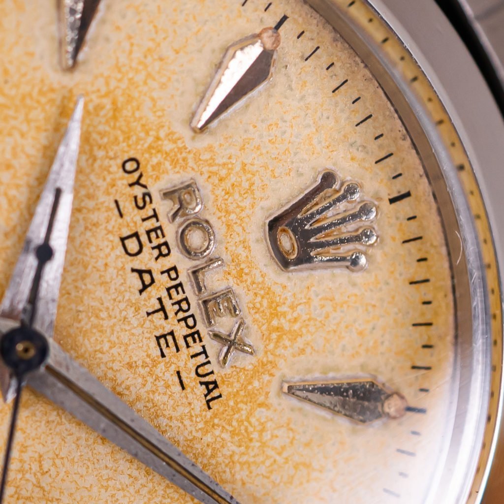 One of the many things we love about Rolex is that even in the more affordable price ranges there are plenty of gems to be discovered.The Rolex Date was introduced in the mid-1950s as the slightly smaller and more utilitarian brother of the iconic Datejust. The Rolex Date traditionally comes in a 34 mm stainless steel case, although some gold executions exist as well, and usually comes with the classic polished domed bezel.This ref. 6534 was produced in 1957 and is one of the very earliest executions. As a result, it features loads of lovely mid-century details. The dial has patinated to a warm custardy color with brown spotting—known as ‘radium burn’—due to the use of radioactive luminous compound in the hands and the lume plots next to the indices. The top half of the dial features the “ROLEX” signature in applied letters, a detail typically found on watches from the 1950s. The dial, furthermore, sports charming applied claw-shaped hour markers with alternating double pointed baton markers at the 6 and 9 o’clock position. These elegant design cues are continued on the wonderful dauphine handset. As is typical for this time period, the date disc is executed in roulette style with alternating red and black numerals set against a white background. All of this is visible through a cool metal apertureThe 34 mm stainless case is in great condition, especially considering its age, and comes on its original stainless steel riveted Oyster bracelet bearing the date stamp for the fourth quarter of 1957.