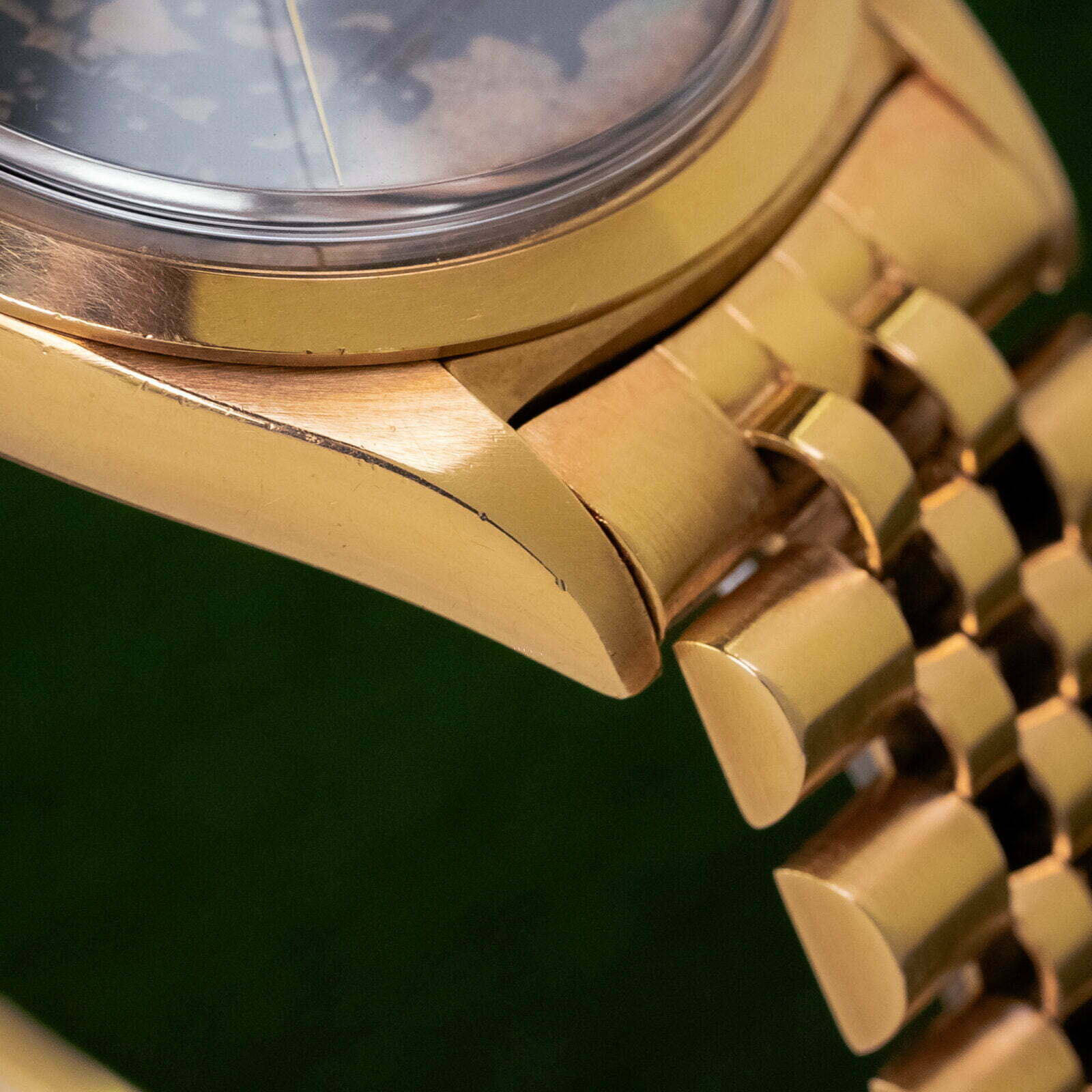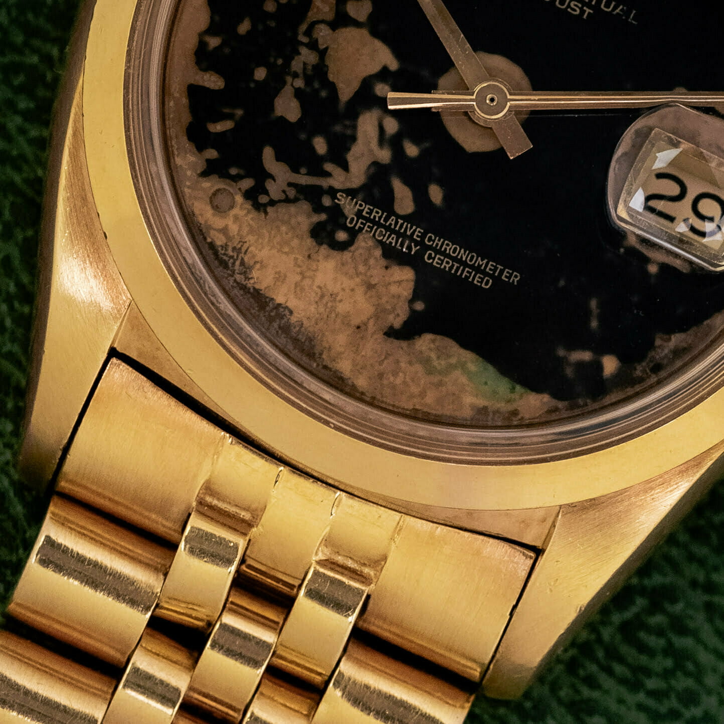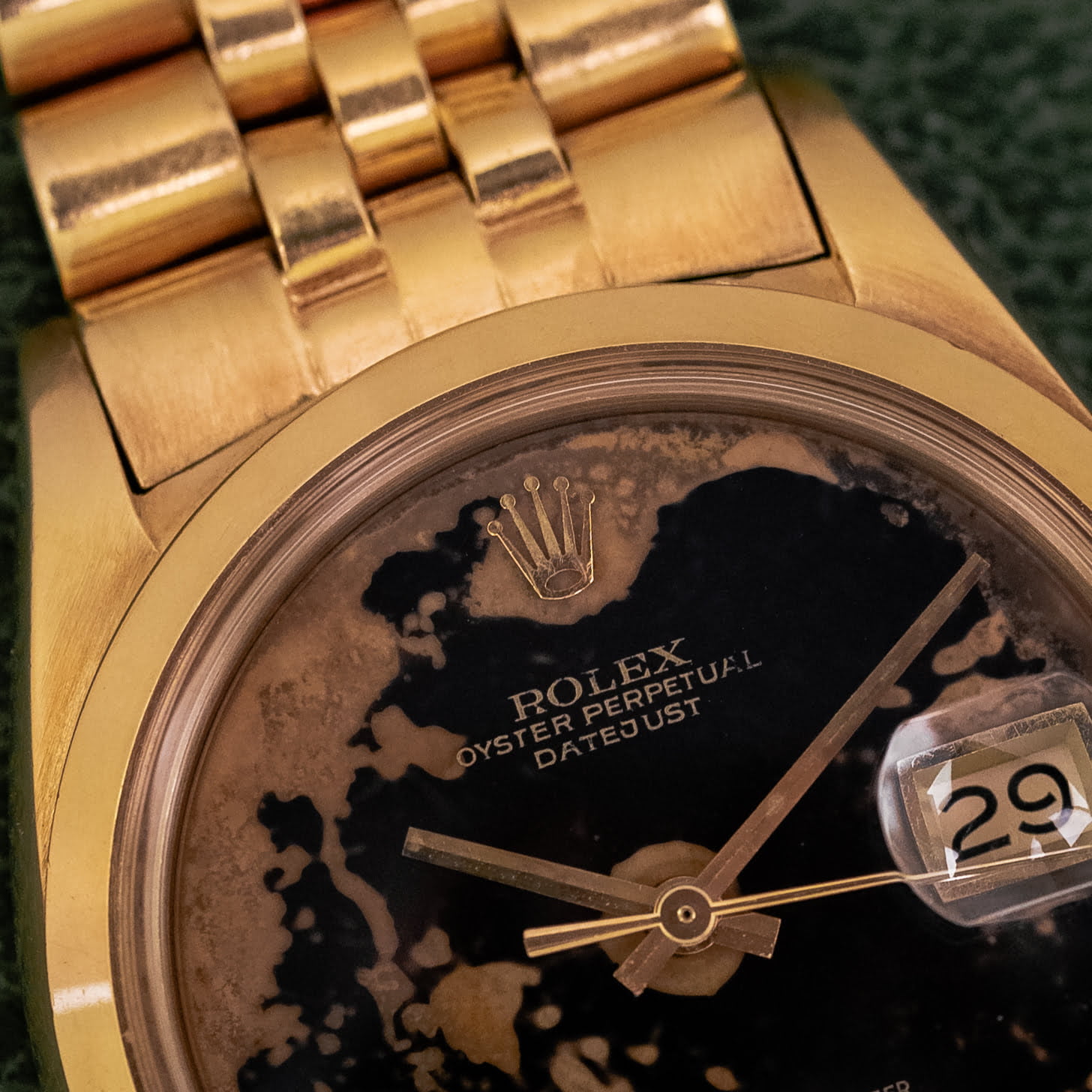 However, we are not entirely certain these dials are actually Obsidian. They just might be discoloured instead, caused by a chemical reaction of the base dial, perhaps in combination with the glue used to mount this slab. But there is no doubt this dial is rare, These crafty dials were only available for precious metal models, so it is housed in a 1600/8 which is rare in and of itself due the the smooth bezel. This yellow gold case dates back to 1972 and has a Jubilee bracelet -in matching metal- mounted on it.