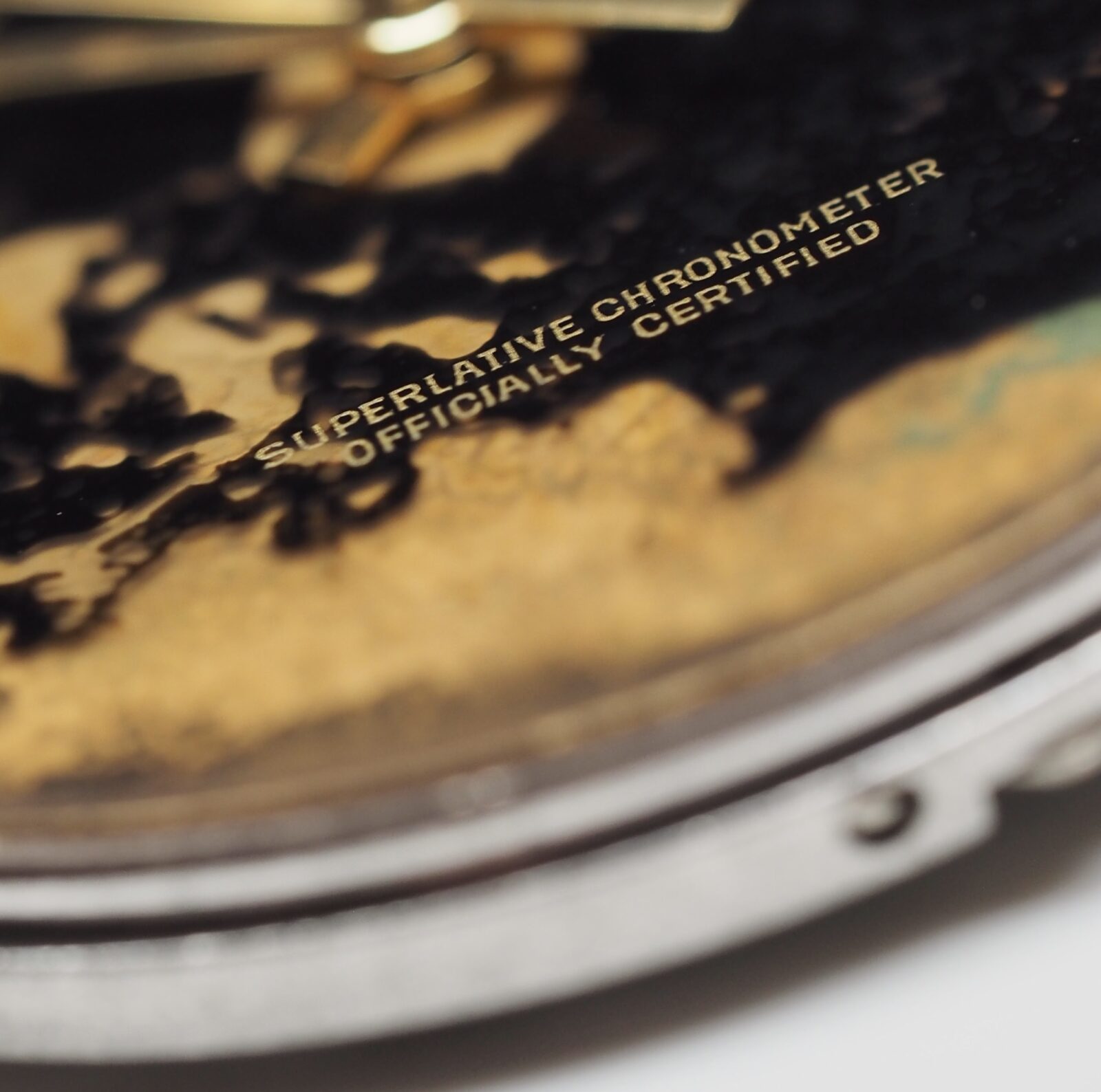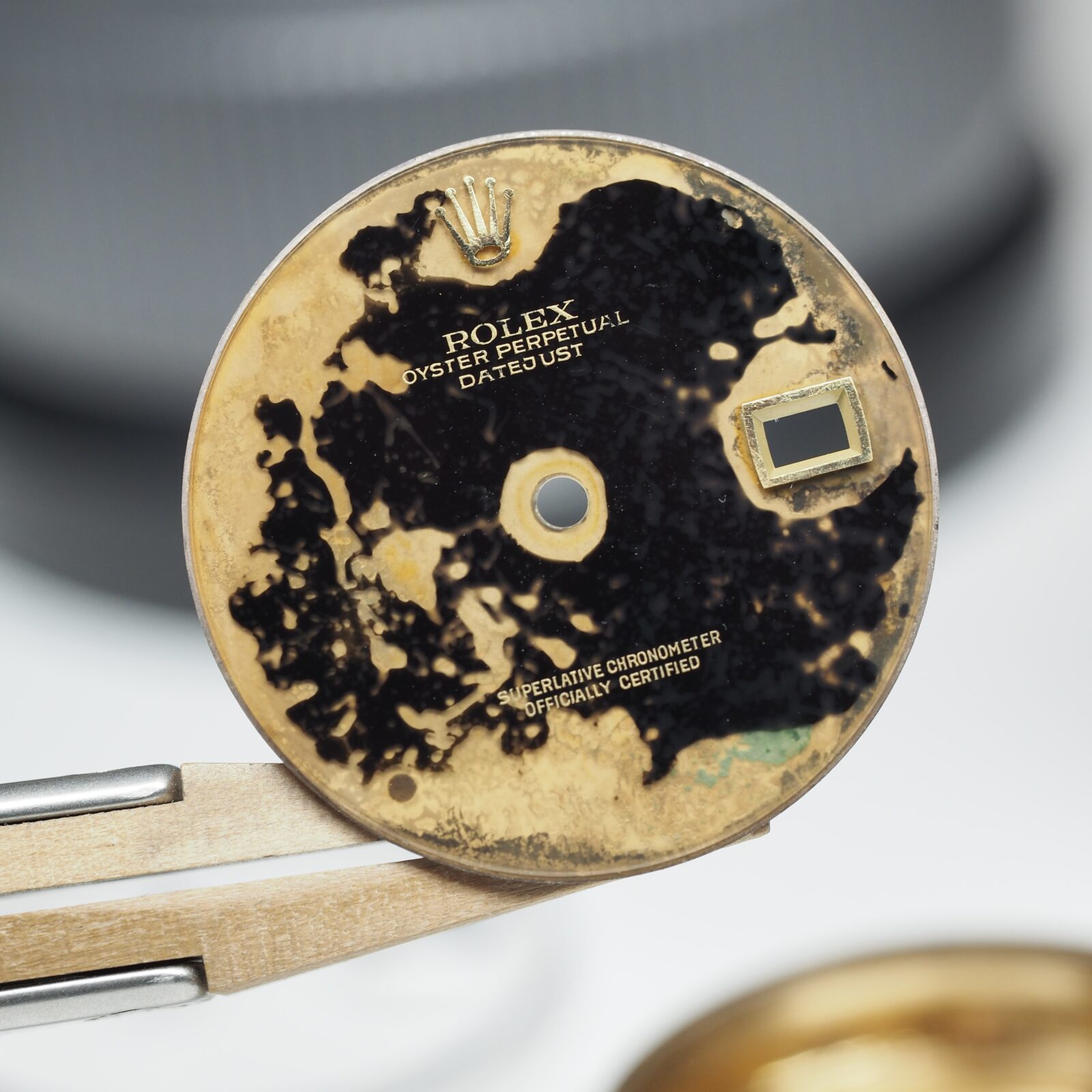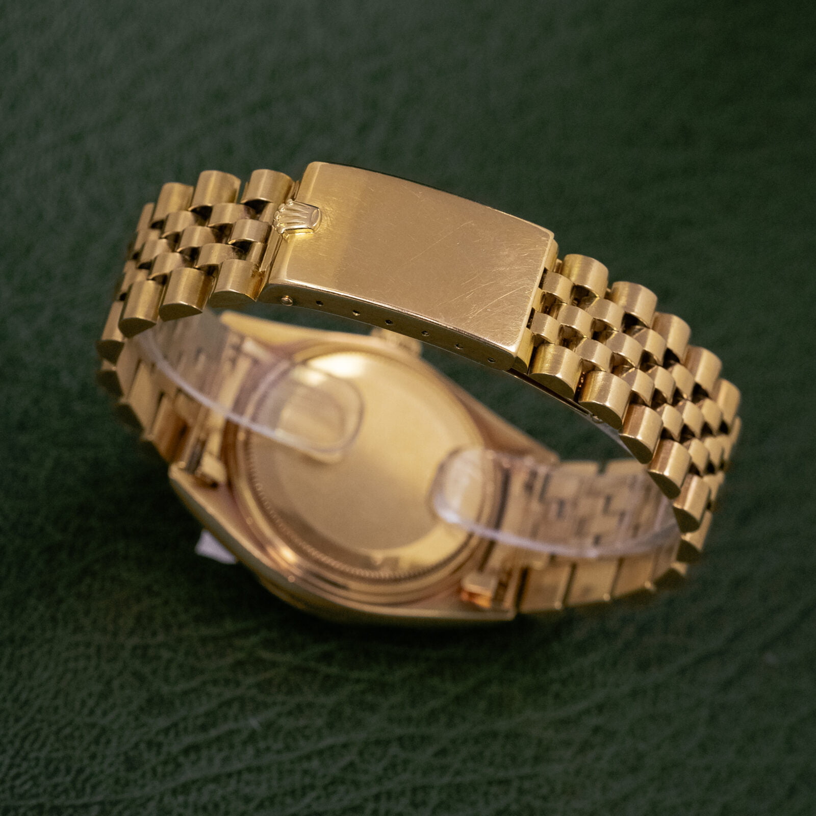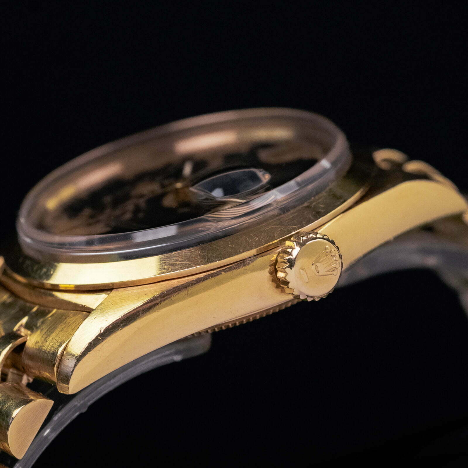 However, we are not entirely certain these dials are actually Obsidian. They just might be discoloured instead, caused by a chemical reaction of the base dial, perhaps in combination with the glue used to mount this slab. But there is no doubt this dial is rare, These crafty dials were only available for precious metal models, so it is housed in a 1600/8 which is rare in and of itself due the the smooth bezel. This yellow gold case dates back to 1972 and has a Jubilee bracelet -in matching metal- mounted on it.