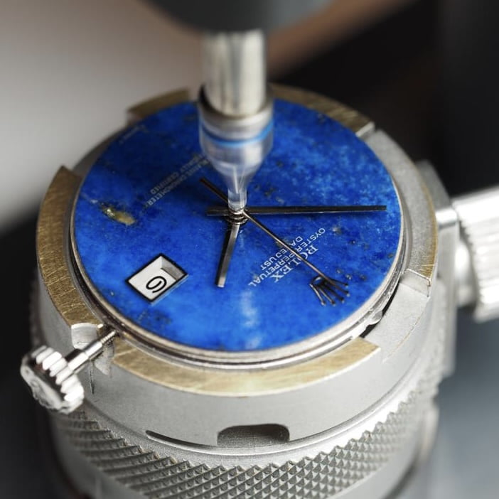 The condition of a stone dial is central to its desirability as such dials are quite fragile and many of them have developed cracks or rips over the years. Therefore, a flawless dial will increase the value greatly. This lapis dial is in excellent condition and features a beautiful and desirable lapis variation. In nature, lapis often occurs together with deposits of calcite (which shows as white veins in the stone) and pyrite (which look like gold veins). This dial contains barely any calcite deposits and features just a few strokes of pyrite, giving the dial a beautiful solid blue color.