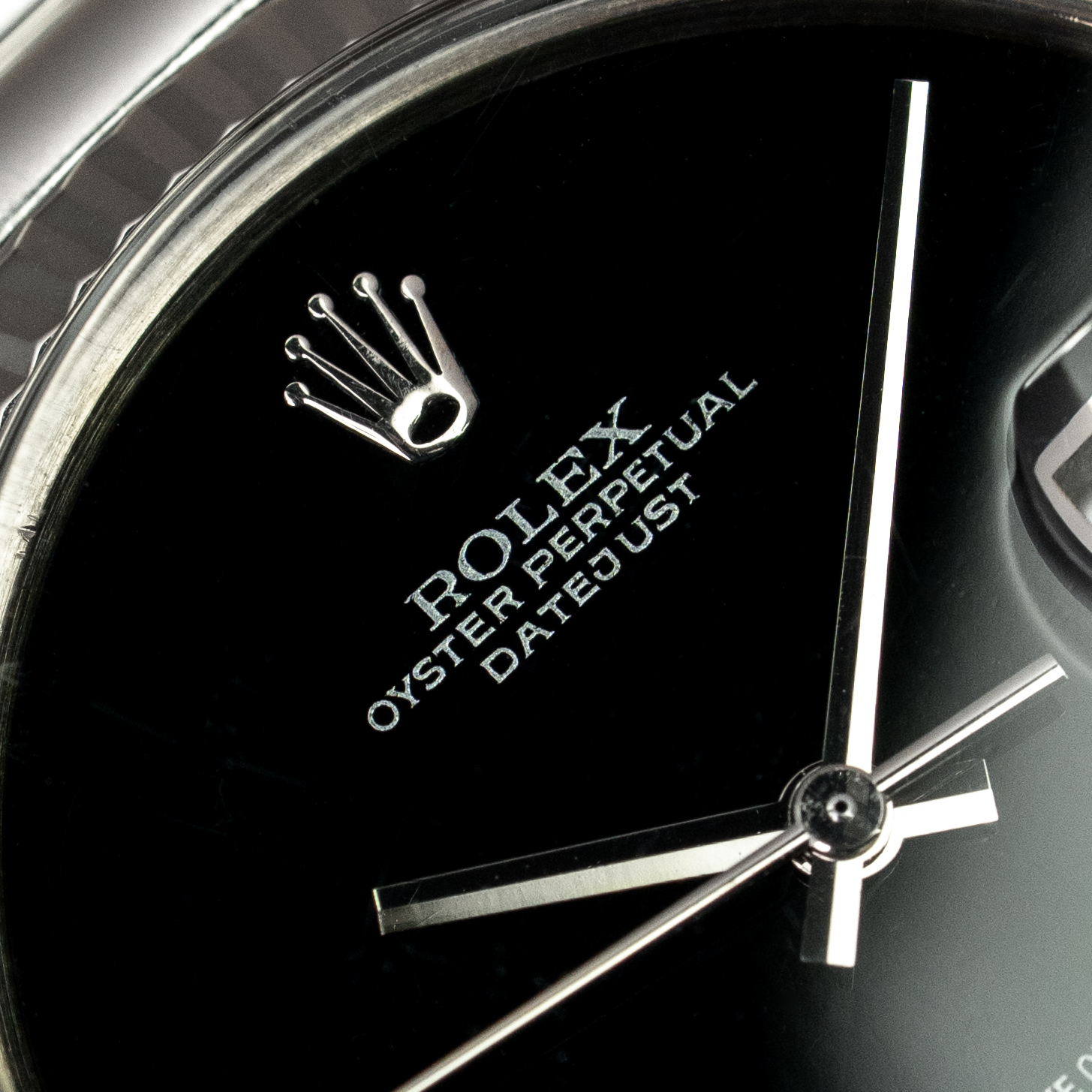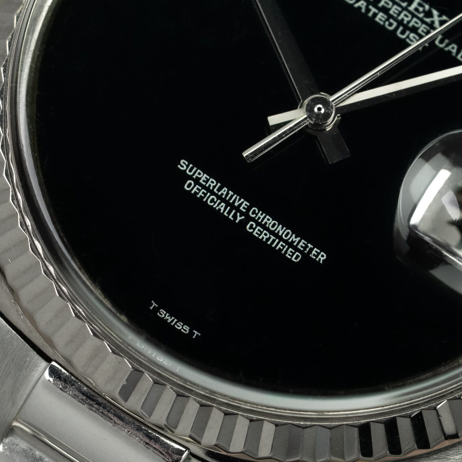Over the years we have handled many Datejust and Day-Date models with dials crafted from this striking stone. The depth of its jet-black surface and the complete absence of hour markers appeal to collectors who appreciate purity and simplicity. It is important to notice this dial has absolutely no imperfections. Meaning: the printing remains perfect and there are no cracks or hairlines. From time to time someone asks if Rolex ever produced Onyx dials specifically for white metal watches. The truth is that such pieces are almost impossibly rare. Fortunately, the almost impossible is exactly what we enjoy offering.