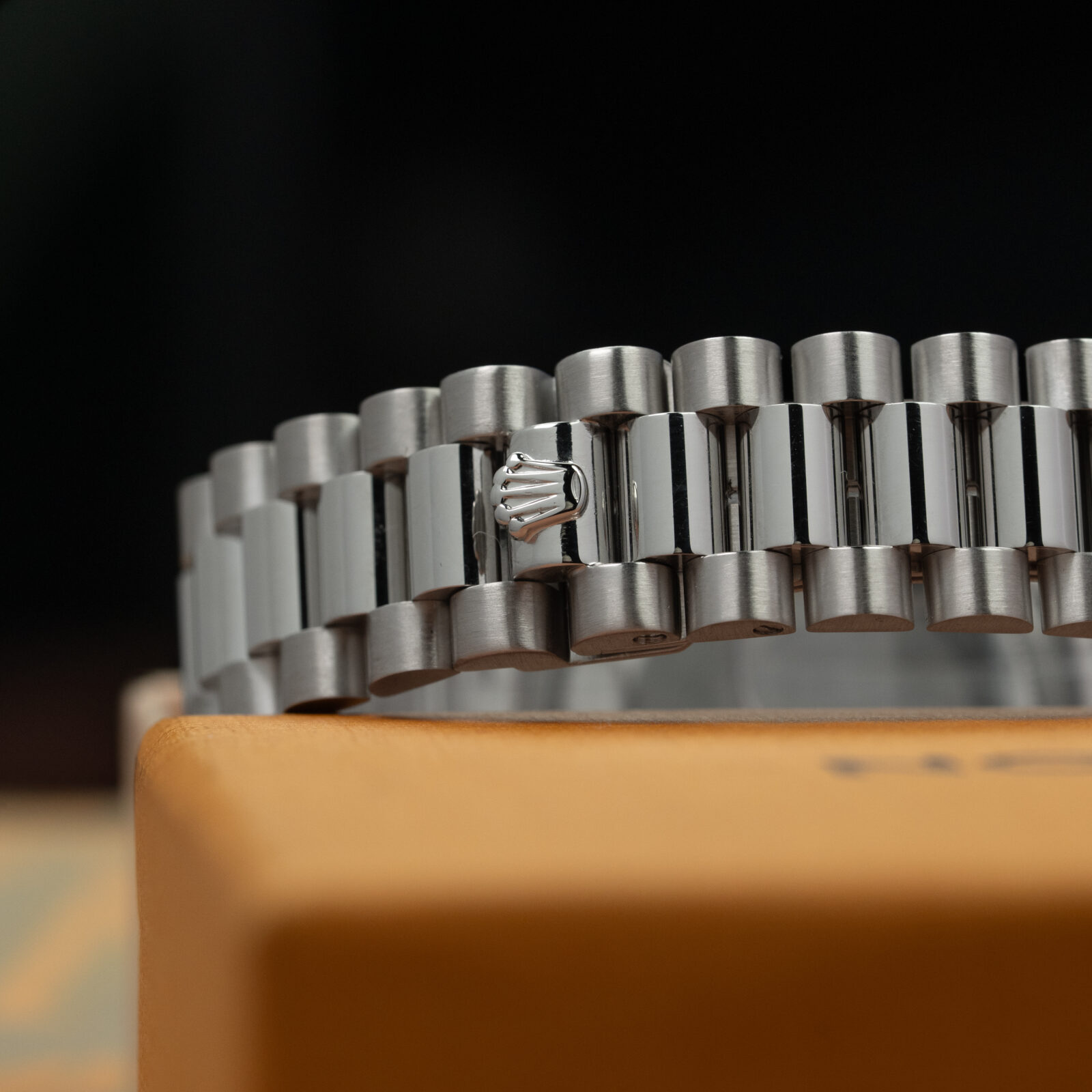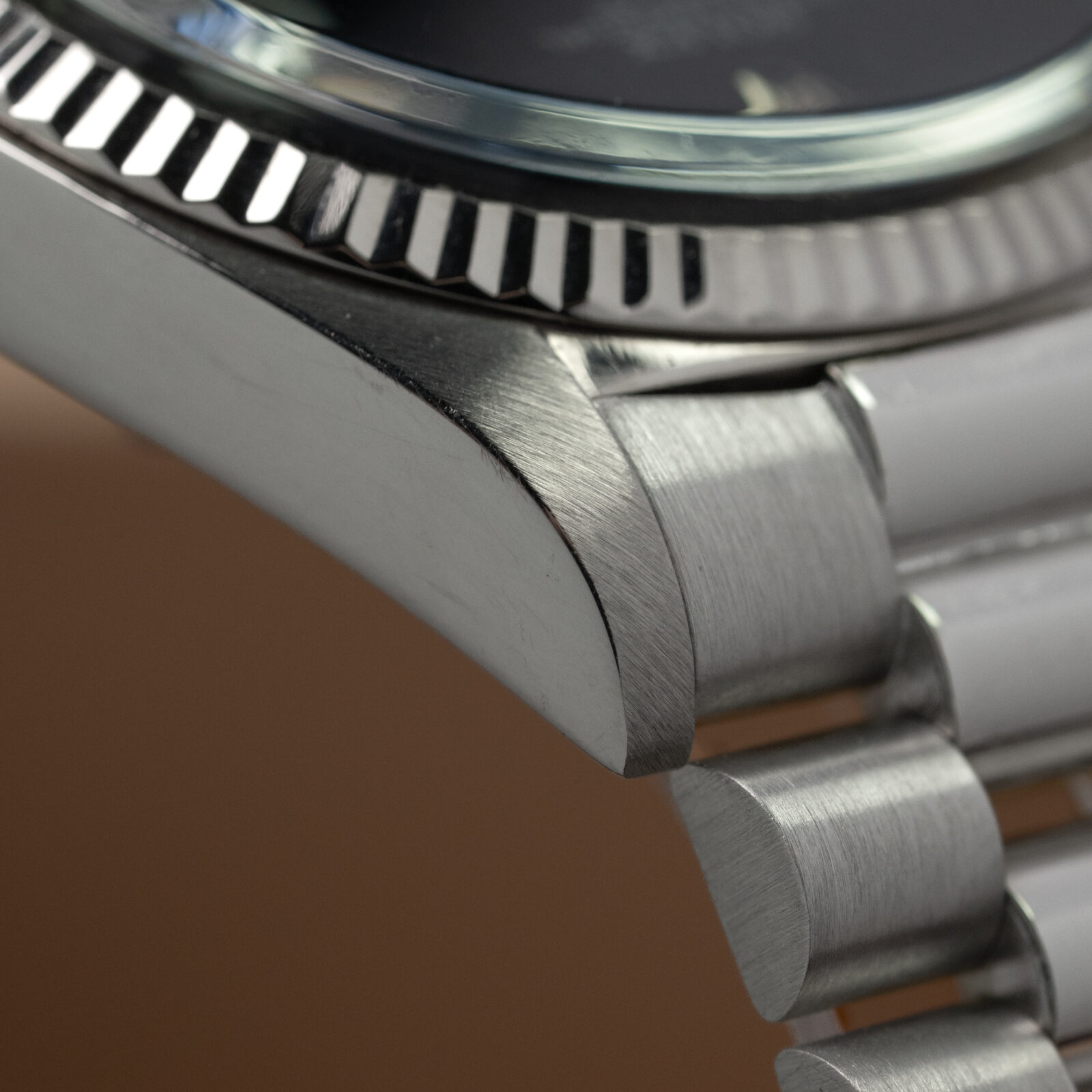 The case is strong, with thick, well-defined lugs and clearly visible hallmarks confirming its white gold construction. The President bracelet with concealed clasp is preserved in similarly impressive condition. The closed handset and white gold Twinlock crown are original and remain beautifully matched to the rest of the watch.