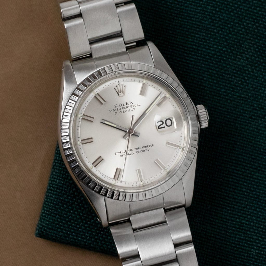 The Datejust 1603 is the perfect understated daily wear watch: timeless and suited for every occasion.There’s a reason the Datejust is the most recognizable Rolex model. It’s classic look has essentially remained unchanged for 75 years.This ref. 1603 Datejust from 1974 features an understated stainless steel engine-turned bezel. While the watch sports the classic silvered we have come to associate so closely with the Datejust, the extra wide 18k white gold markers and hands give the watch a 70s funky flair. Unsurprisingly, this detail is the reason for the charming ‘Wideboy’ moniker.The 1603 comes in a classically-sized 36 mm stainless steel case. The matching stainless steel Oyster bracelet gives the watch a clean and understated aesthetic.