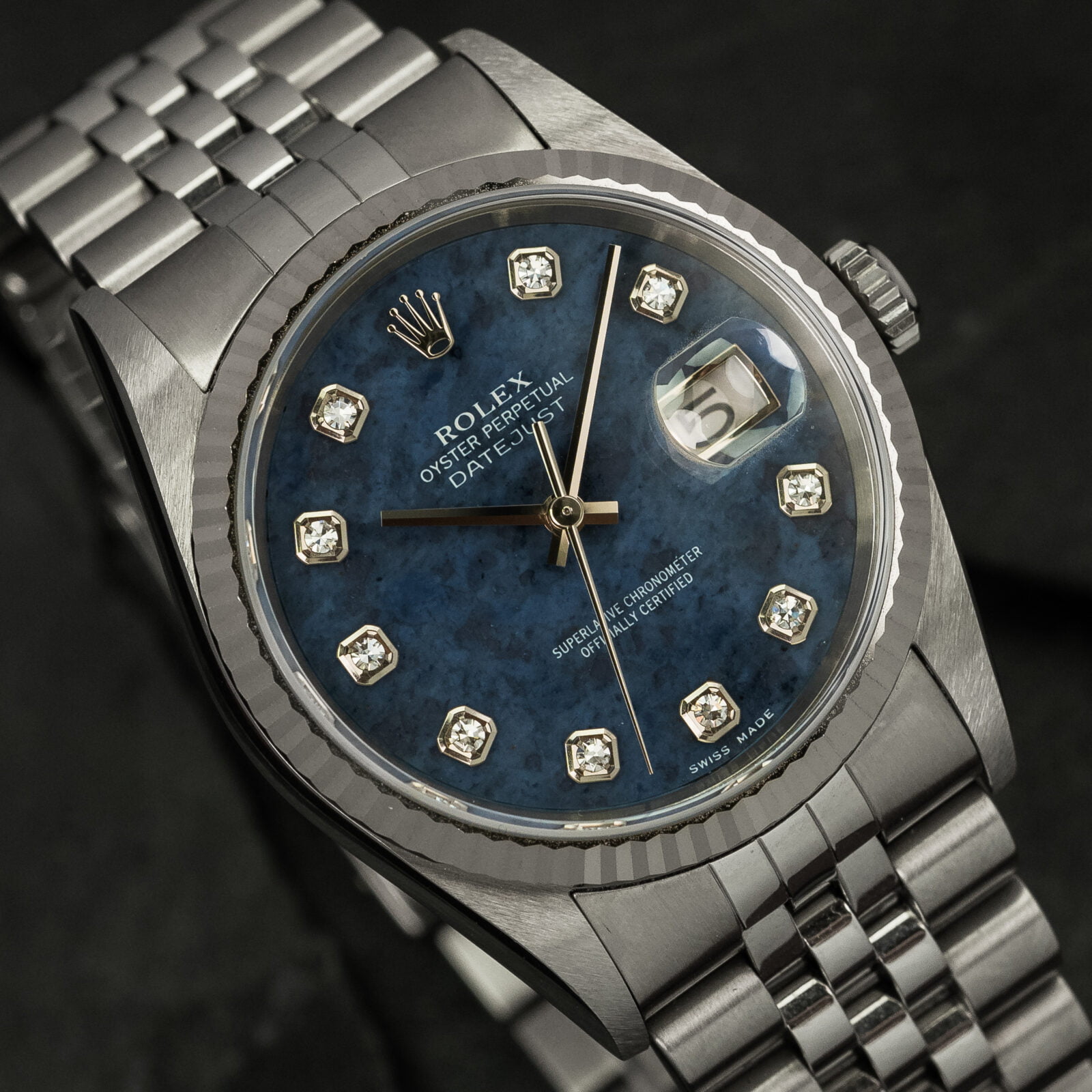 A Rolex Datejust by itself is a treat already and if you have been following us for a while you've probably seen some amazing pieces by now. However, this reference 16234 truly is something special! Why? Well, underneath the sapphire crystal, we find a rare stone dial made from sodalite and set with diamond indices. The dial is 100% flawless and has a very vibrant, denim-blue colour with an amazing amount of depth.