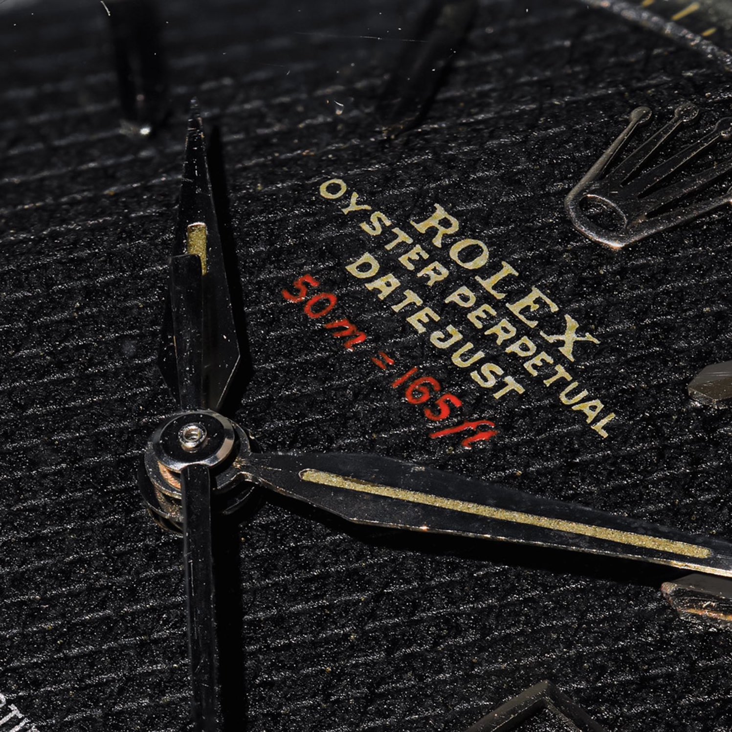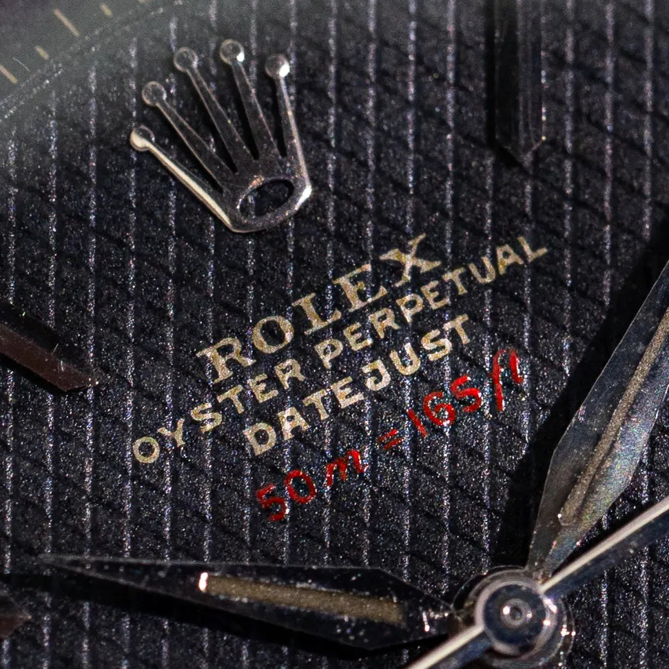 The dial is signed “Swiss” at the bottom and followed up on the “Swiss made” signature from earlier generation Datejusts. In the 50’s, before the use of the well-known “SCOC”, the dial of the Datejust reads “Officially Certified Chronometer” above the 6 o-clock position. Moreover, we can find a red depth rating being printed under the model name; a rarity which can be found on a very small batch of Oyster Perpetuals in the mid 50's. As far as we know, this is the only 6305-1 with black waffle dial to feature this oddity.