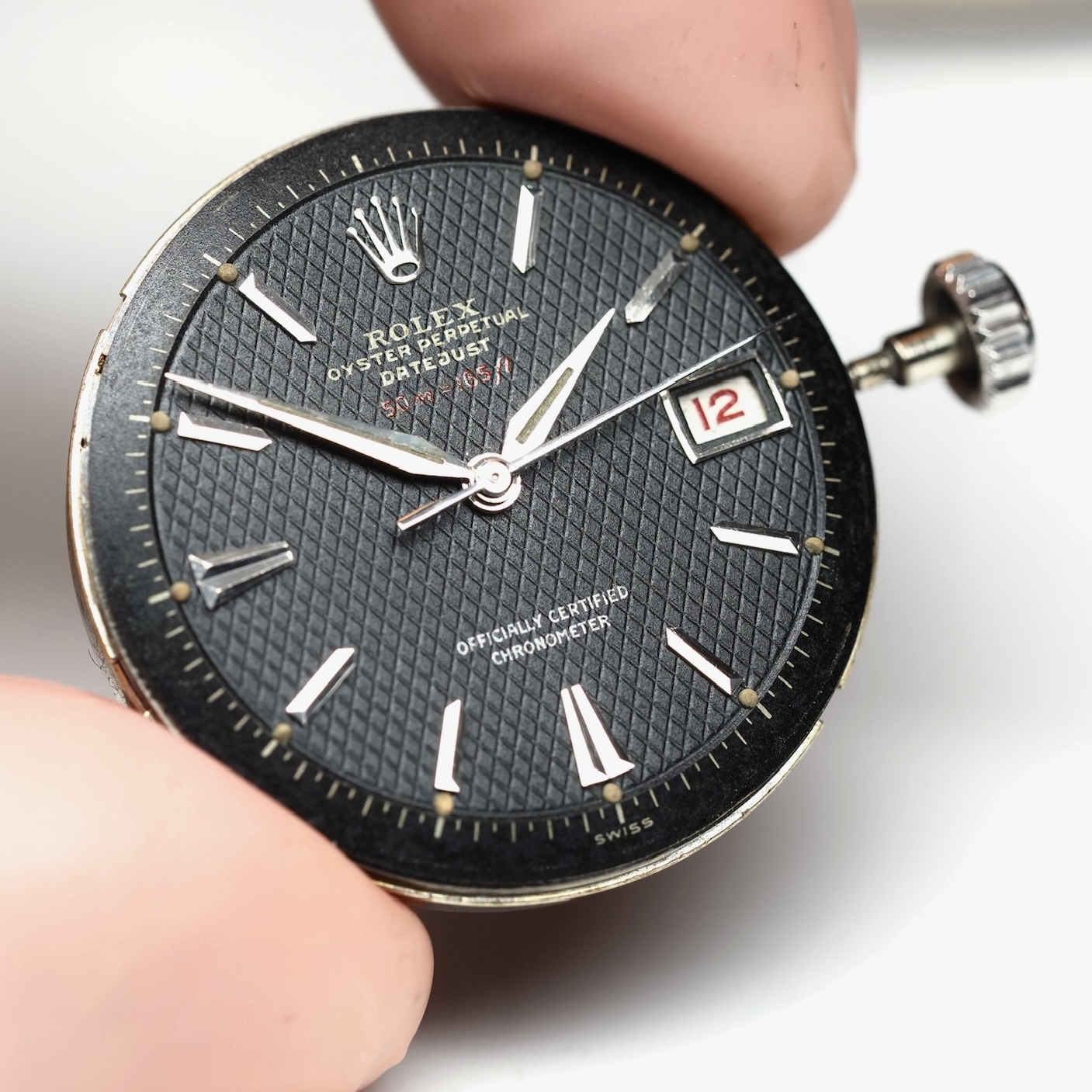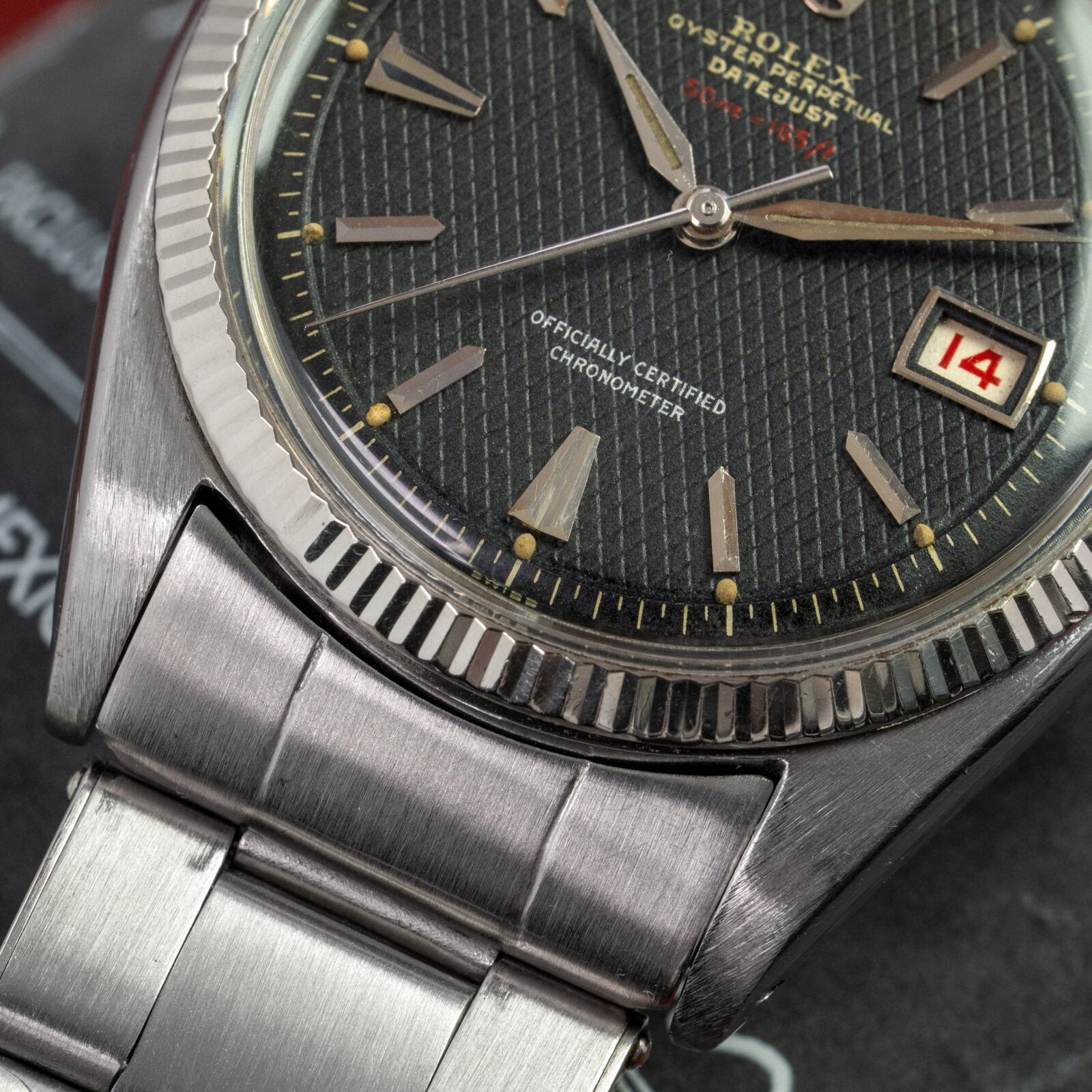 Installed is the most coveted type of dial, which isn’t one with a smooth surface but with a waffle motif instead; also known as “Honeycomb”. These are considered the pinnacle of steel Rolex Datejusts. Apart from the two color options, either white or this more sought-after black dial, there is also a variety in the cliché used. Besides the spacing and graphics of the font, the clearest difference can be found in the smooth outer track that has a soft “pie-pan” edge. (less angular compared to the 16xx series) One being divided into 5 segments per minute, this one into 10 segments per 5 minutes.