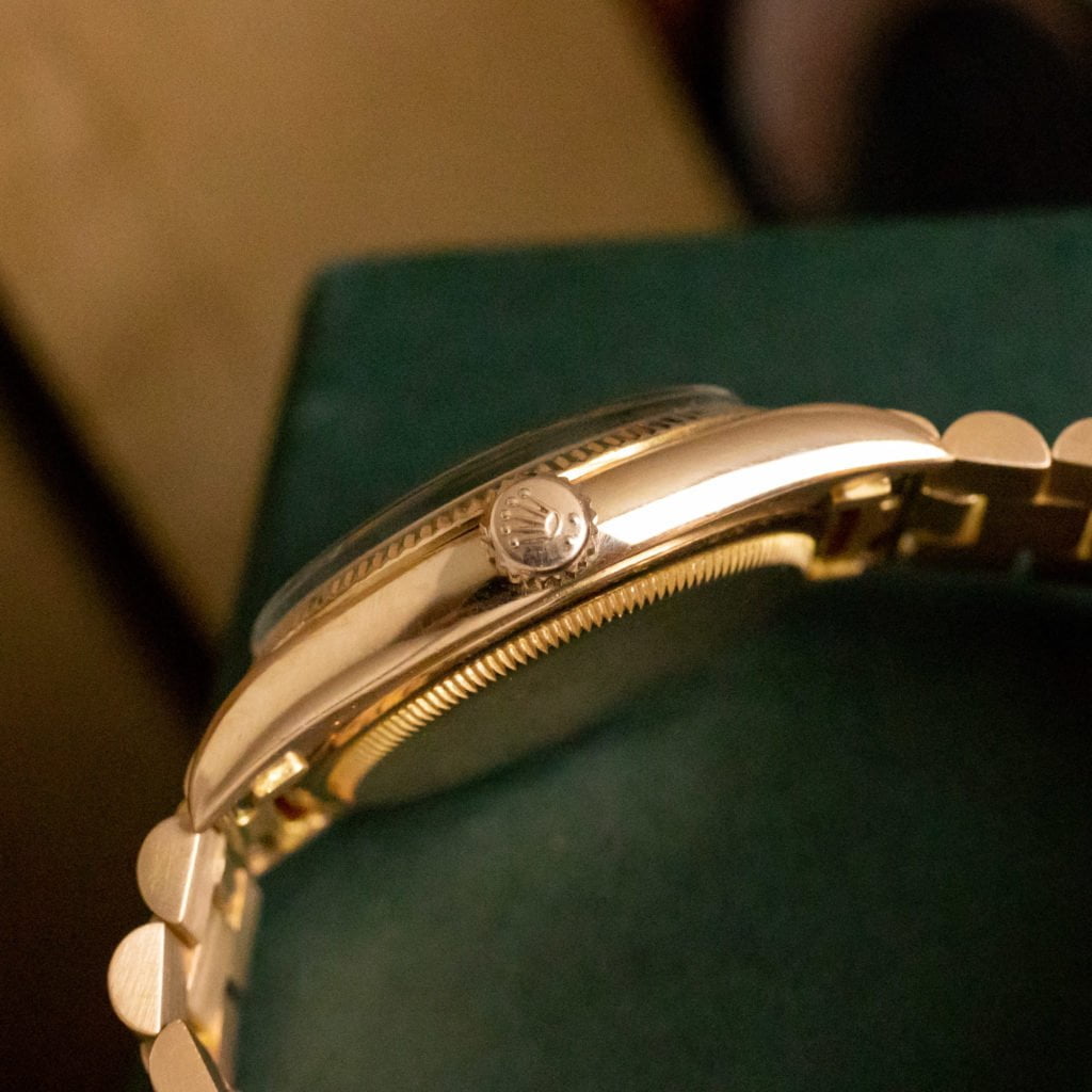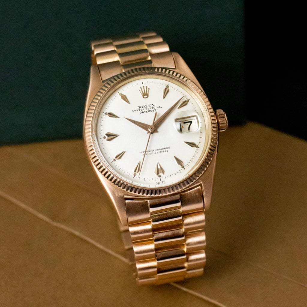 There are many amazing things on this fellow. First of all, this reference 6605 dating back to 1957 is carried out in 18k rose gold. This already is special as vintage, rose-gold Rolex watches are quite rare. Especially, a 6605 in rose gold is something we don't see that often. Second, instead of a leather strap or Jubilee bracelet it comes on an 18k rose-gold Rolex President bracelet. However, as French fashion designer Hubert de Givenchy once said: "Luxury is in each detail." The same is true for this amazing Rolex Datejust. The details we love are the roulette date disc, arrowhead markers, leaf hands and lightly patinated dial! The last Ovettone we featured was gone way too soon. We are not expecting to have any trouble finding a new owner for this one.