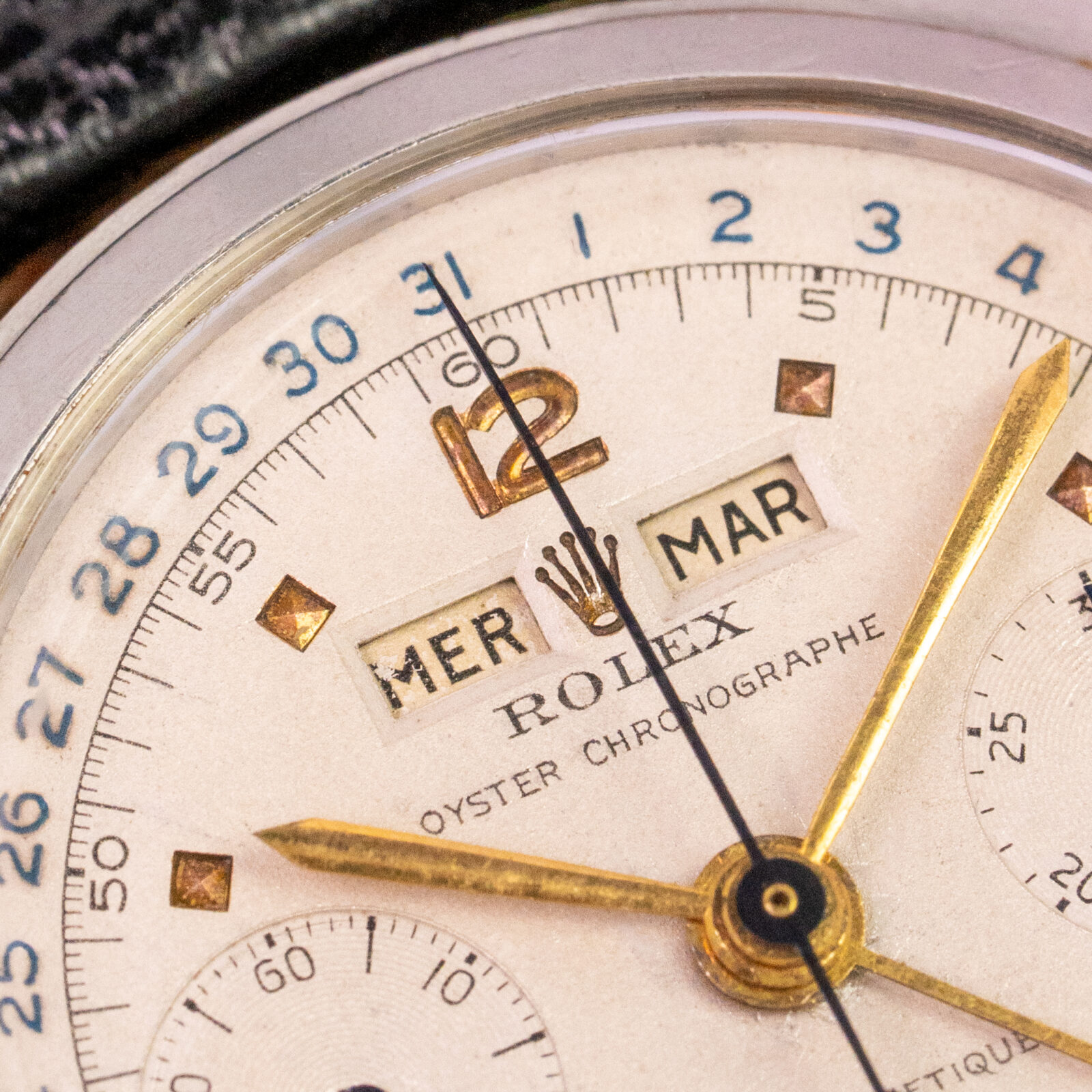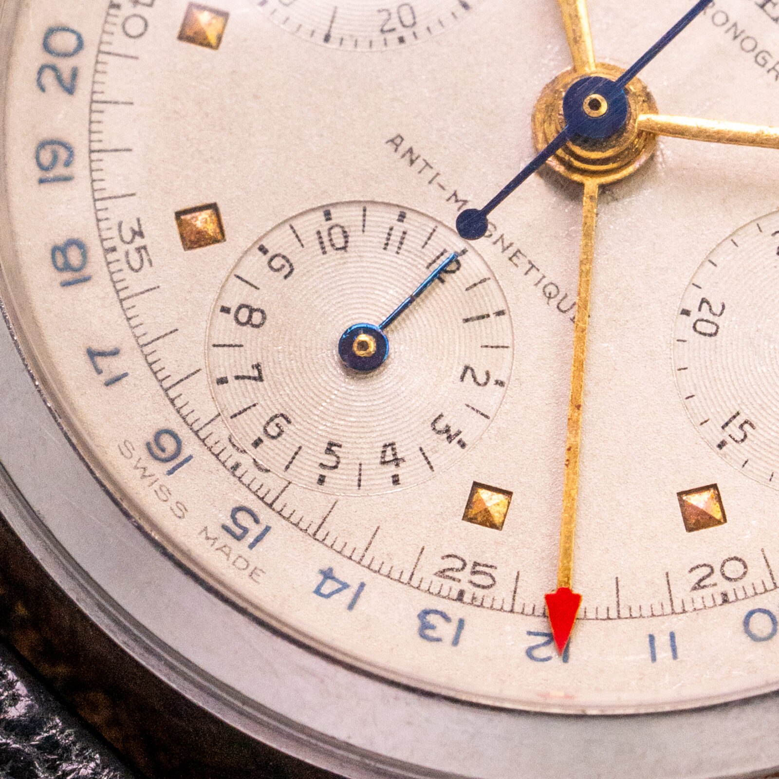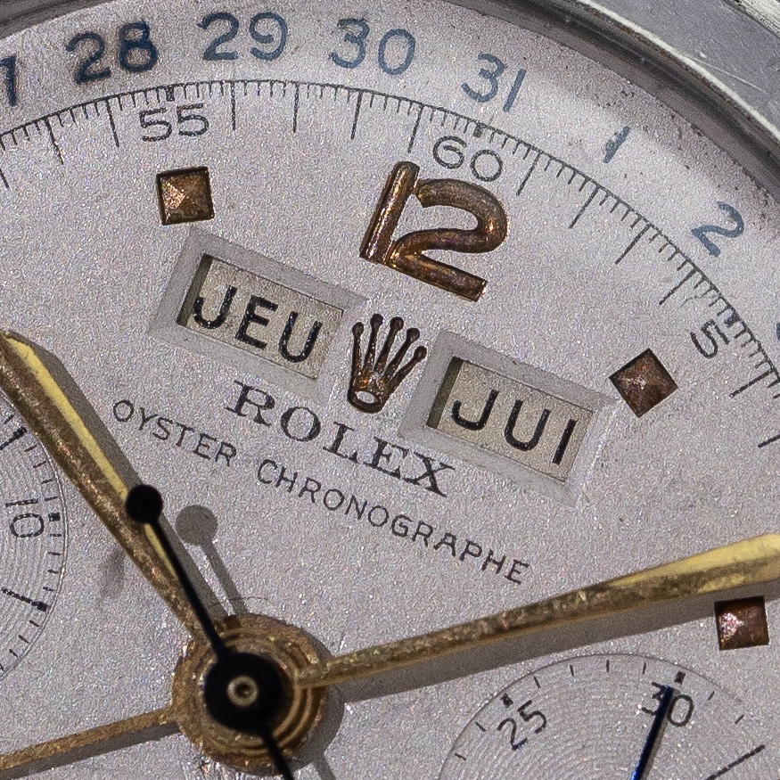The dial is unrestored and remarkably charming. The grené finish gives it a warm aura, enhanced by the sunken coronet and gold pyramid markers. The chronograph hands and pointer date are in blued steel, complimenting the blue printing on the periphery of the dial. Just like the calendar wheels, that are displayed in apertures on each side of the coronet, the language used on the dial is in French; hence one reads "Chronographe" underneath the brandname and " Anti-magnetique" above the hourtotalizer.