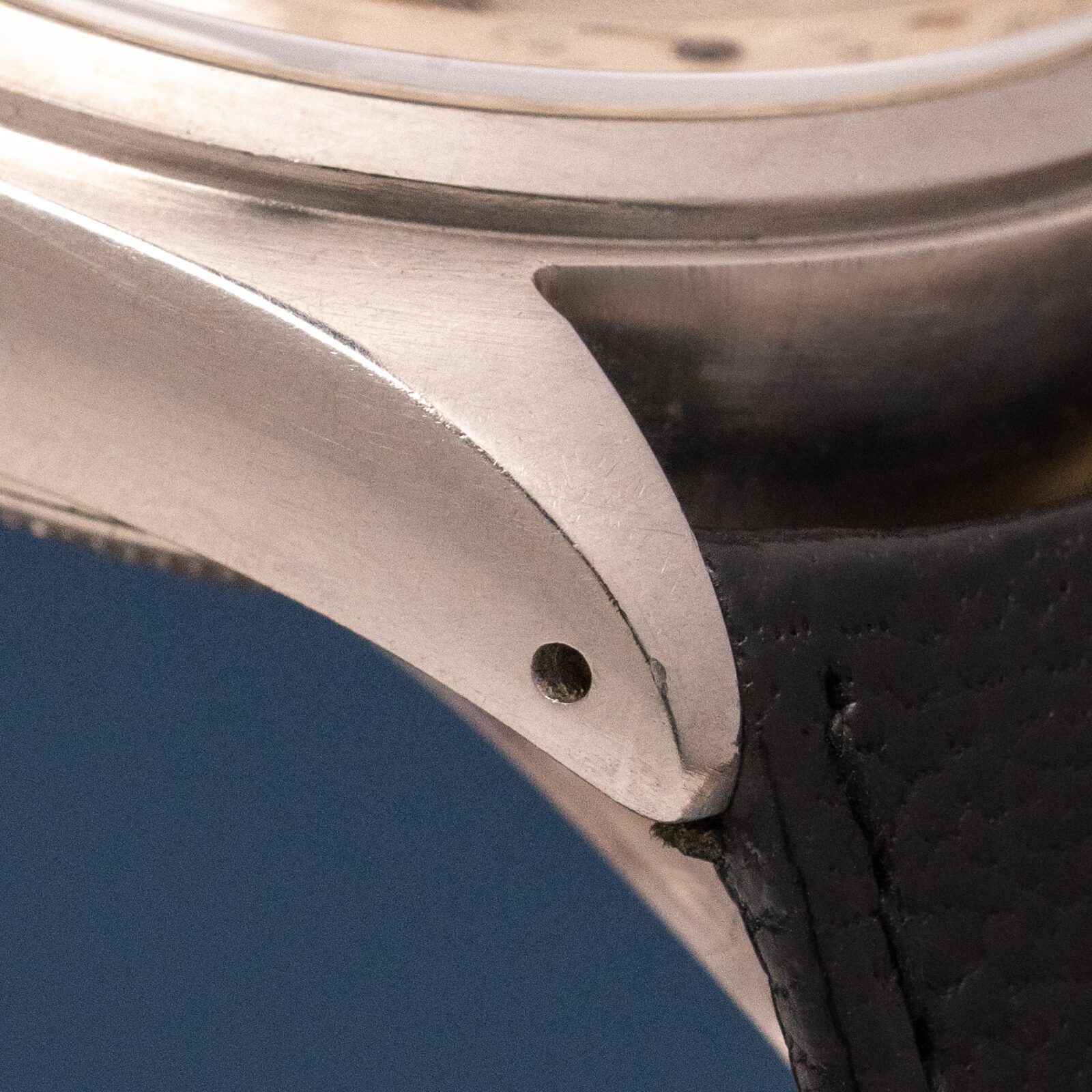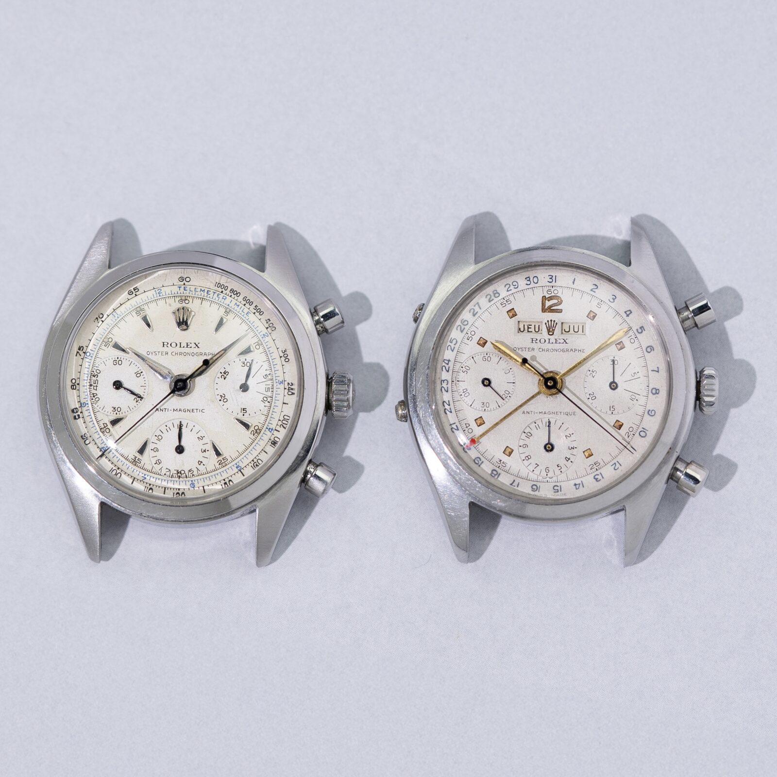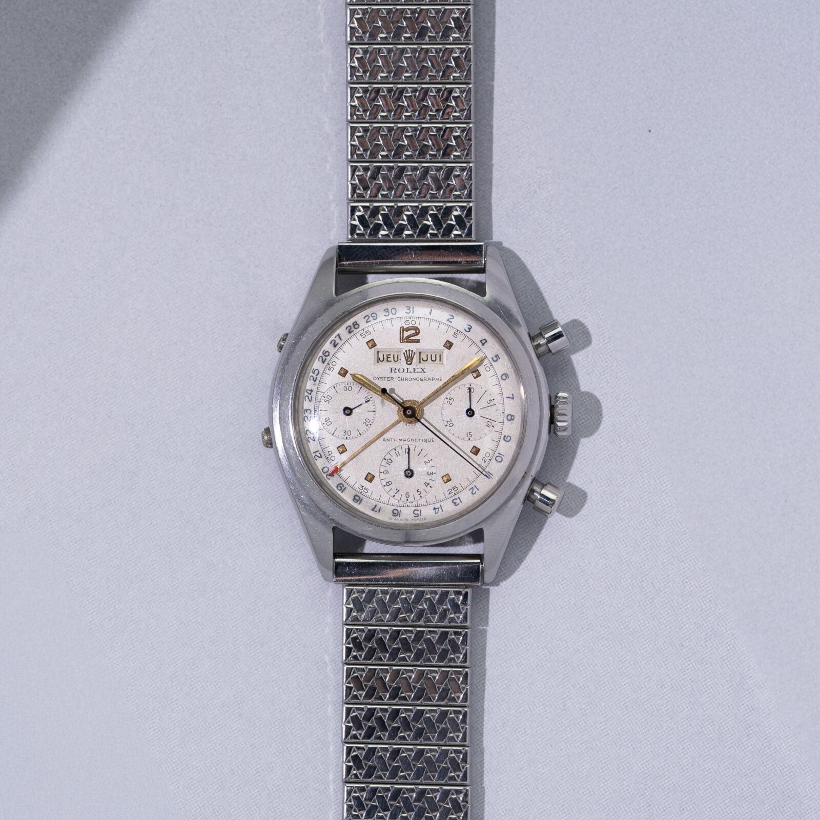 The dial is unrestored and remarkably charming. The grené finish gives it a warm aura, enhanced by the sunken coronet and gold pyramid markers. The chronograph hands and pointer date are in blued steel, complimenting the blue printing on the periphery of the dial. Just like the calendar wheels, that are displayed in apertures on each side of the coronet, the language used on the dial is in French; hence one reads "Chronographe" underneath the brandname and " Anti-magnetique" above the hourtotalizer.