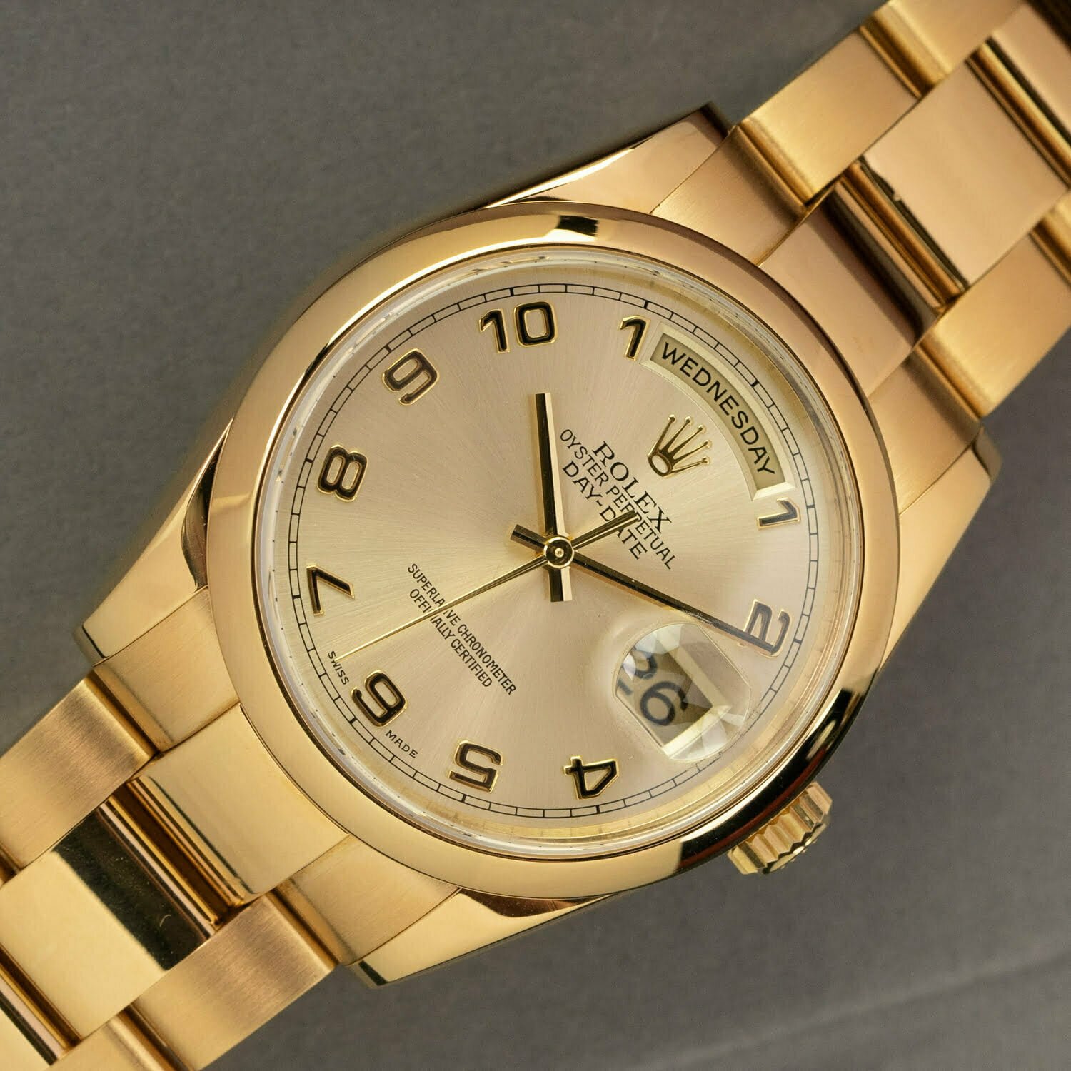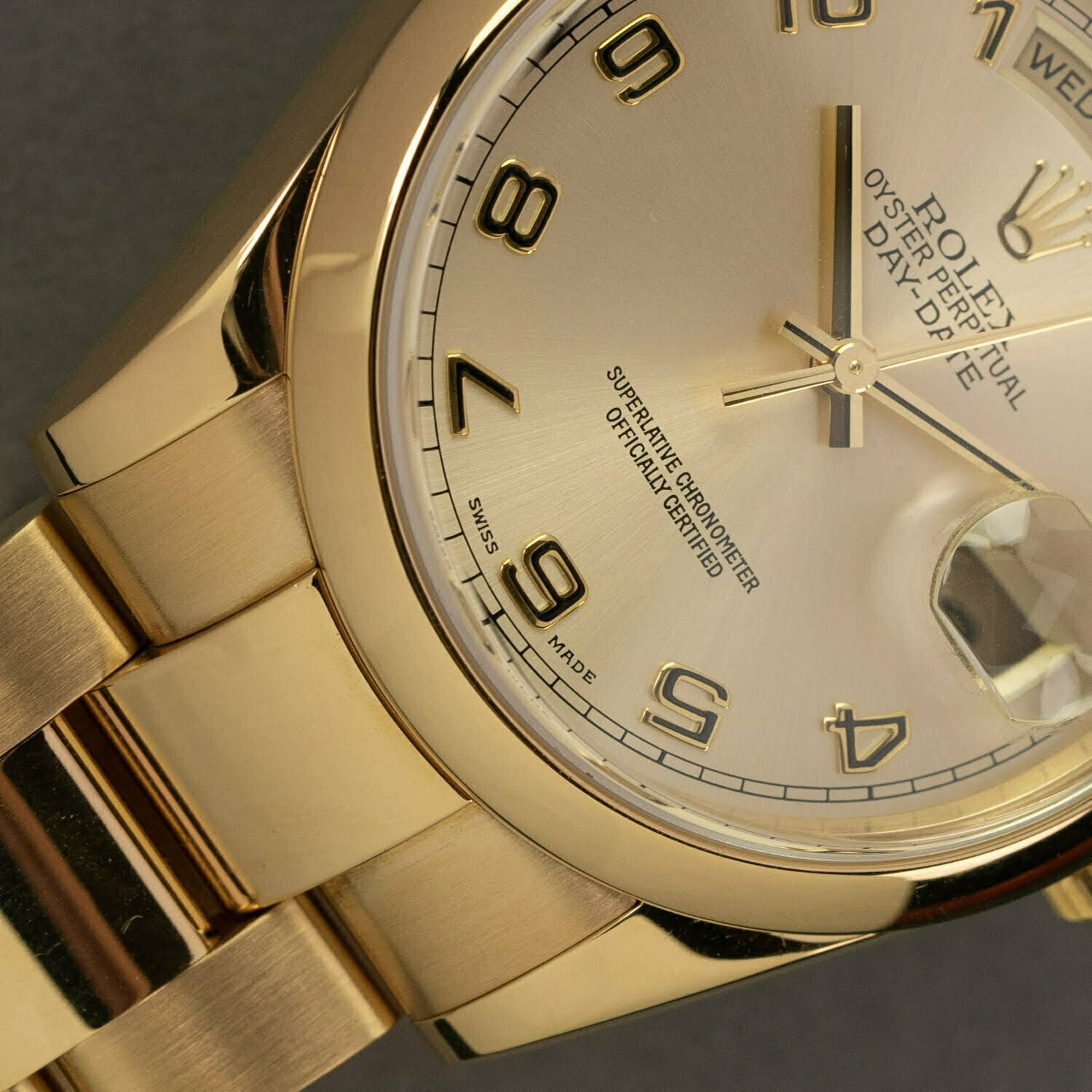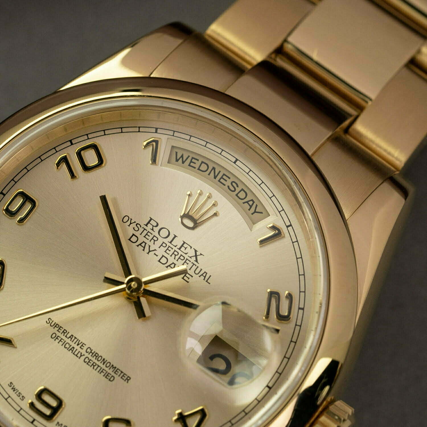 The Day-Date comes in many varieties. The reference 118208 indicates that this watch has a domed bezel. Instead of a President bracelet like most Day-Dates, it comes on an 18k yellow-gold Oyster bracelet with concealed clasp. This bracelet was only made for this reference and is not in production anymore. The dial on this Rolex is also really cool: it's champagne with yellow-gold Arabic numerals. All together it makes this watch look awesome!