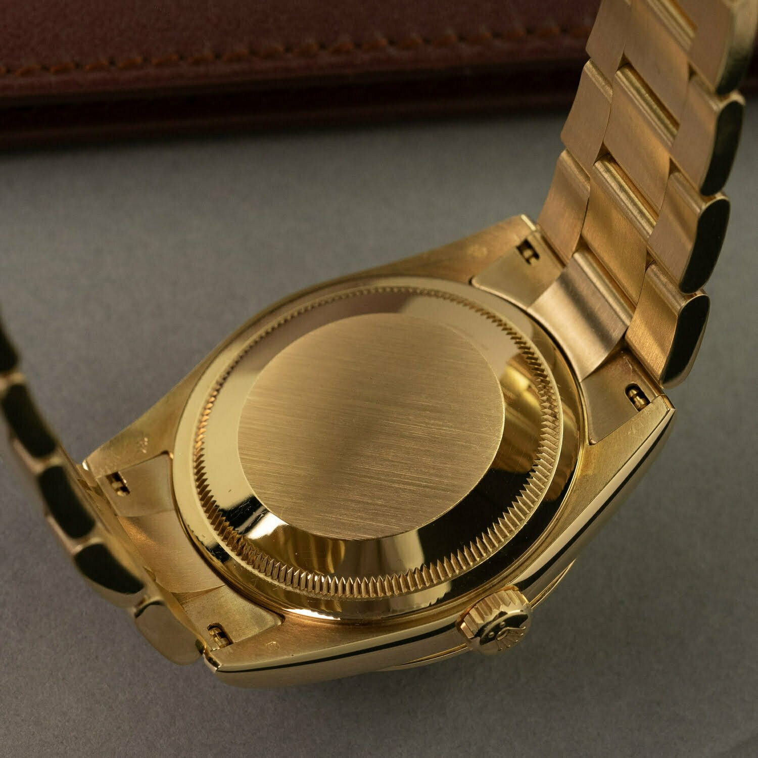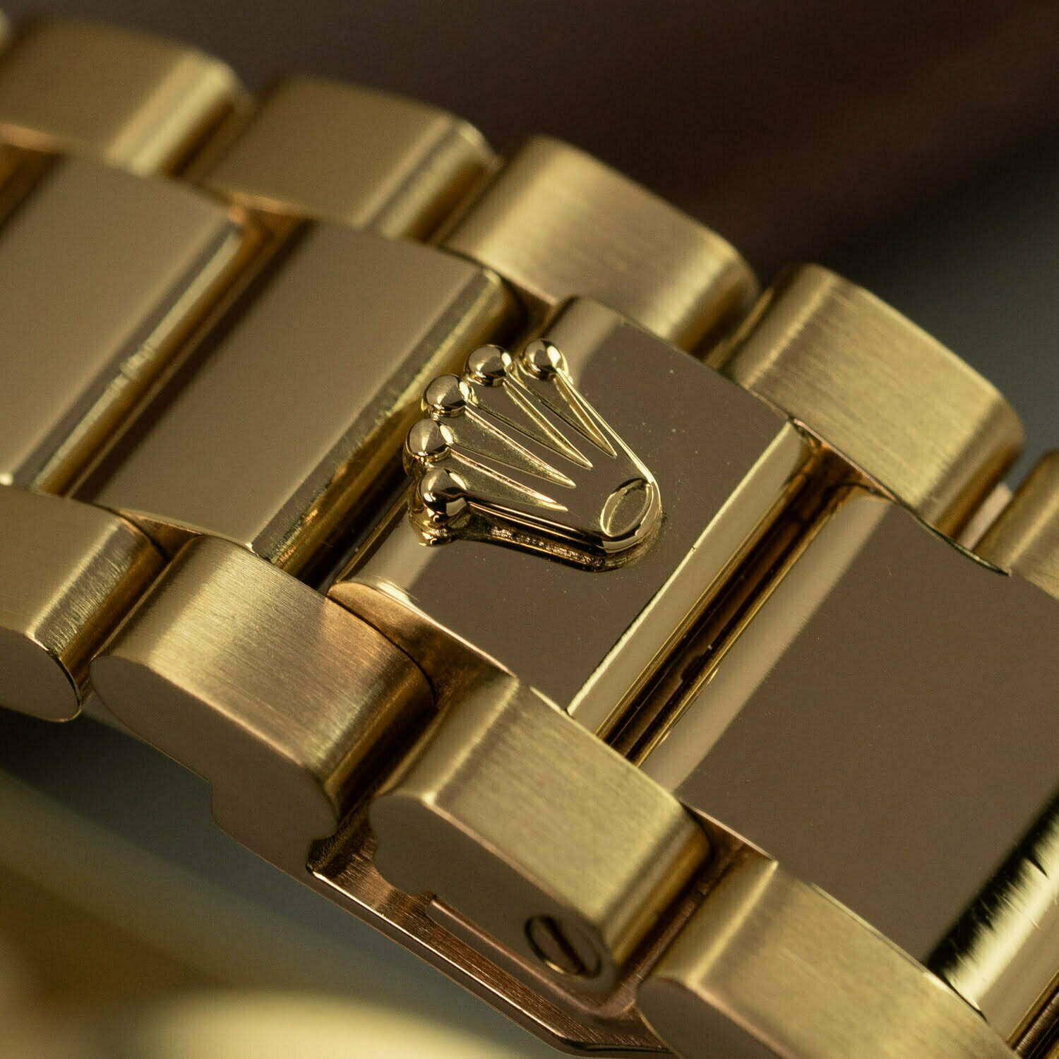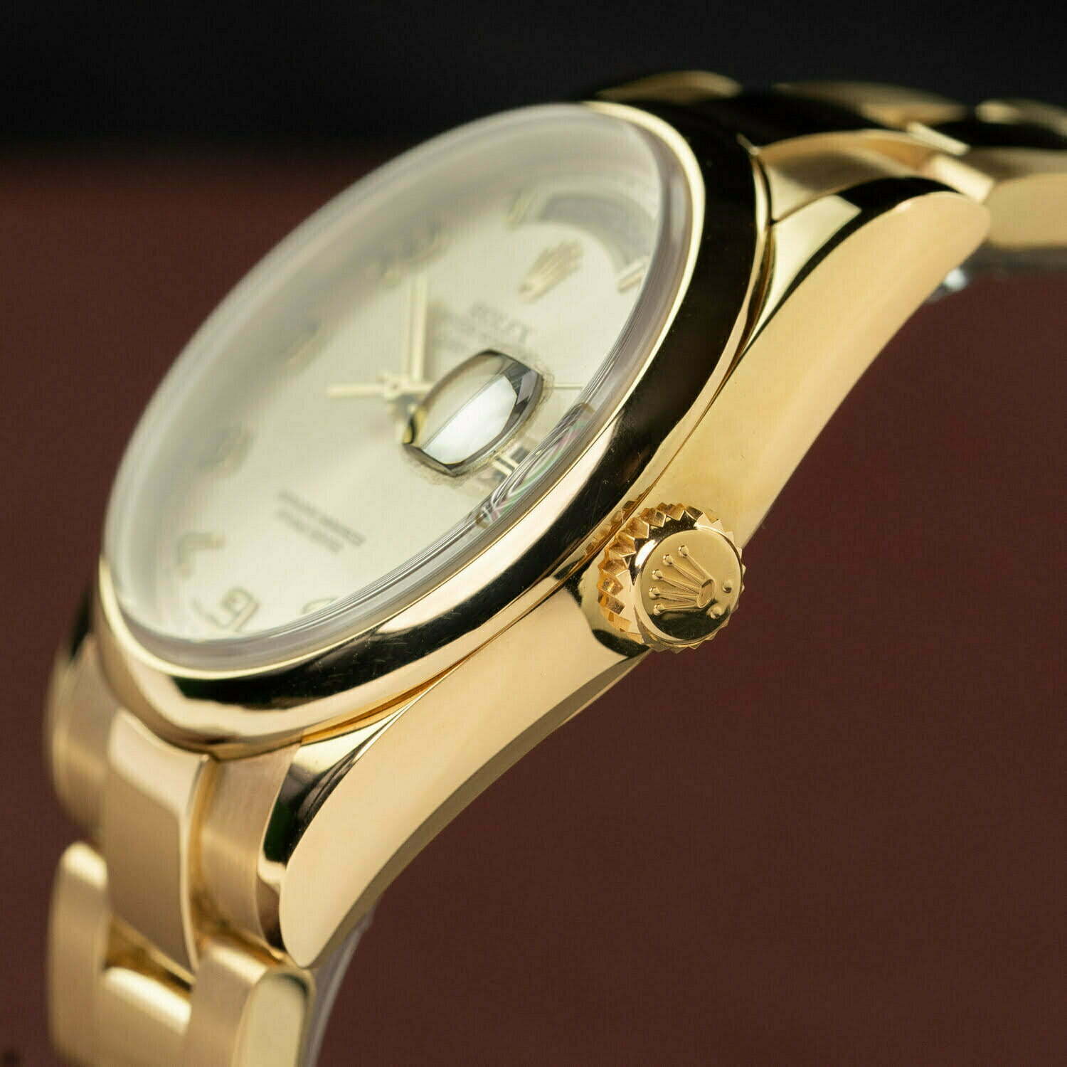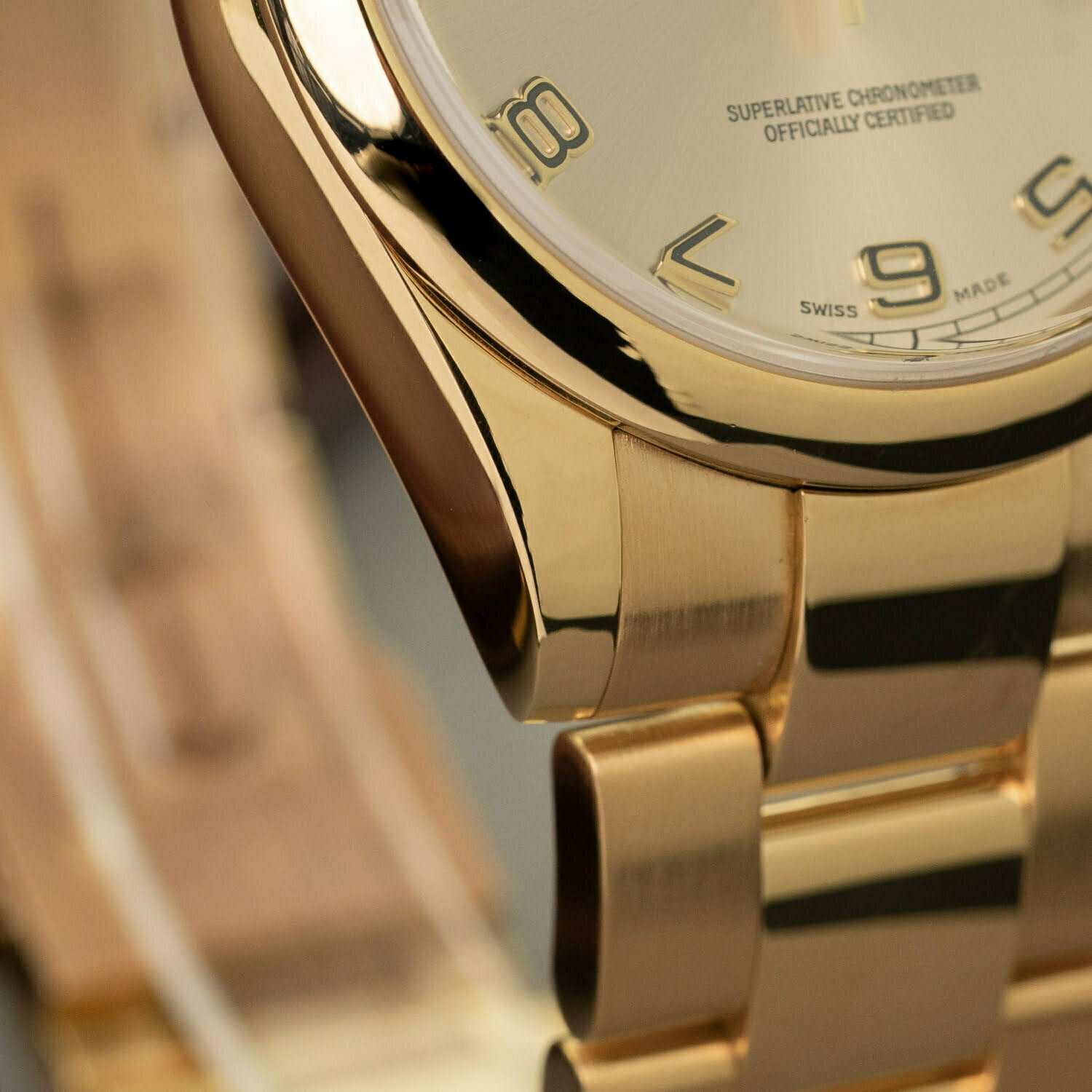 The Day-Date comes in many varieties. The reference 118208 indicates that this watch has a domed bezel. Instead of a President bracelet like most Day-Dates, it comes on an 18k yellow-gold Oyster bracelet with concealed clasp. This bracelet was only made for this reference and is not in production anymore. The dial on this Rolex is also really cool: it's champagne with yellow-gold Arabic numerals. All together it makes this watch look awesome!