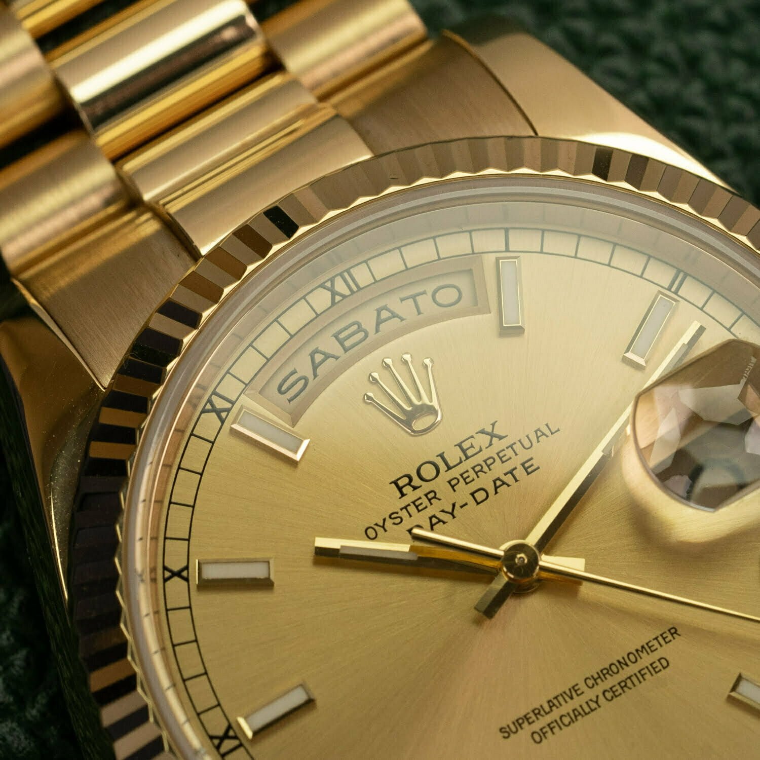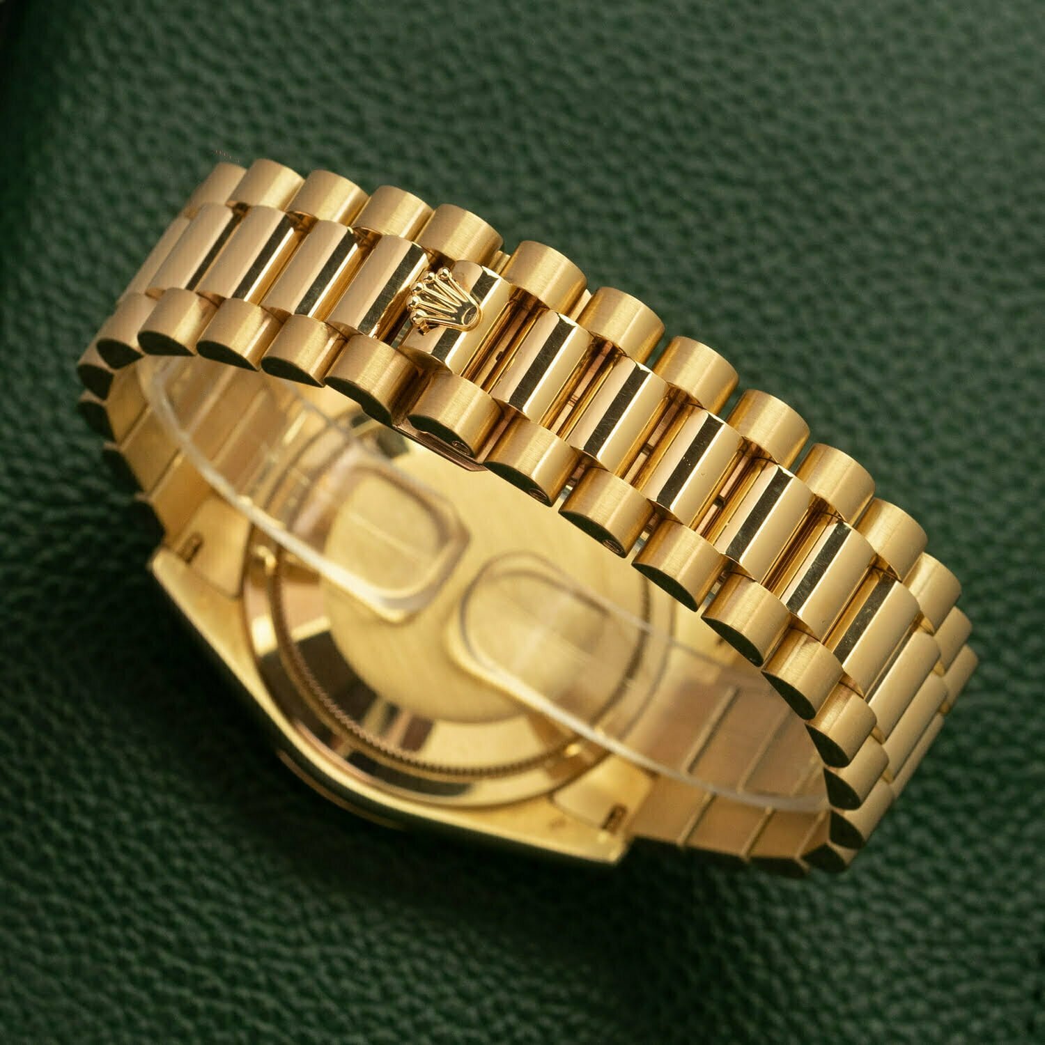 This ref. 11238 dates back to 2003 and comes in the classic Day-Date packaging: a 36 mm 18K yellow-gold case, an 18K yellow gold fluted bezel, and the iconic 18K yellow gold President bracelet. The watch features a classic champagne dial with applied 18K yellow-gold baton markers and a printed closed minute track with Roman numerals at the 5-minute intervals.