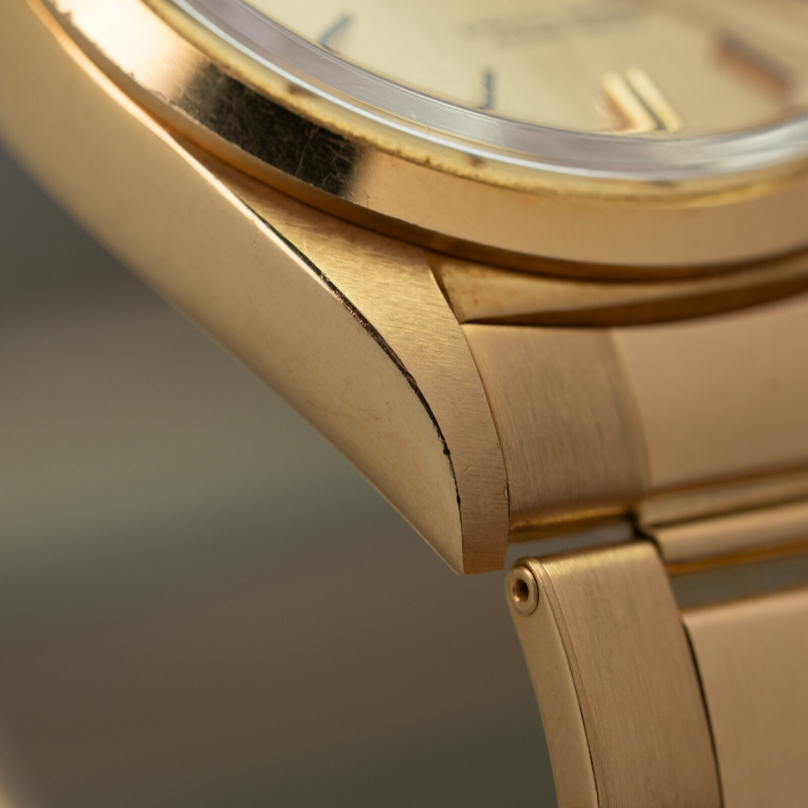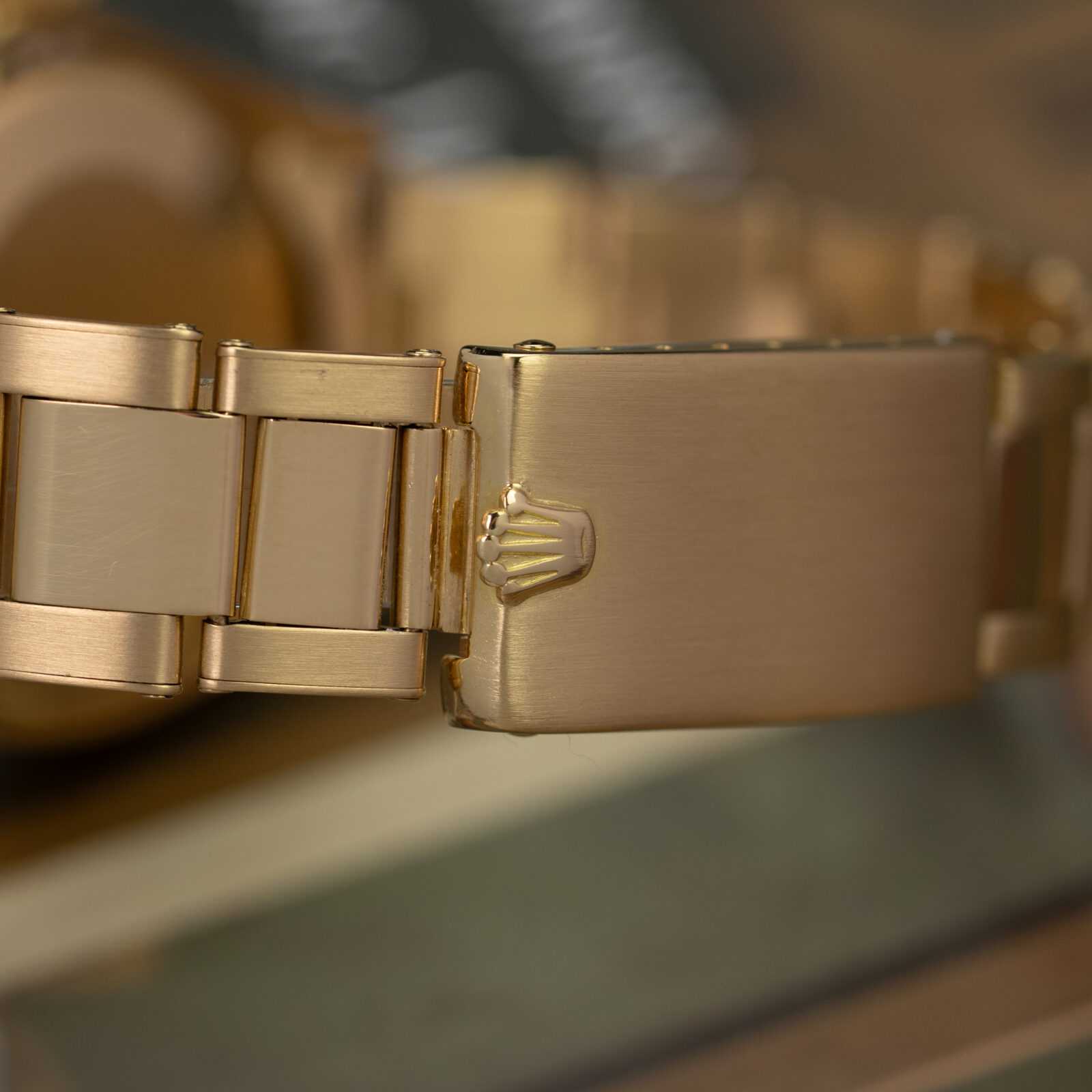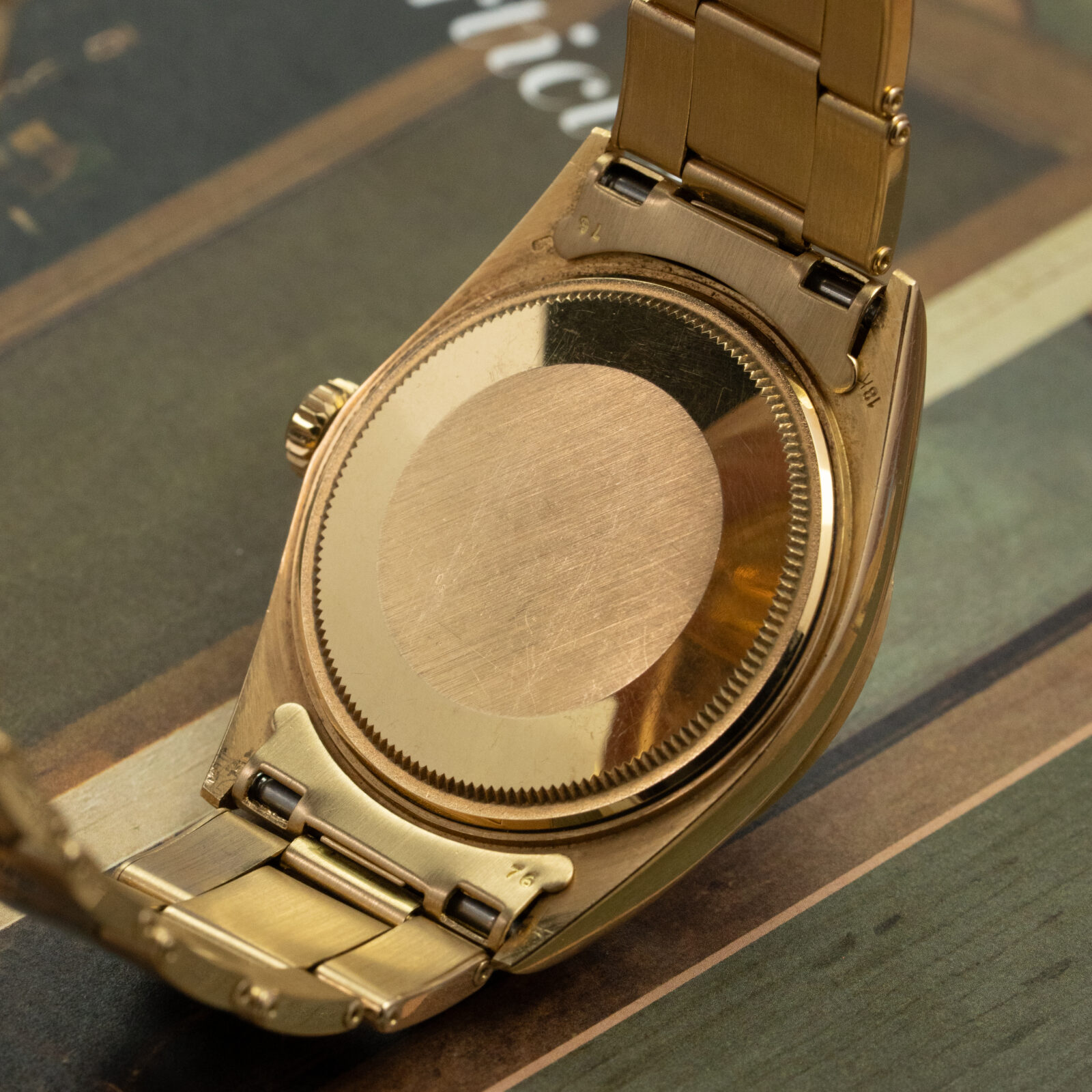 We’ve always appreciated the Day-Date for the sheer variety it offers, and this example is no exception. The smooth bezel is an uncommon yet elegant variation: subtle, refined, and slightly more understated than the classic fluted alternative. While the fluted bezel is most often paired with the iconic President bracelet, we believe the reference 1802 truly shines on an Oyster bracelet. Both the 18k yellow gold case and the riveted bracelet remain in impeccable condition, enhancing its overall presence.