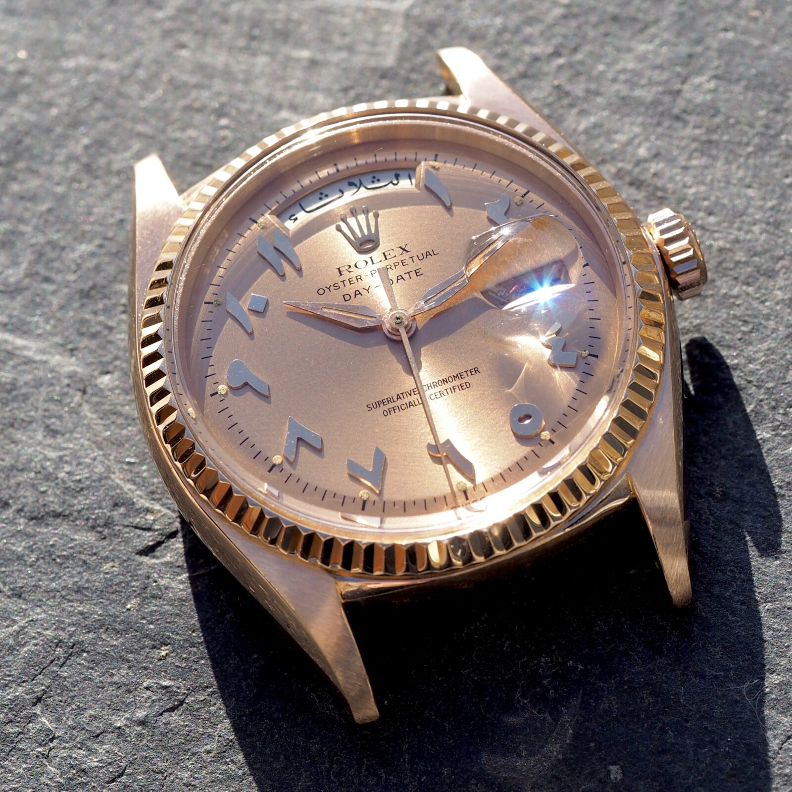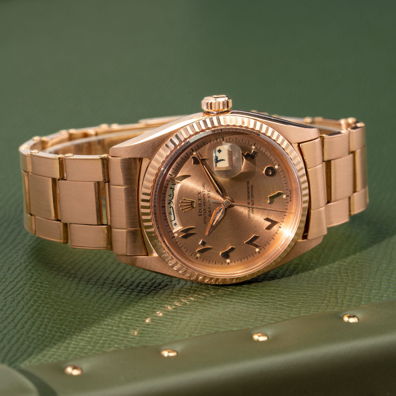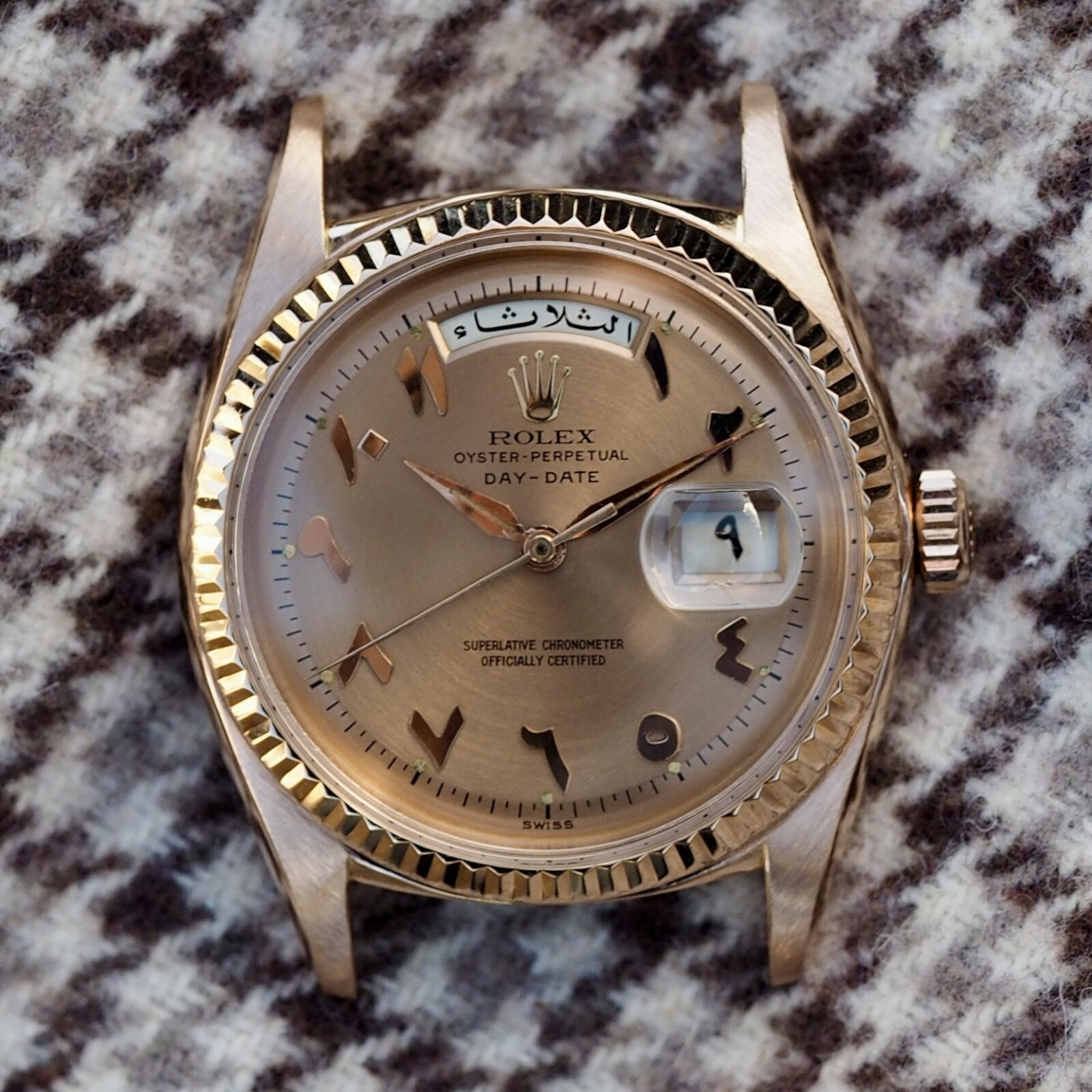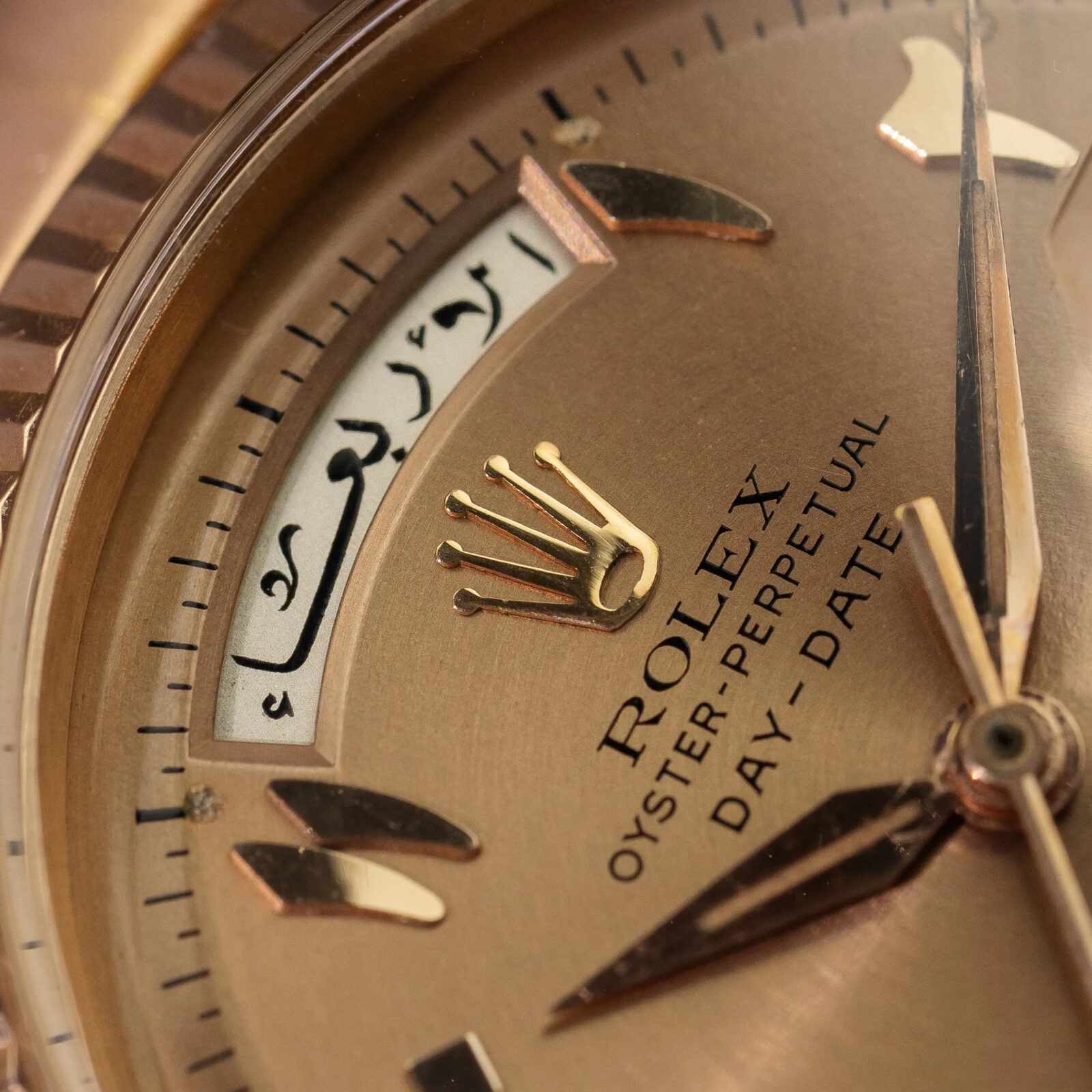 This exceptional iteration is truly one of the most desirable Day-Dates ever made. What makes it so special? Starting with the concentric circles on the dial, something you only see in the 60's. This rosé surface results in a spectacular look, especially then you play with the light a bit. This text lay-out, with the model name lower and a more stylised font, is only to be found in very early 18xx and late 66xx series; just like the leaf-shaped hands. To make it more special, Rolex applied 18k rose gold Eastern Arabic indices and matching Arabic day and date discs. Additionally it sports luminous plots, most of which are still in tact.