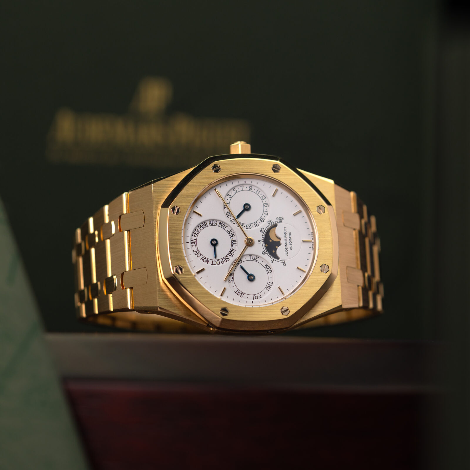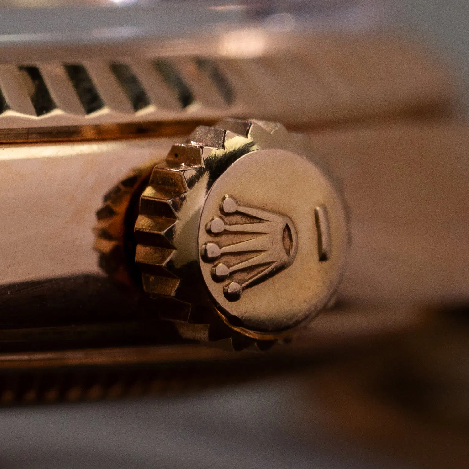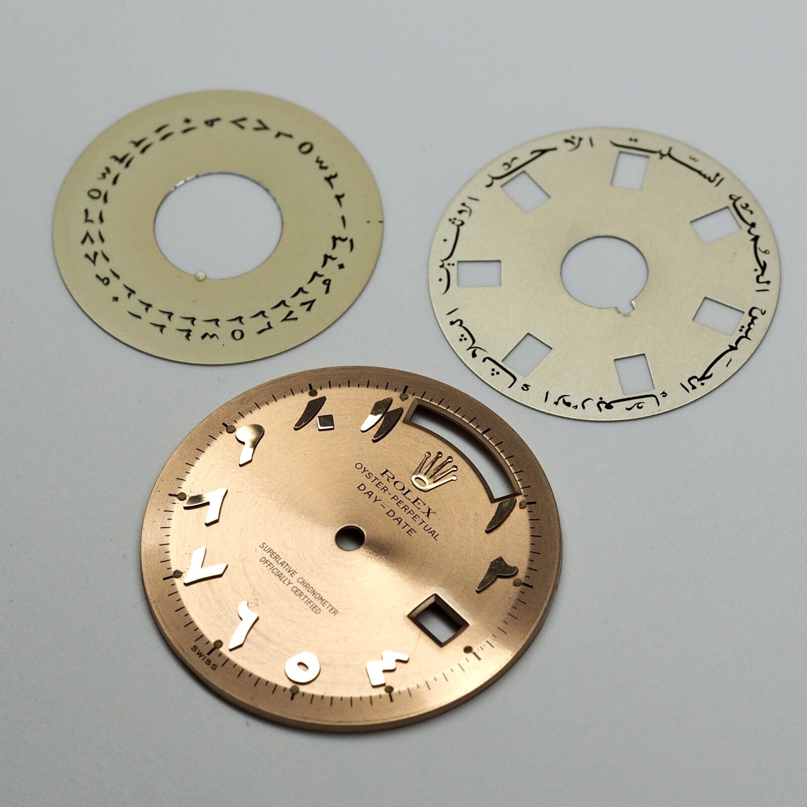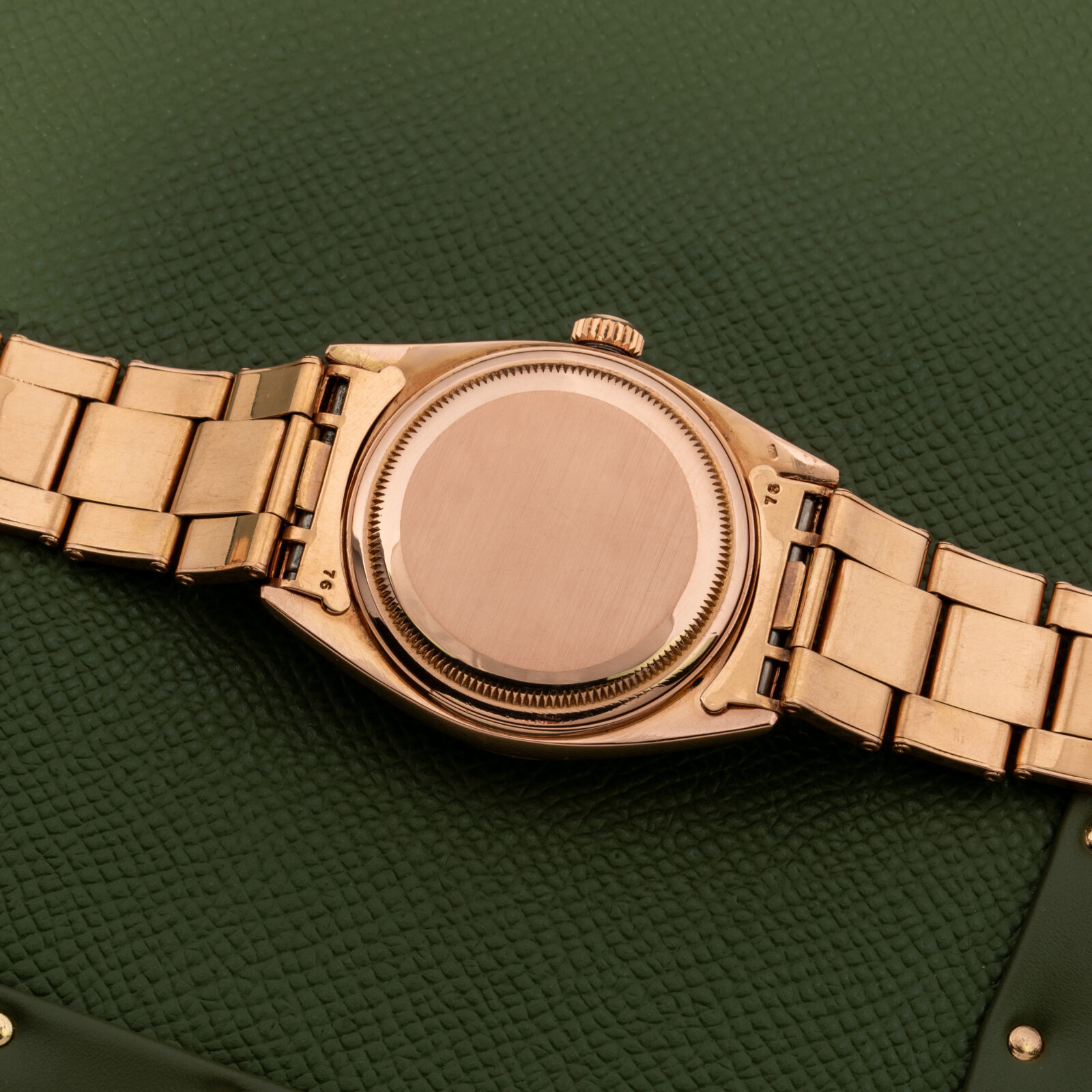This exceptional iteration is truly one of the most desirable Day-Dates ever made. What makes it so special? Starting with the concentric circles on the dial, something you only see in the 60's. This rosé surface results in a spectacular look, especially then you play with the light a bit. This text lay-out, with the model name lower and a more stylised font, is only to be found in very early 18xx and late 66xx series; just like the leaf-shaped hands. To make it more special, Rolex applied 18k rose gold Eastern Arabic indices and matching Arabic day and date discs. Additionally it sports luminous plots, most of which are still in tact.