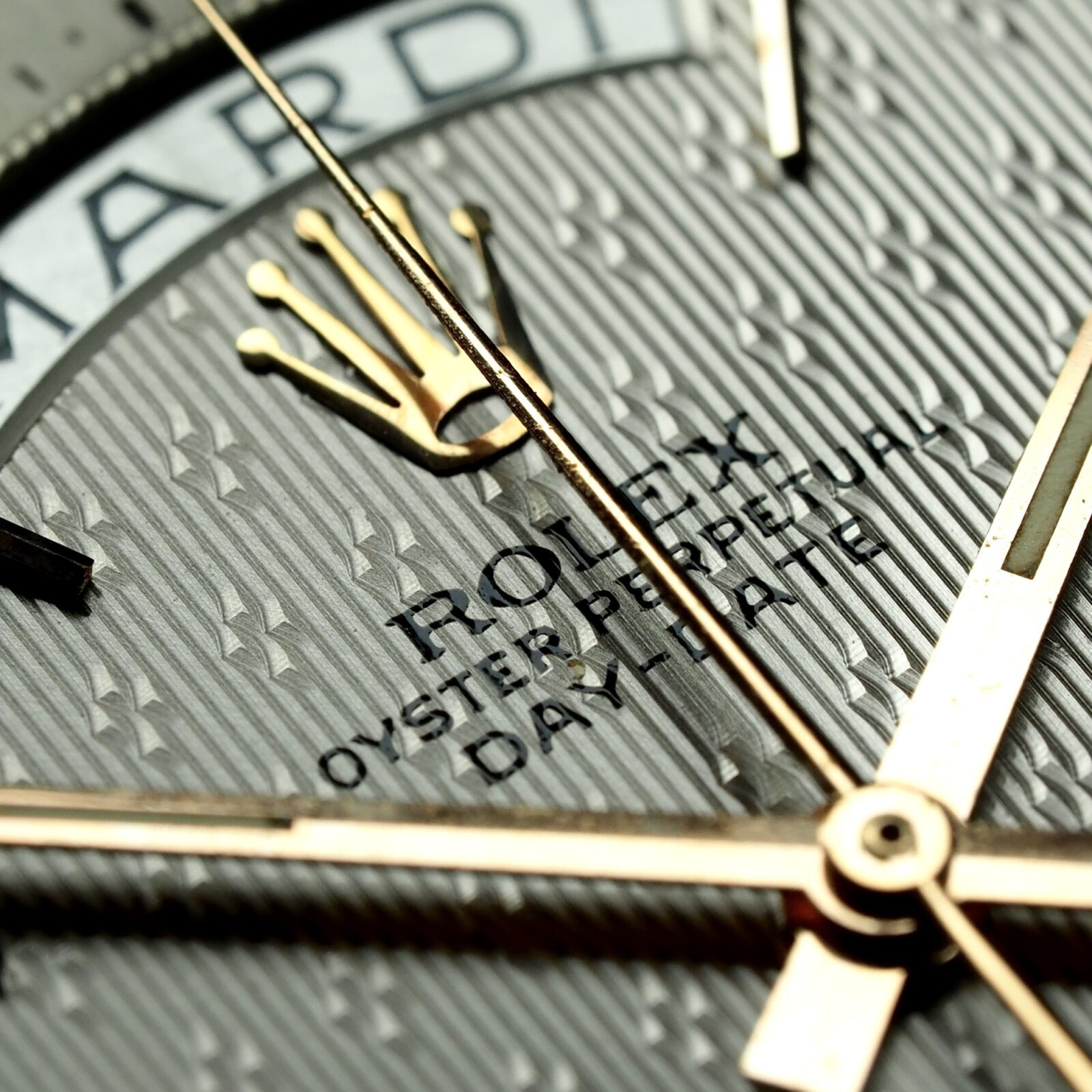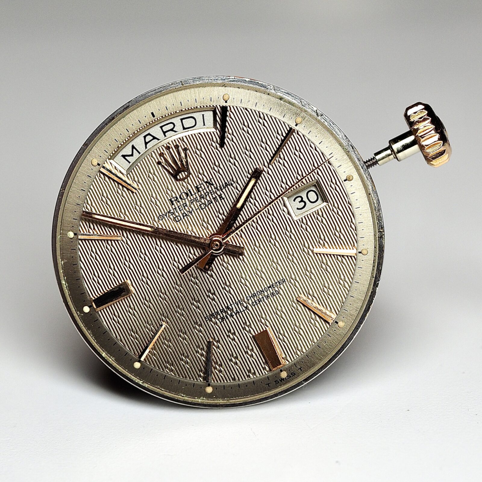 After concluding the case and bracelet are out of the ordinary, we take a look at the most important aspect: the dial. Occasionally seasoned Rolex collectors come across these artisanal and solid gold "pie-pan" dials that feature a guilloche pattern. Finding one of these always sparks enthusiasm and the way the lights plays with the surface is a lust to the eyes. The periphery of the dial does not carry this finish, but still sports all tritium lumeplots; perfectly aged. The lay-out features thicker "doorstop markers" at the 6 and 9 o'clock position, bringing perfect balance in combination with the date and day (in French) aperture.