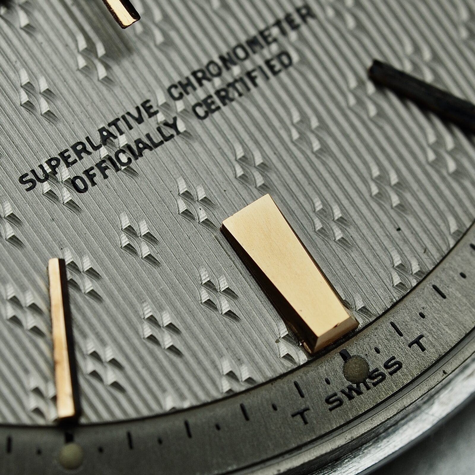 Eye-catching “doorstop-dial” with a charming guilloche pattern on the subtle grey surface; Implemented in a rare pinkgold 1803 with riveted Oyster bracelet!