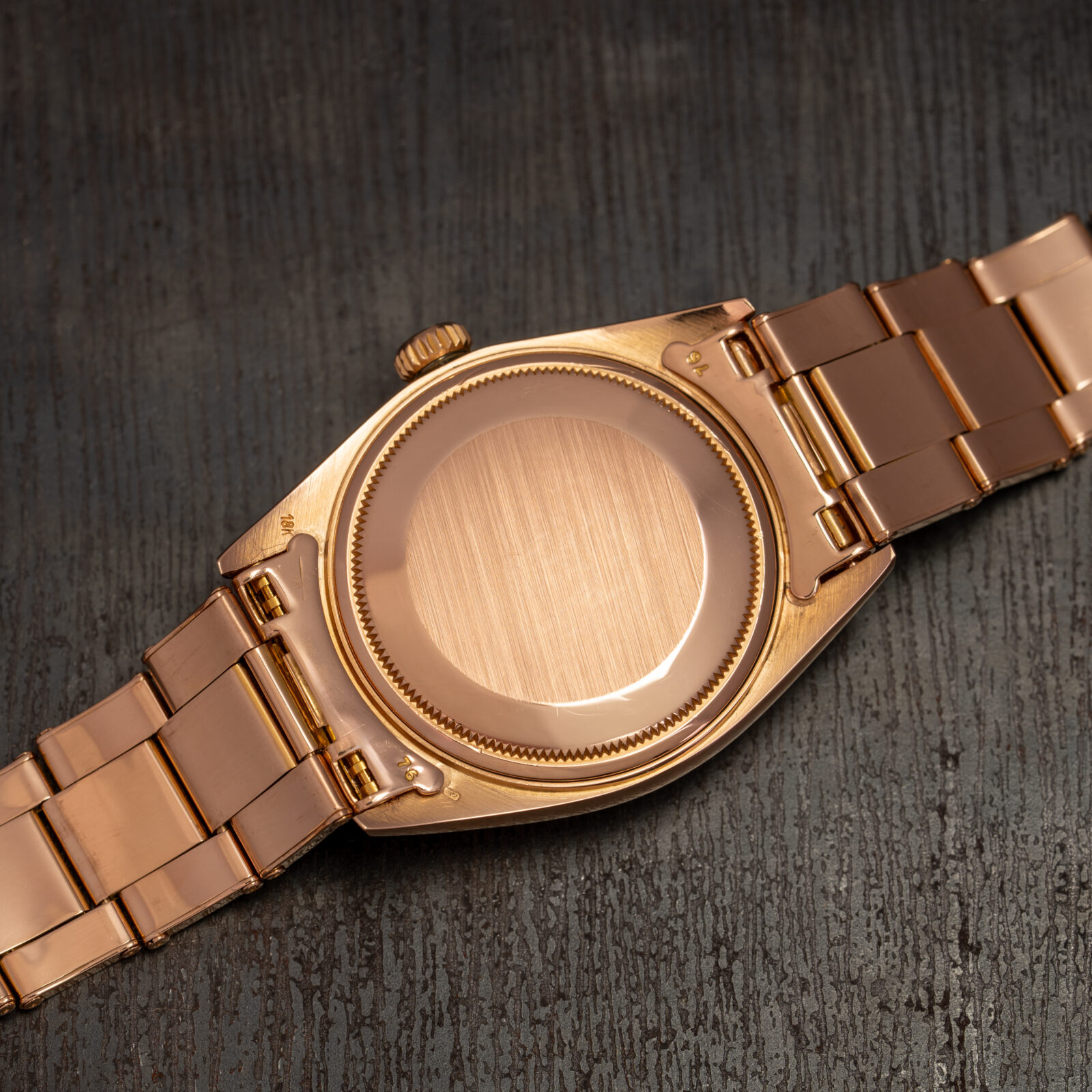 Let's start with the packaging of this Day-Date: the case and bracelet. Pink-gold has only been sparsely used by Rolex in the 60's and 70's and its rarity compared to yellow gold is probably thirtyfold. This rare metal 1803 (reference refers to the fluted bezel) is also paired with a more uncommon choice of bracelet: the riveted Oyster. Mostly reserved for steel toolwatches, it only occasionally finds its way to the flagship model.