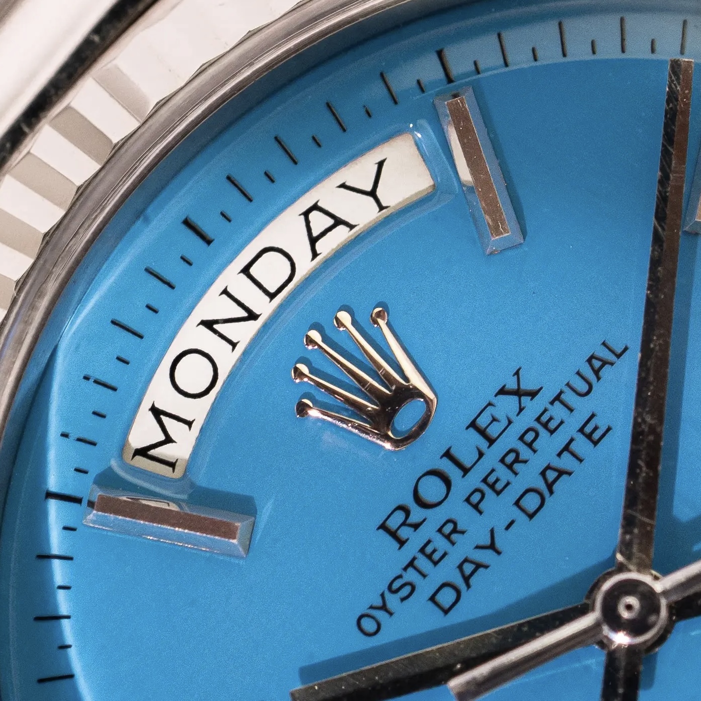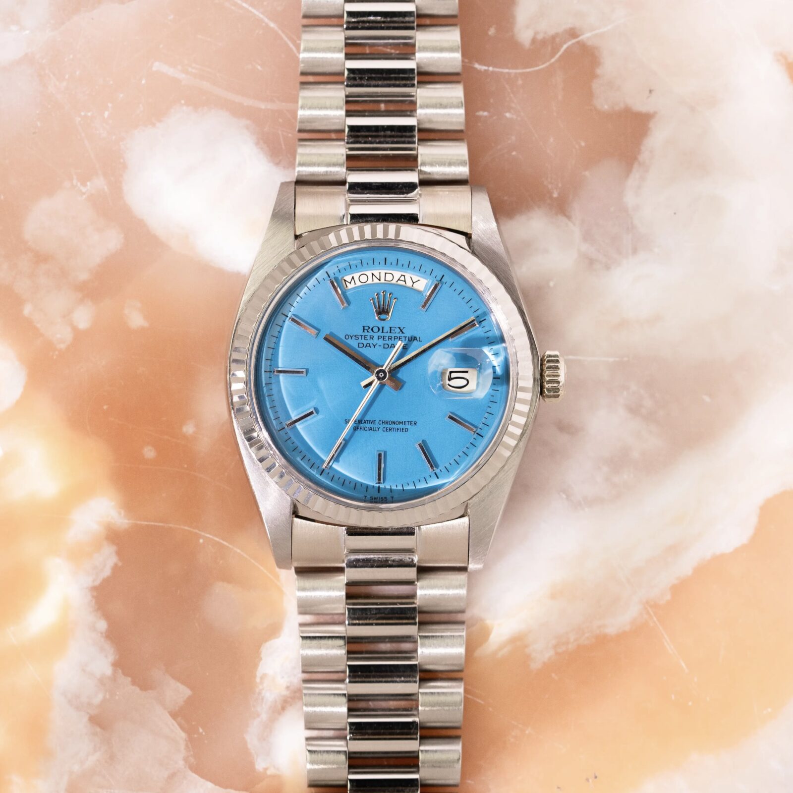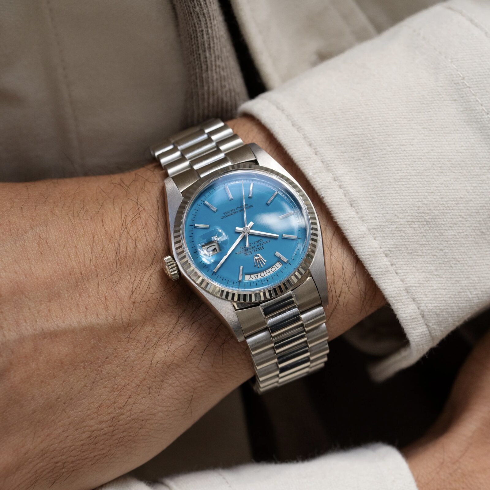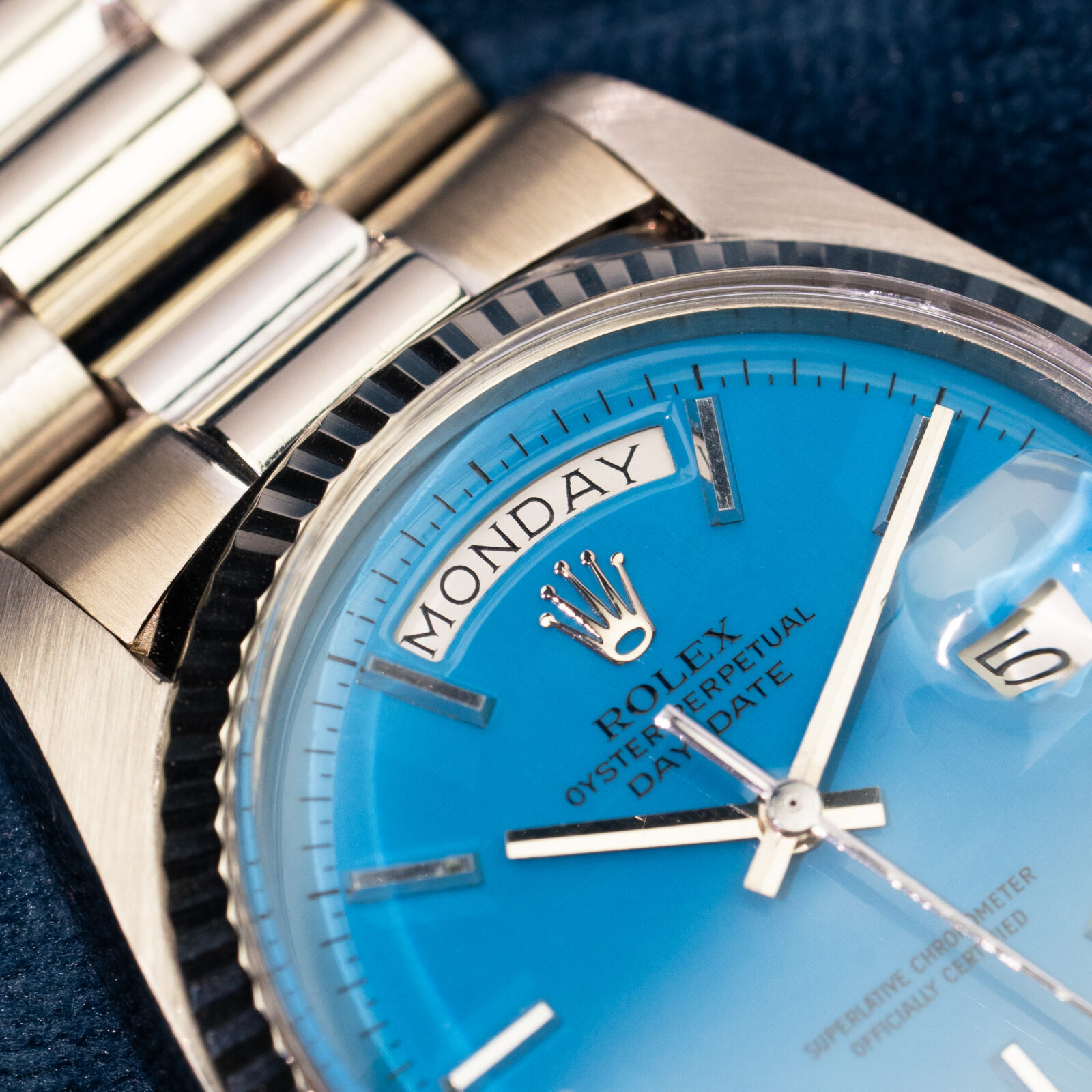 To truly grasp how special this configuration is, we must place ourselves in the period of time this watch was conceived; half a century ago. The Day-Date was known as the flagship model and -coming only in precious metal- the average price reflected the prestige. Naturally, most who gravitated towards this valuable line, chose a specimen to flaunt their wealth by opting for a yellow gold one (optionally with some gems too). The white metal executions fly way more under the radar and were by many mistaken as stainless steel Rolex'. The initial owner of this 1803 certainly was not bothered by this and went even a step further: a bright blue dial! To compensate, most Stella dials found In white metal Day-Dates have diamond markers and/ or a diamond bezel, this one is stealthier and sports regular applied baton indices.