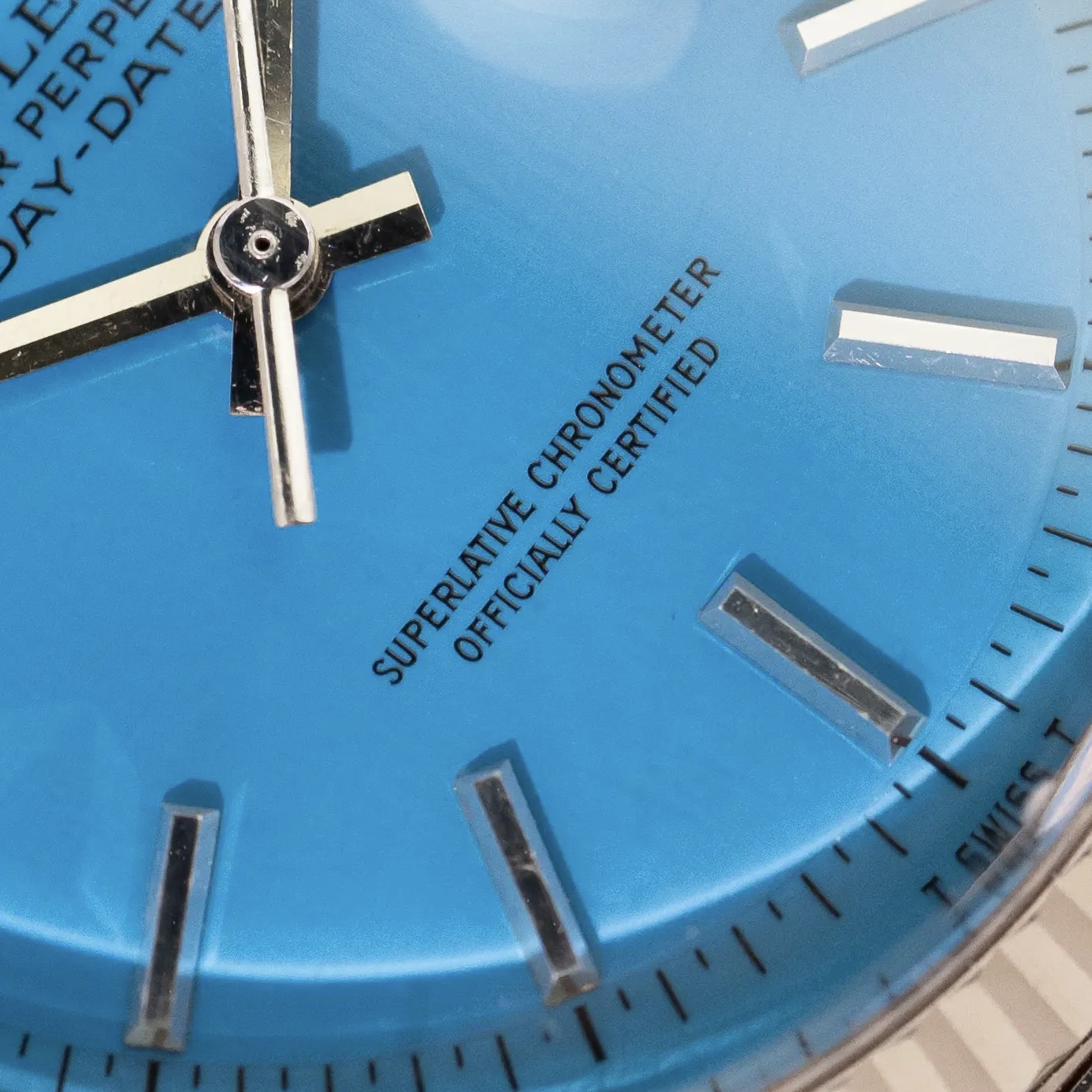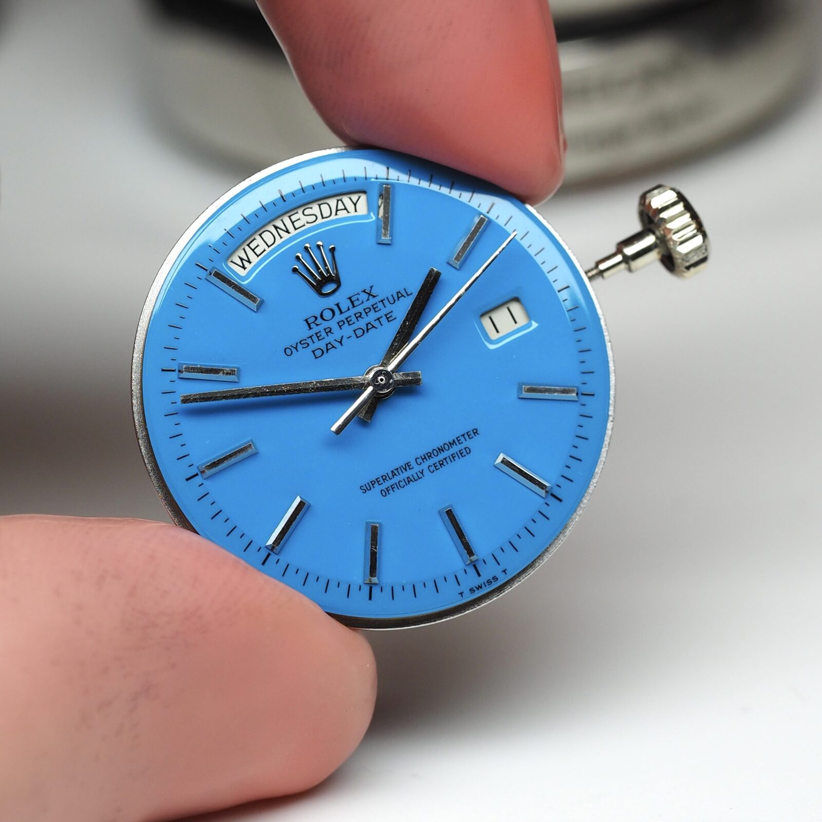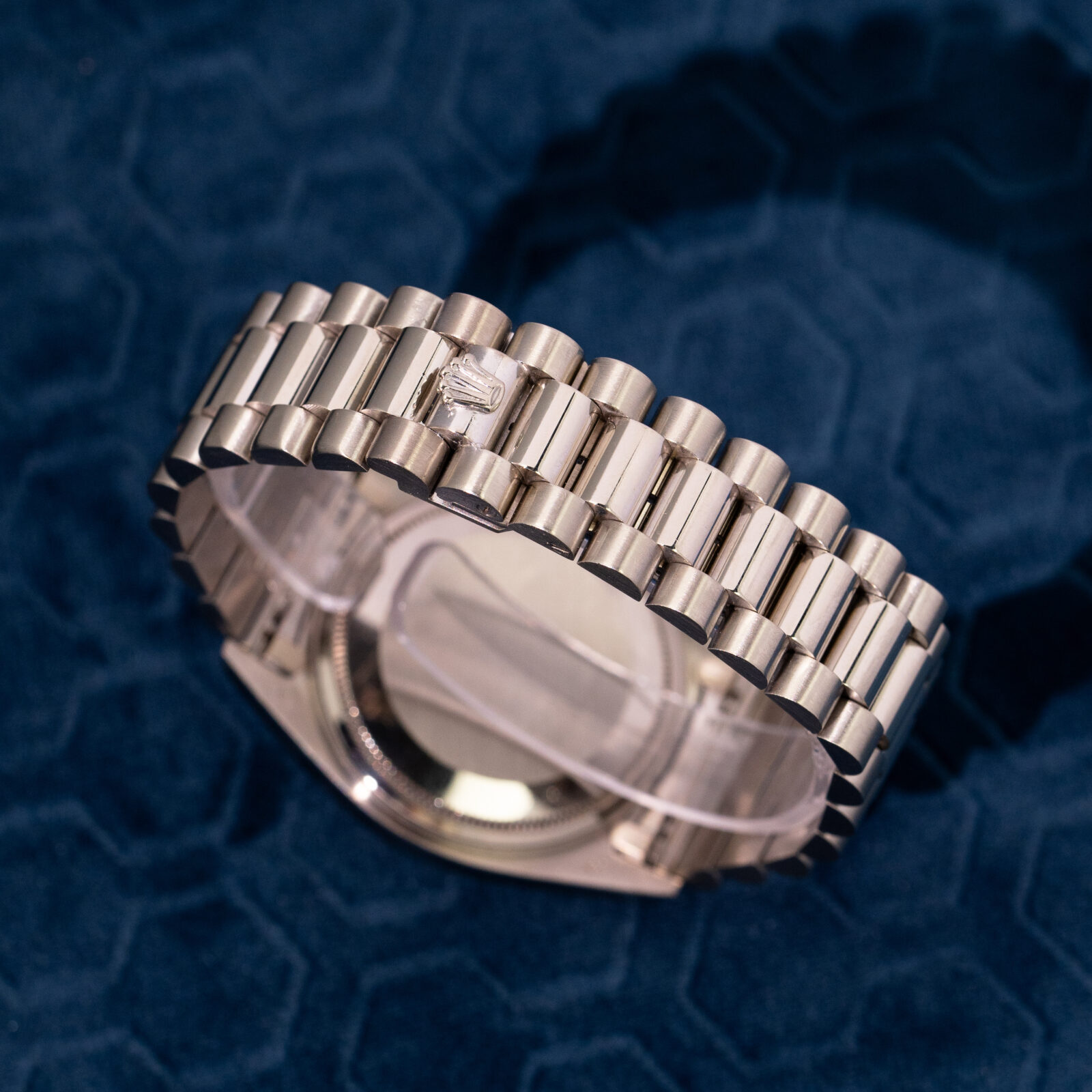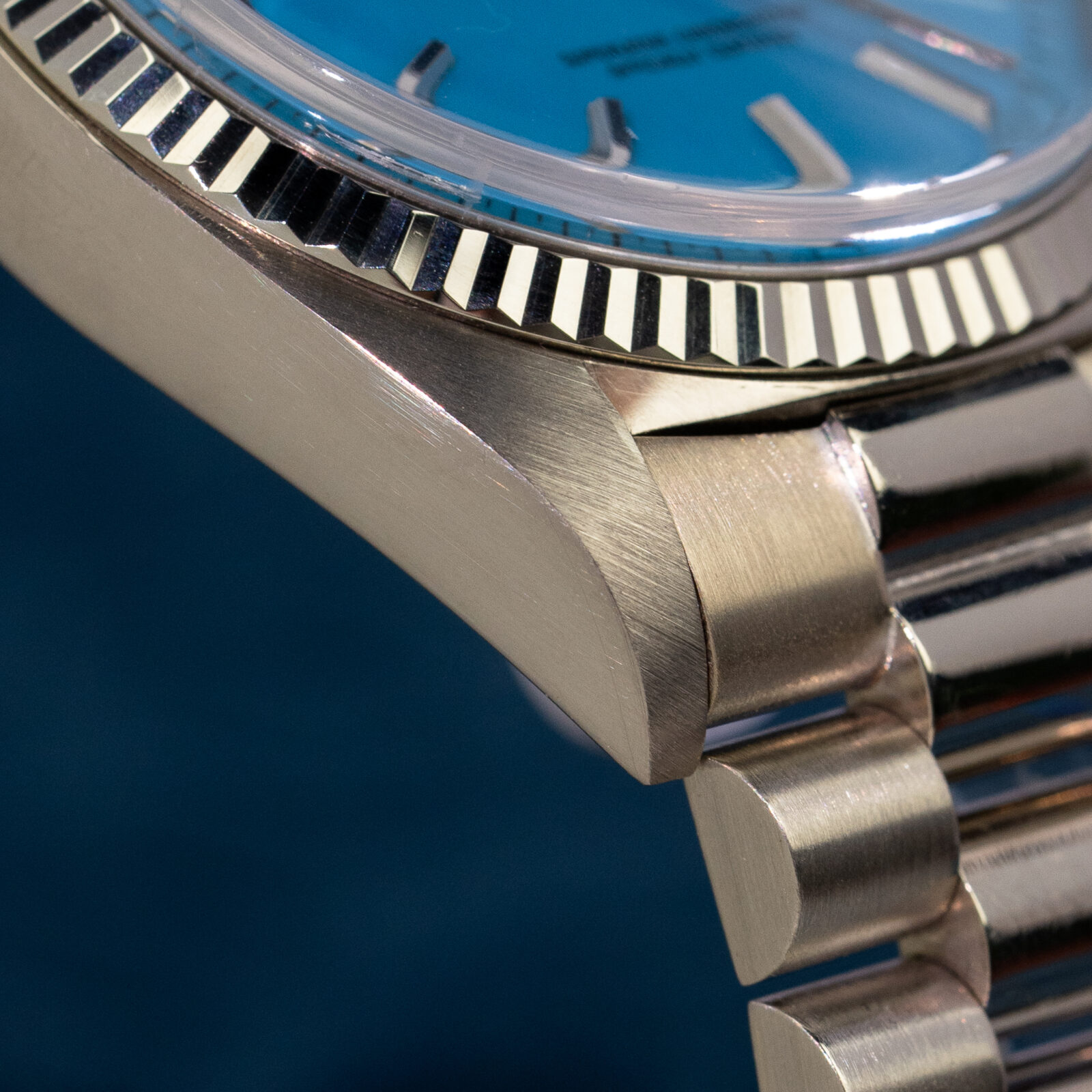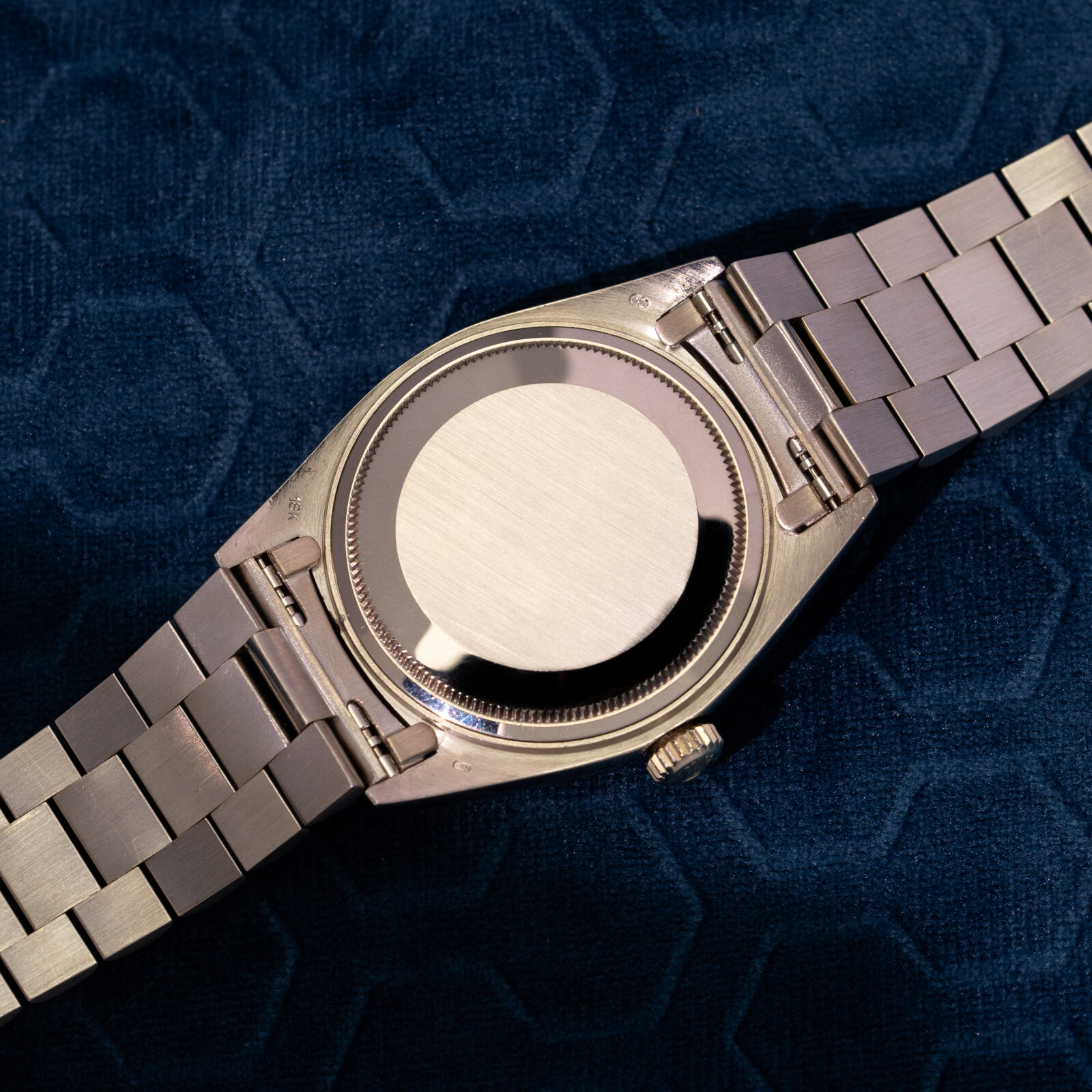 To truly grasp how special this configuration is, we must place ourselves in the period of time this watch was conceived; half a century ago. The Day-Date was known as the flagship model and -coming only in precious metal- the average price reflected the prestige. Naturally, most who gravitated towards this valuable line, chose a specimen to flaunt their wealth by opting for a yellow gold one (optionally with some gems too). The white metal executions fly way more under the radar and were by many mistaken as stainless steel Rolex'. The initial owner of this 1803 certainly was not bothered by this and went even a step further: a bright blue dial! To compensate, most Stella dials found In white metal Day-Dates have diamond markers and/ or a diamond bezel, this one is stealthier and sports regular applied baton indices.