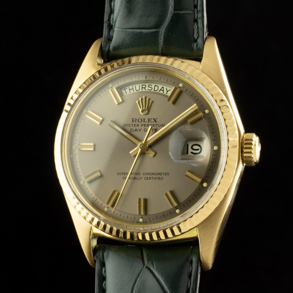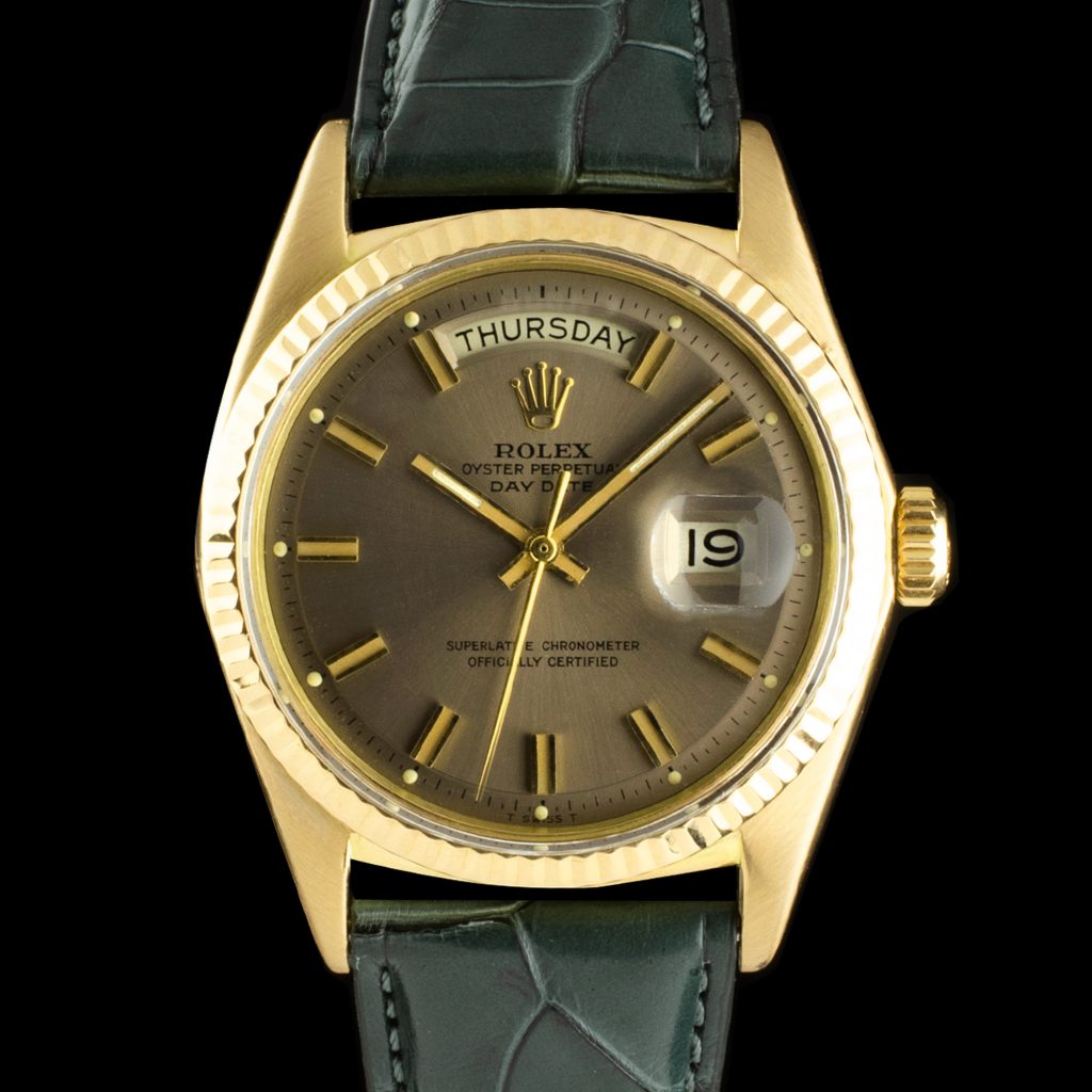 Rolex Day-DateThe very essence of luxurious time-keeping, provided with a day and date function. It was launched in 1956 as a niche model and was only produced in precious metals, the retail price was way costlier than previous models. However, due to its popularity among a lot of prestigious people (for example a lot of Presidents, hence its nickname/ bracelet name), it became Rolex’ flagship model.Over the years this model enjoyed associations with various ‘kinds of people’, from celebrities to Mafiosi (like Tony Soprano). They had all one thing in common: being successful in their area of expertise. To this day the Day-date is still synonymous with prestige and style. With exception of the most modern models the Day-Date comes in at 36mm. Do you earn this watch?REF. 18xxThe very first Day-Date references (65xx & 66xx) were replaced by the 18xx series in 1959 and a new era for the Day-Date begins. They 1530 cal. Improved to cal. 1555 or late cal. 1556. The dial colour and configuration varies. Characteristic for this era of production is the so-called ‘Pie-Pan’ dial where the dial looks like an upside-down pie-pan. (a concentric ring that slopes down from the flat centre). The series references do not indicate the material but the type of bezel or bezel/ case decoration: REF.1803, ‘Fluted’ bezel
