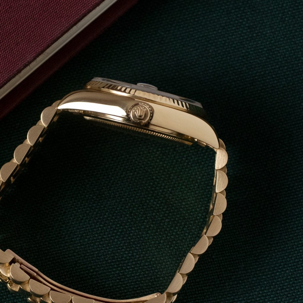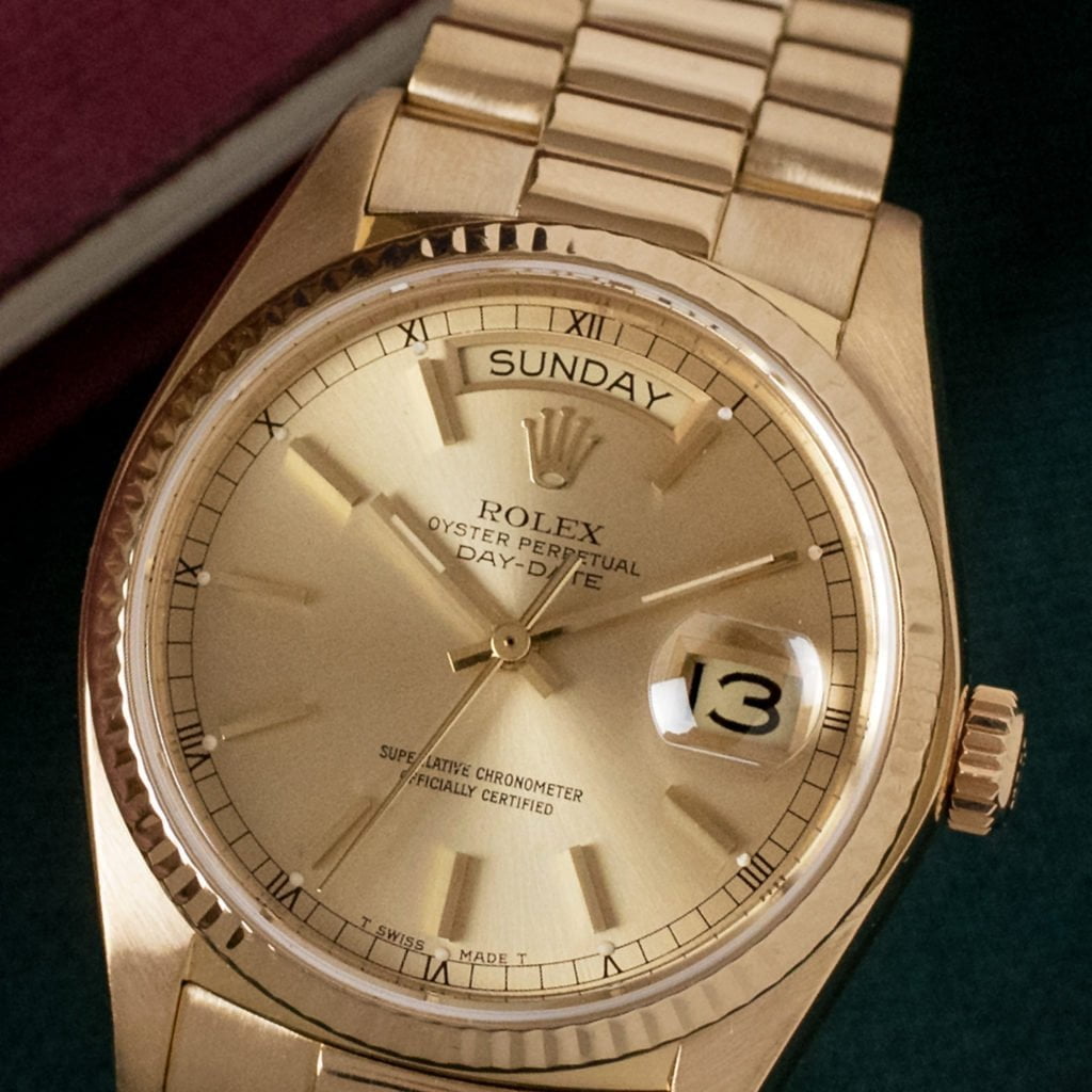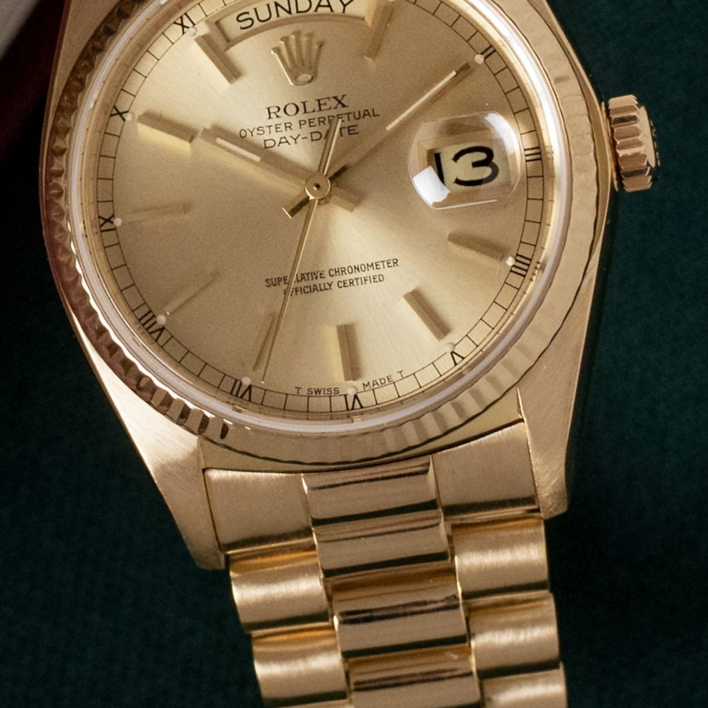 We're not going to bore you with the “Think of the watch that a president would wear…” story. We want you to think about Tony Soprano's watch. A watch that conveys status. A watch that commands respects. A watch that oozes luxury. And, granted, was associated with a few fictional murders.The Rolex Day-Date is a true pioneer: the first automatic, waterproof, chronometer wristwatch that indicated both the date and day of the week. The 18xxx series, introduced in 1978, is the fourth generation of Day-Dates. This ref. 18038 dates back to 1979 and houses Rolex’ caliber 3055 self-winding movement with a single-quickset function, allowing for the independent adjustment of the date discThe 36 mm case is executed in 18k yellow-gold and is in excellent condition. The iconic President bracelet with hidden folding clasp is in great condition as well, featuring little stretch. The watch comes with the classic champagne gold dial and an English day disc.