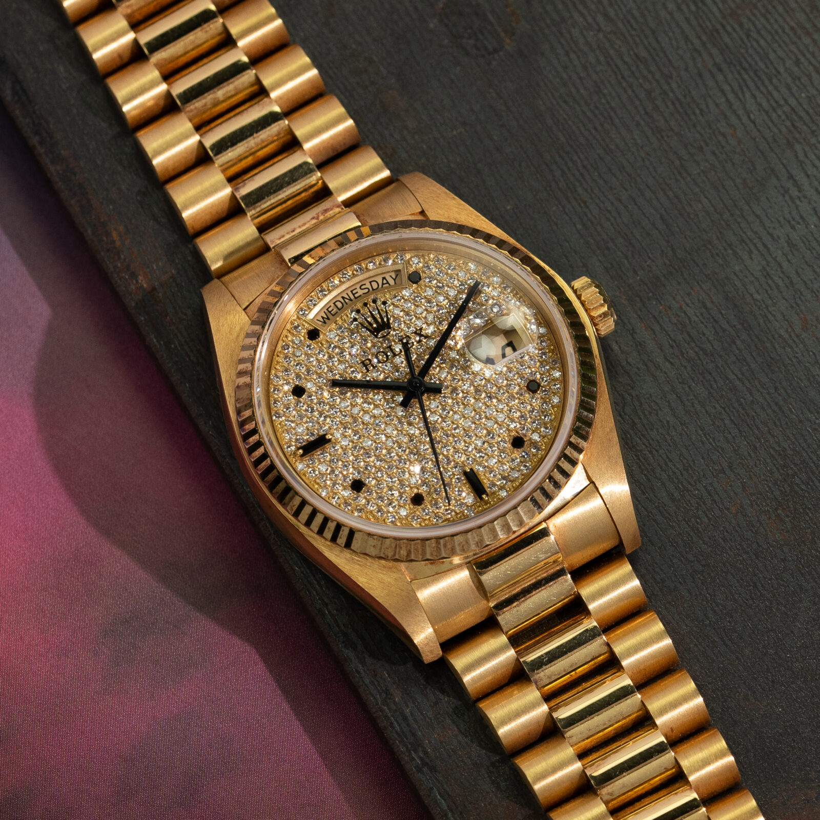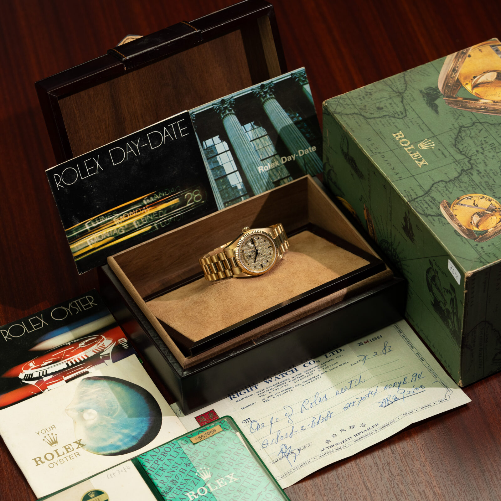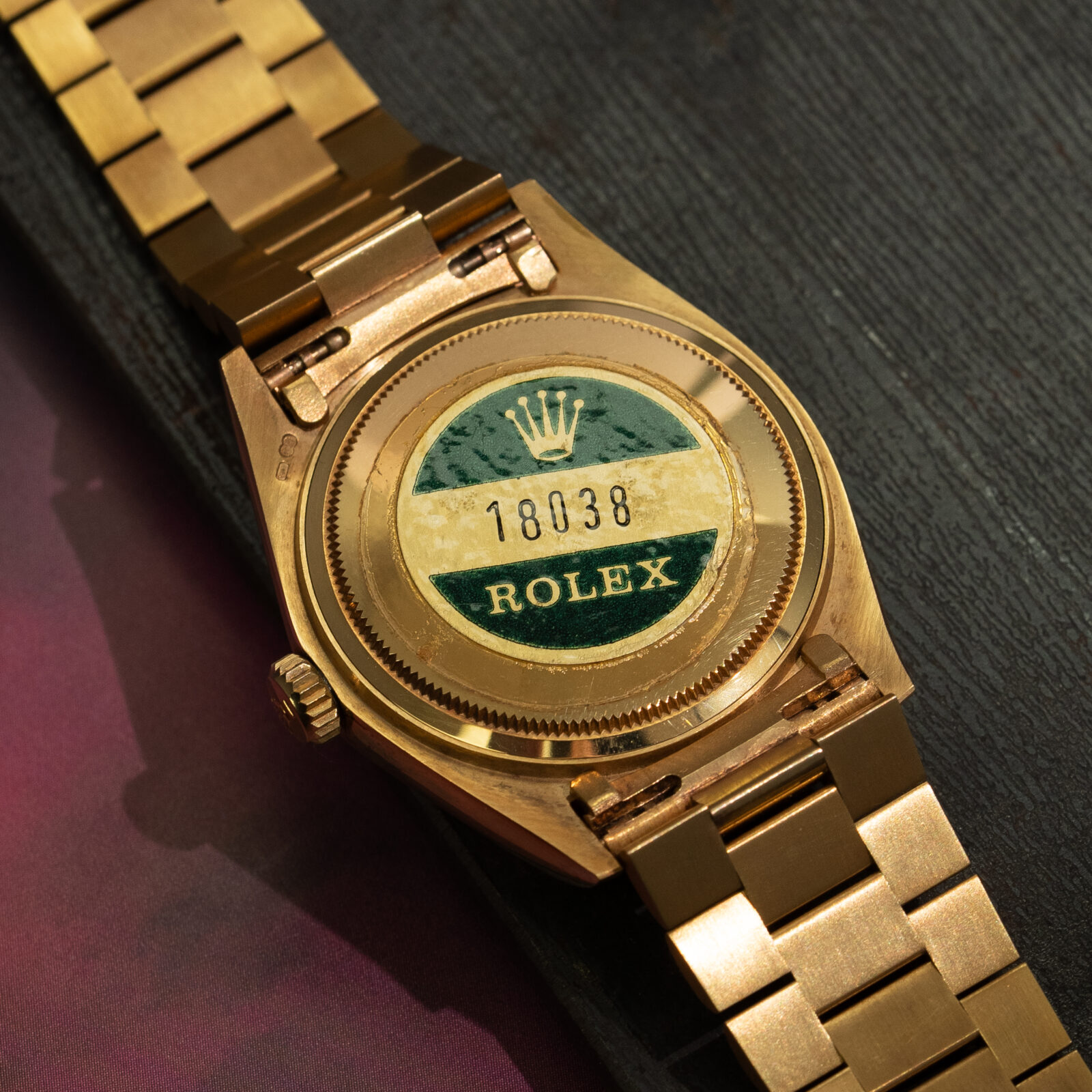 The Rolex Day-Date is a true pioneer: the first automatic, waterproof, chronometer wristwatch that indicated both the date and day of the week. The 18xxx series, introduced in 1978, is the fourth generation of Day-Dates. This ref. 18038 dates back to 1983 and houses Rolex’ caliber 3055 self-winding movement with a single quickset function, allowing for the independent adjustment of the date disc.